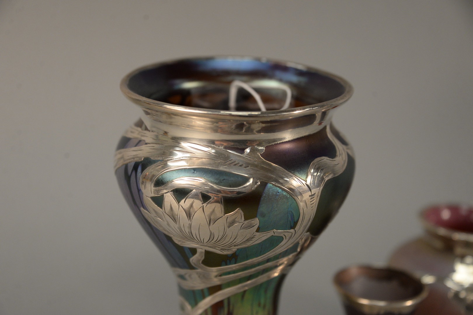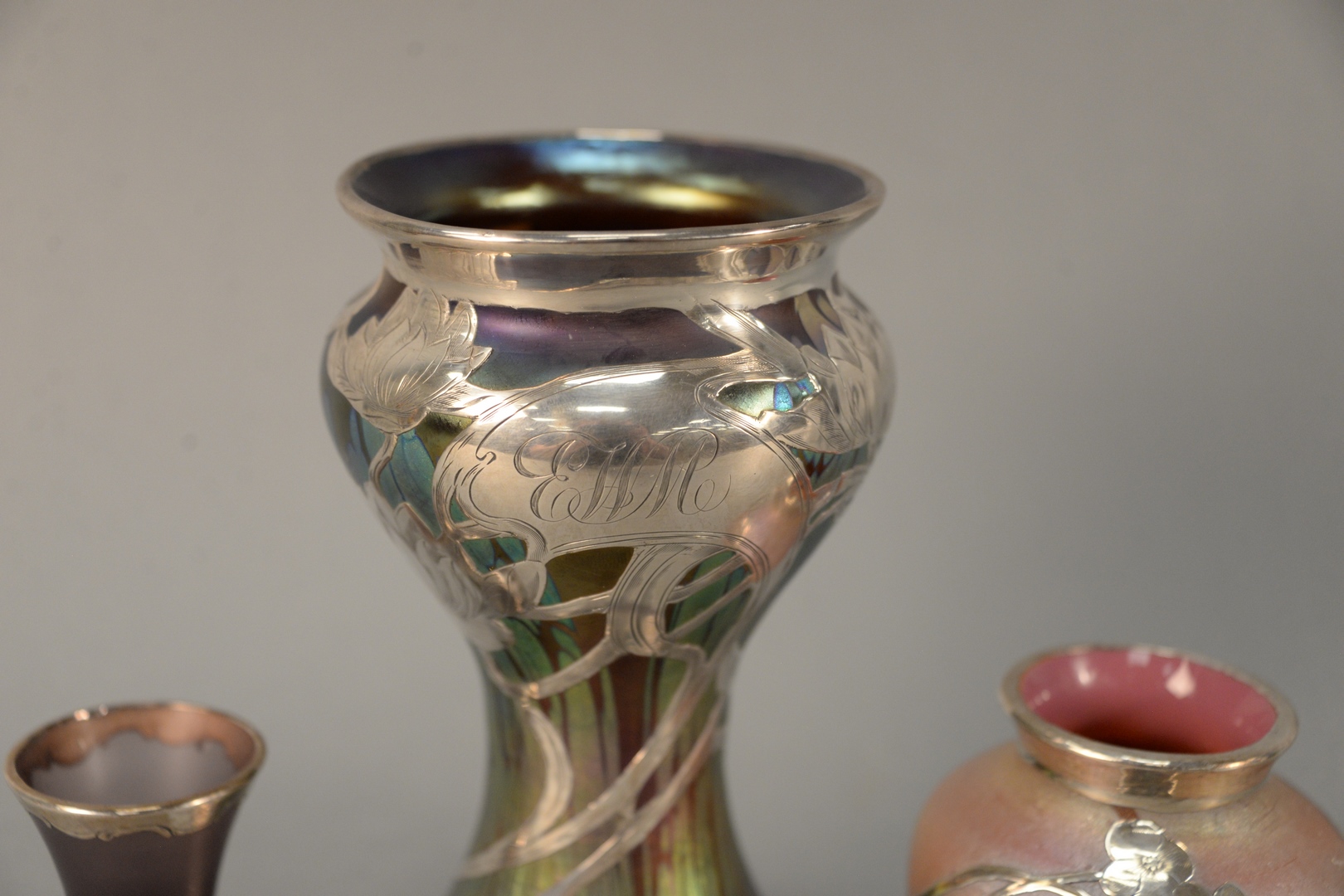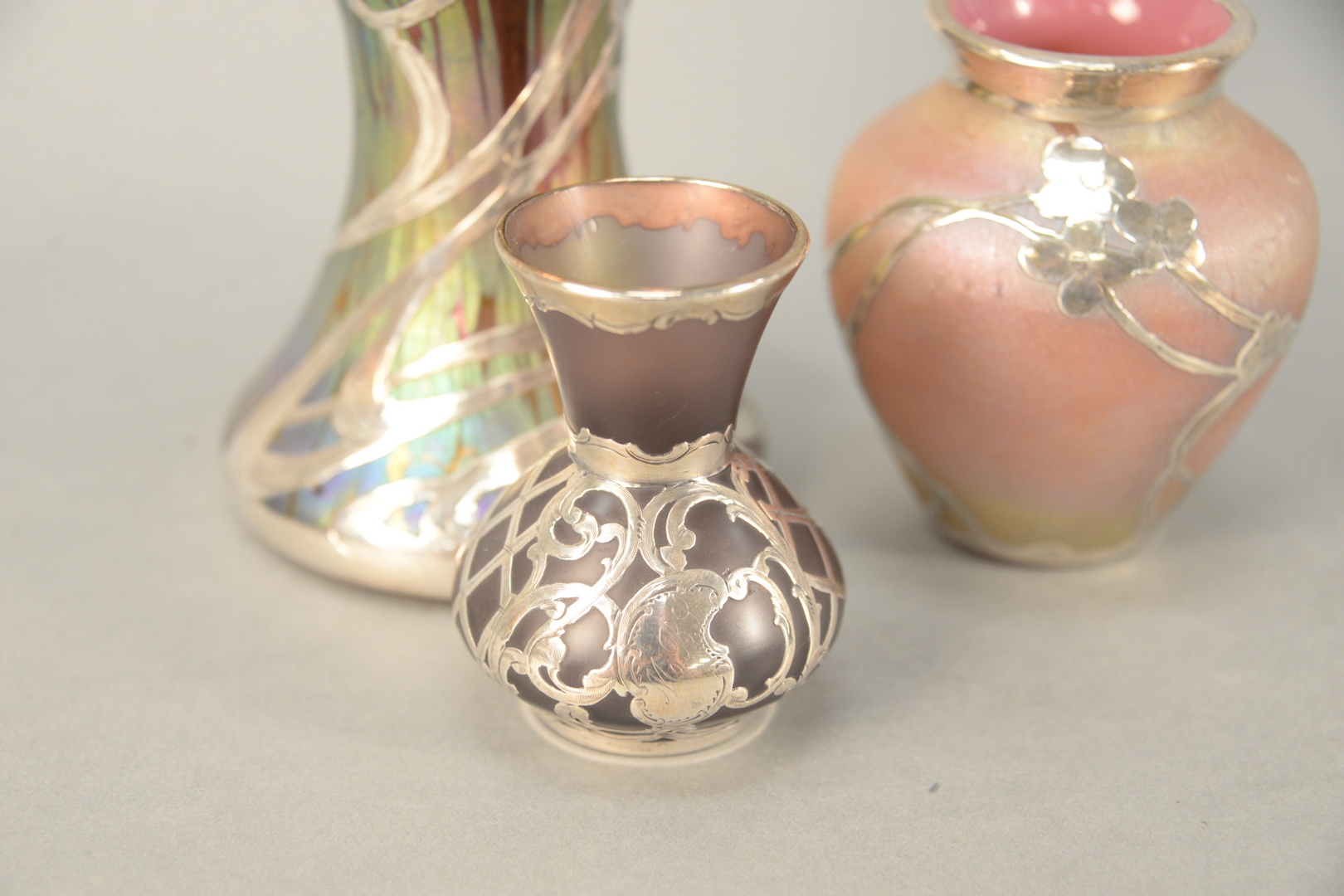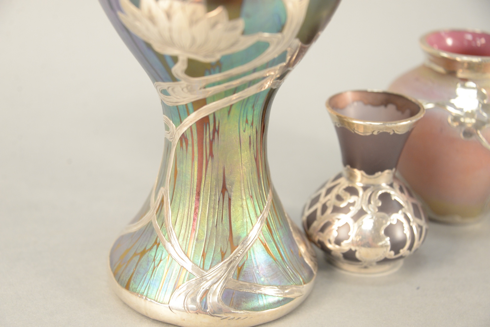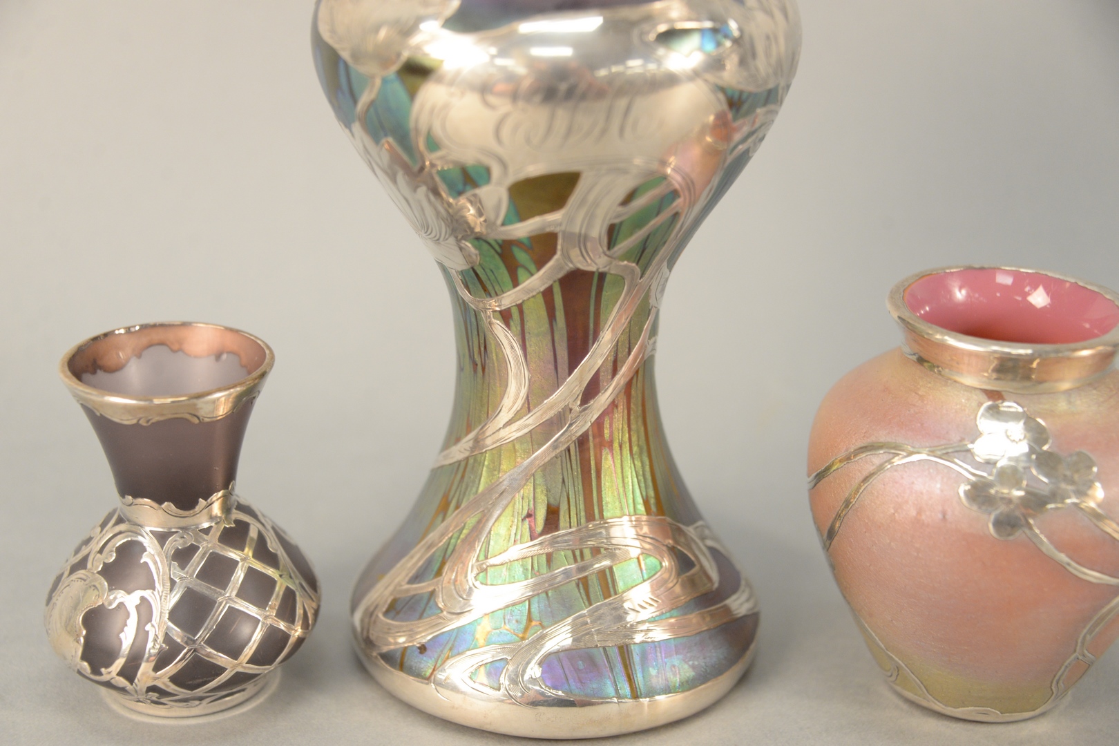 Lot 465: Three Art Glass Vases each having sterling silver overlay, amethyst bud vase, purple iridescent vase, and a larger iridescent vase w…