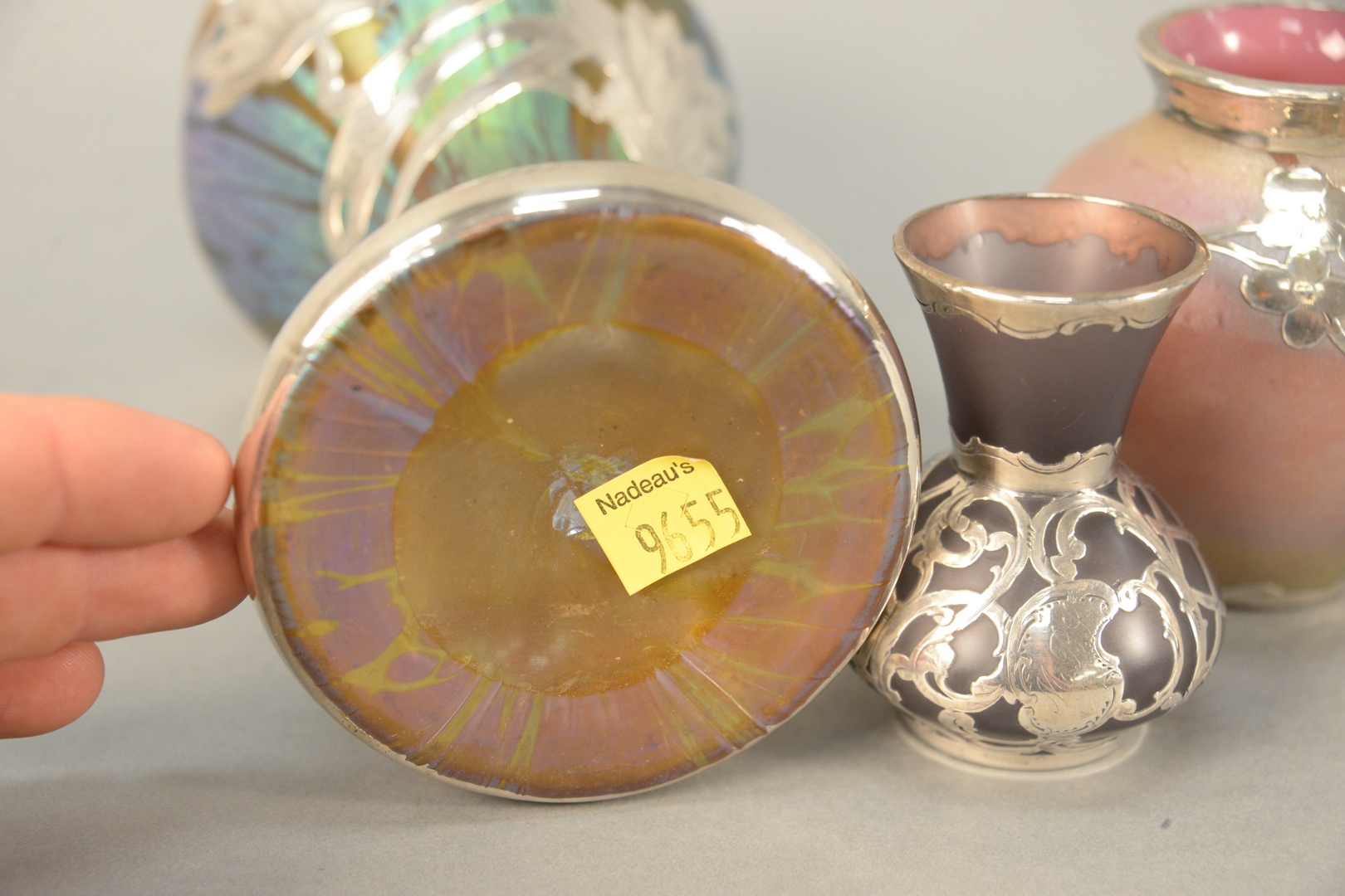 each having sterling silver overlay, amethyst bud vase, purple iridescent vase, and a larger iridescent vase with silver overlay flowers