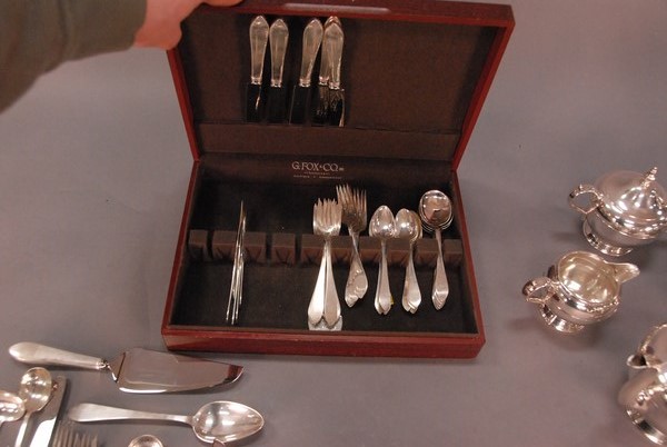 Lot 465: Tiffany sterling silver flatware set Faneuil pattern, setting for six, 50 total pieces, not monogrammed, 60.2 weighable t oz. plus eight handles