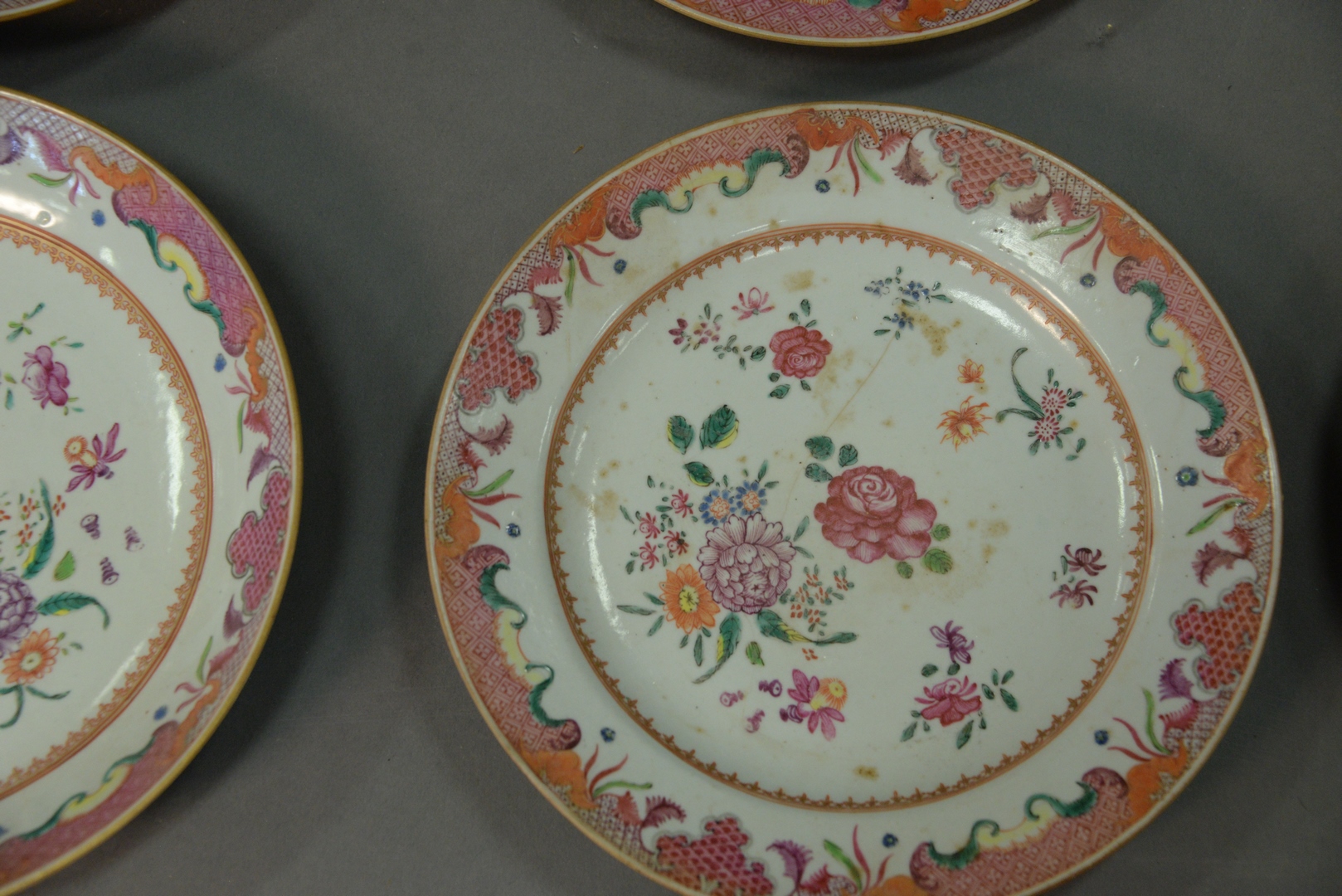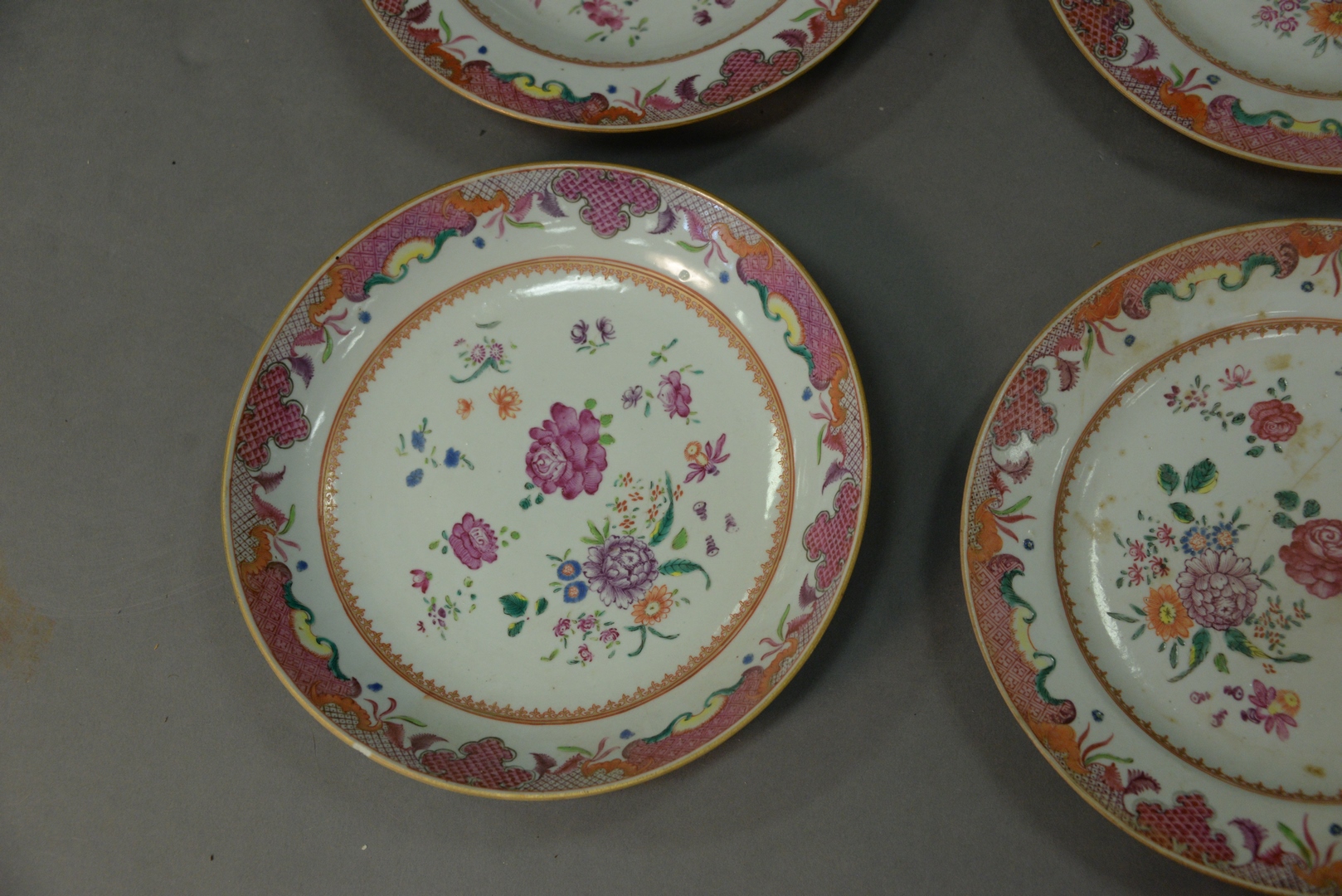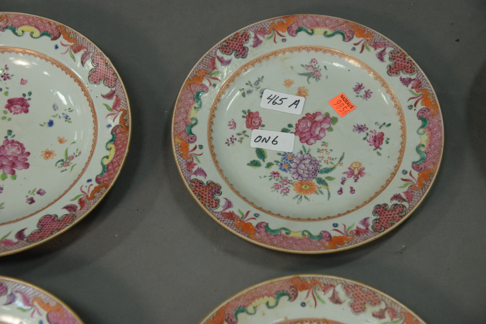 Lot 465A: Six Piece Lot Rose Famille to include, two plates and four bowls, three with hairline cracks, two with small edge chips, one bowl perfect, probably 18th century, diameter 9 1/4 inches.
