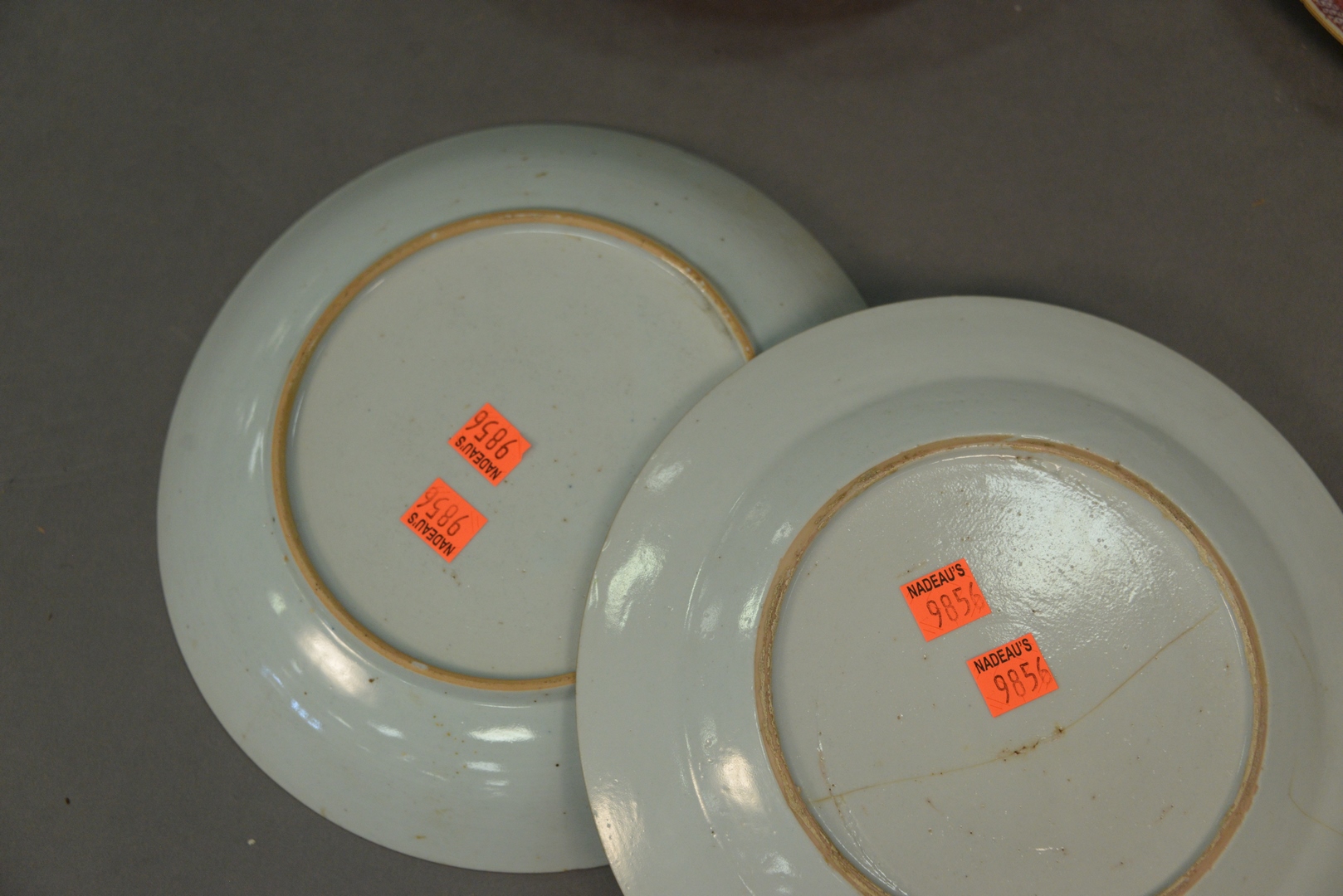 Six Piece Lot Rose Famille to include, two plates and four bowls, three with hairline cracks, two with small edge chips, one bowl perfect, probably 18th century, diameter 9 1/4 inches.