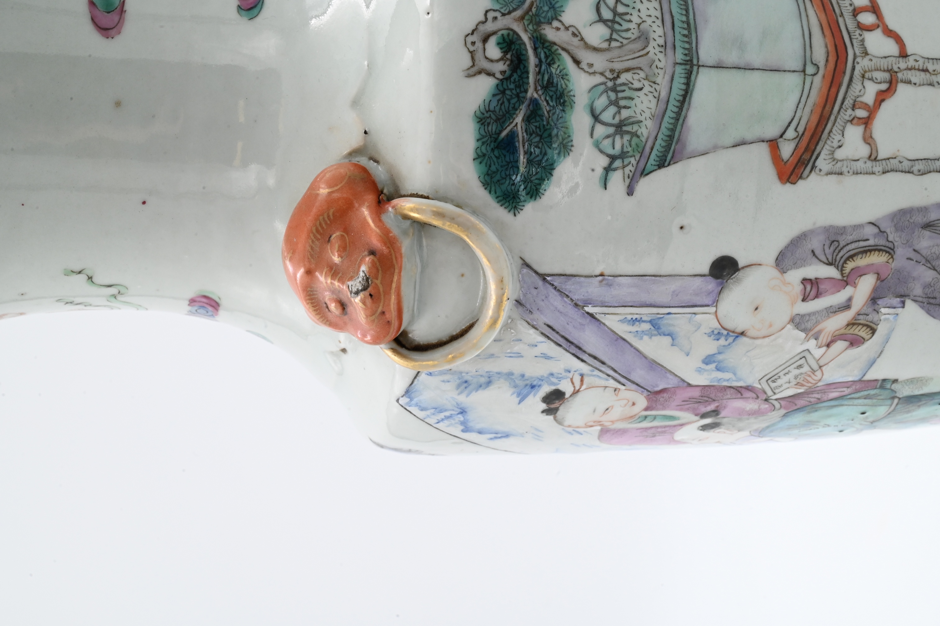 of baluster form and decorated with figures amidst garden accessories on a white ground, foo dog handles
