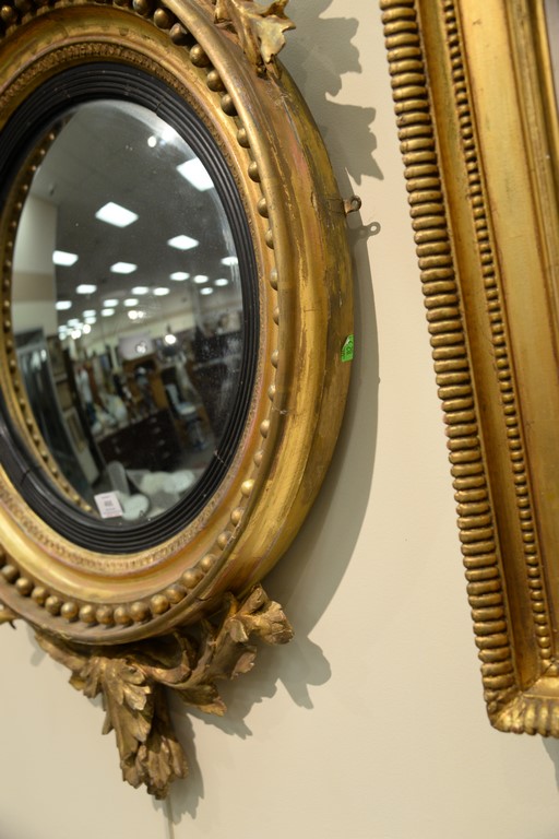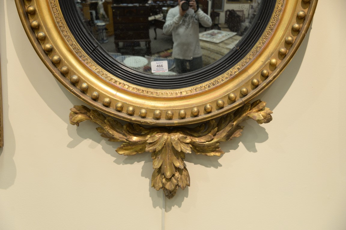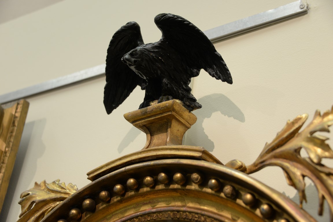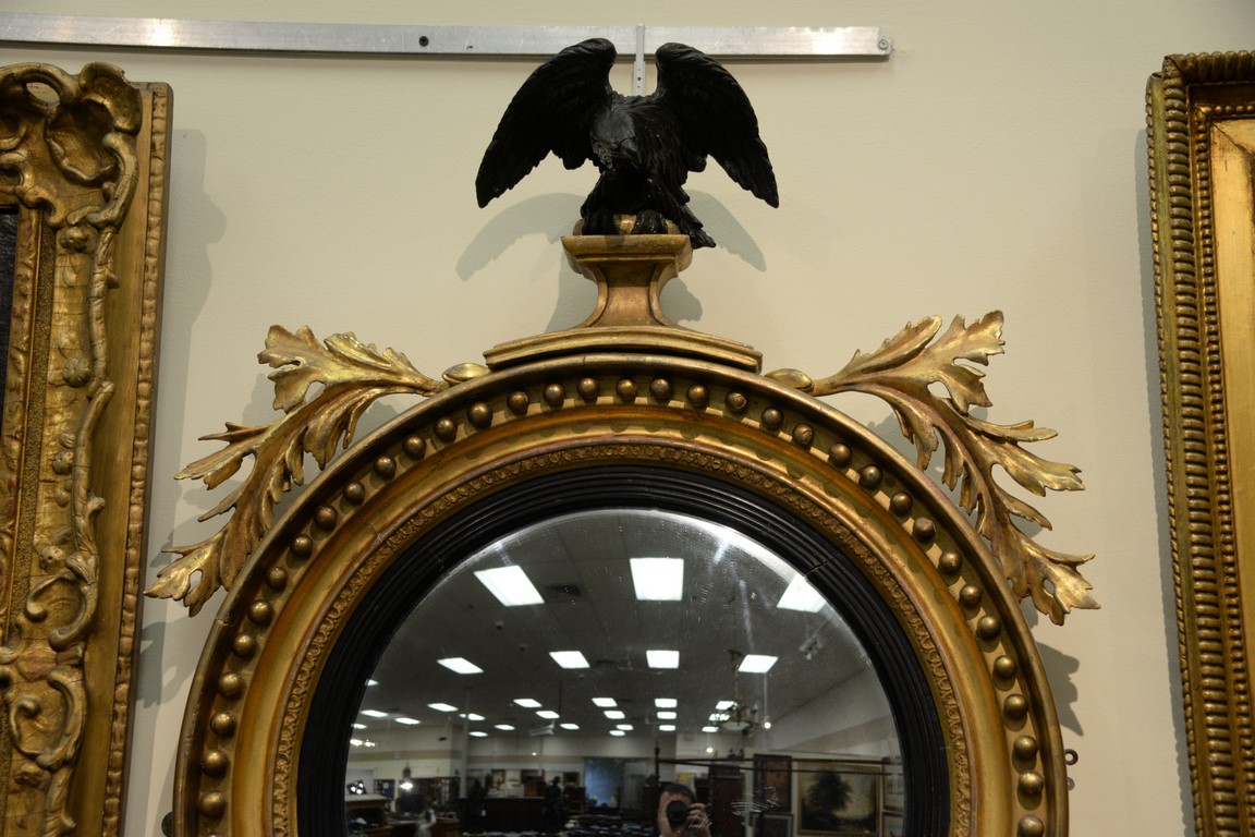 Lot 466: Federal gilt convex mirror with black eagle, early 19th century. height 43 inches