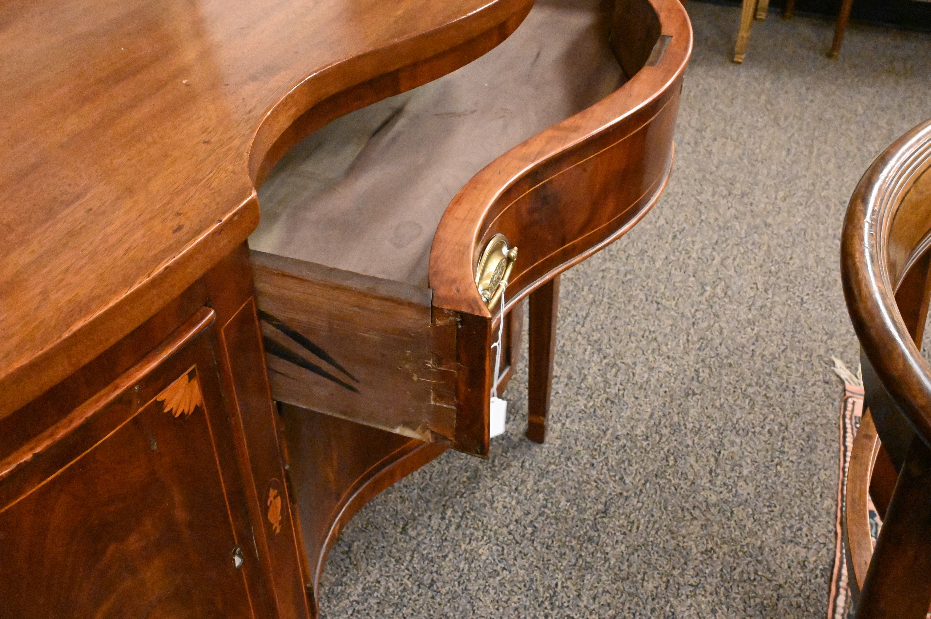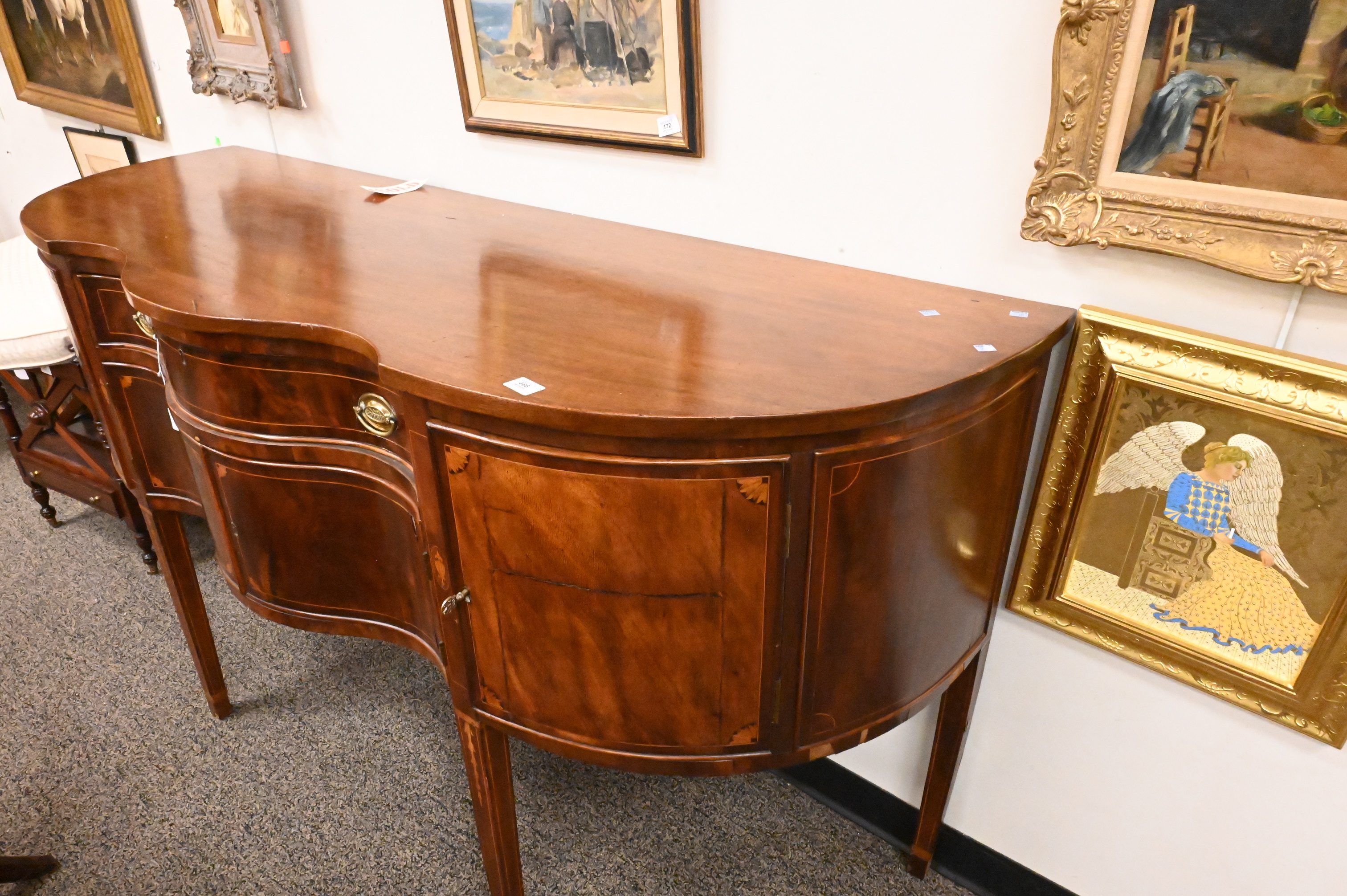 with serpentine front one drawer over two doors flanked by doors all on square tapered legs with bell flower inlays along with fans, partially made up of older elements