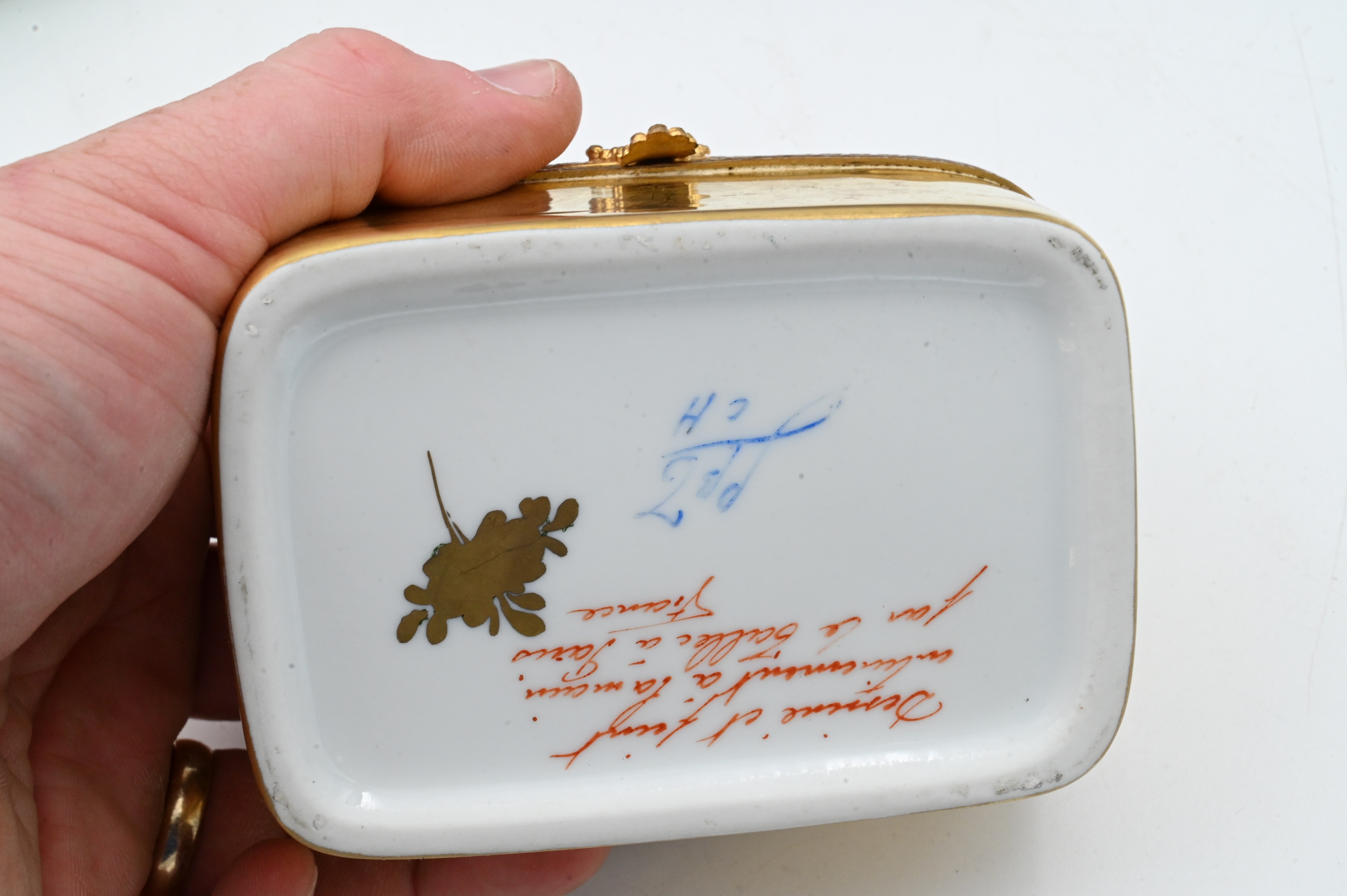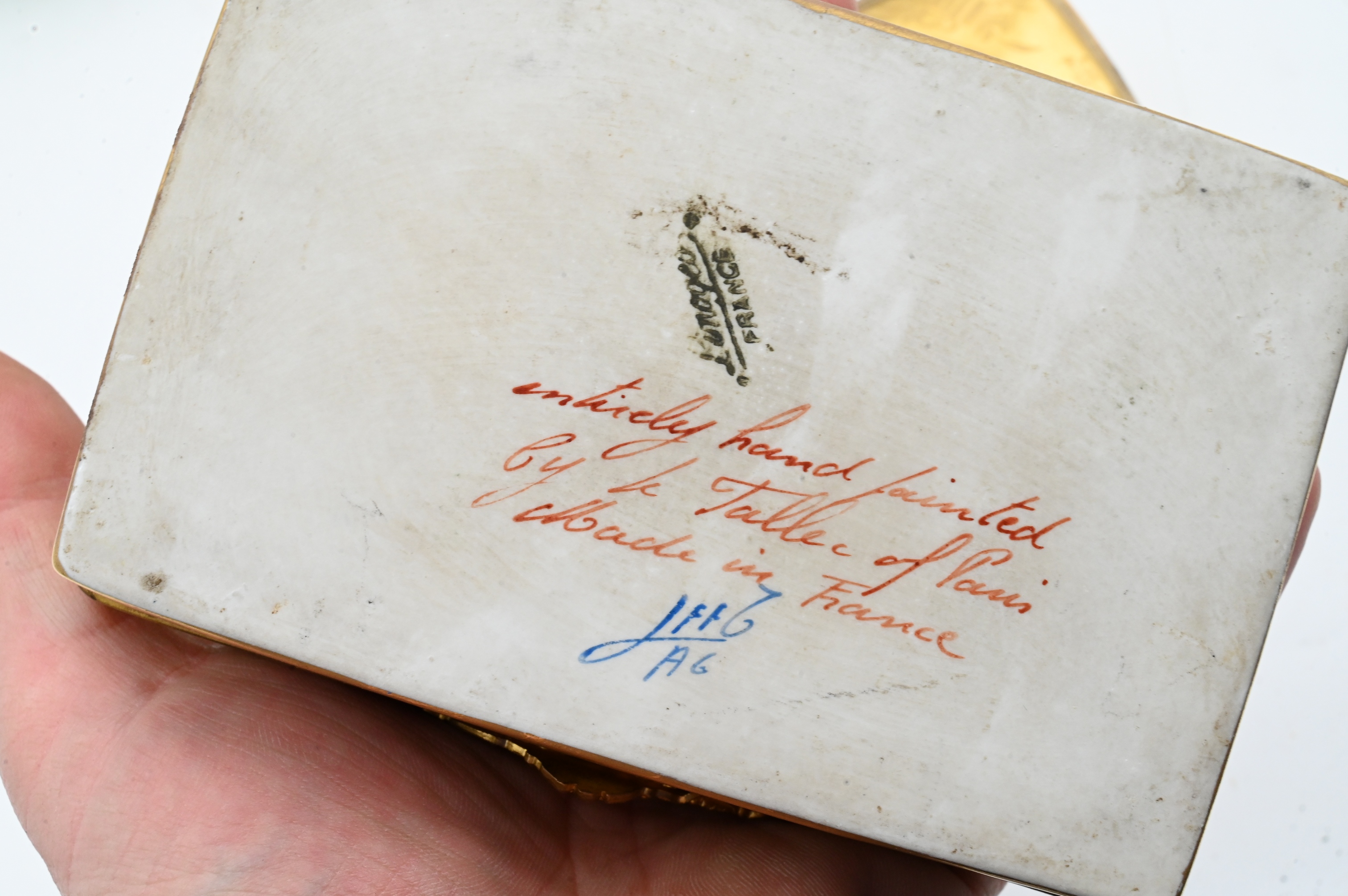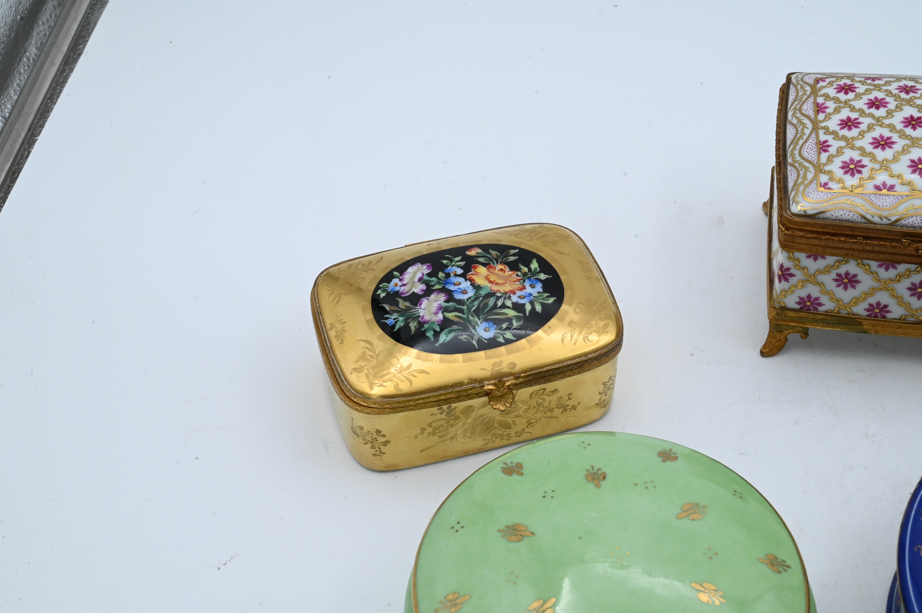 to include one Tiffany and Company round lidded box with blue and gilt floral design, one Tallec for Bonwit Teller round green lidded box, limoges hinged box with hand painted hot air balloon scene, one pink flower and gilt raised on ornate feet along with heavy gilt and floral in original box, each marked on underside