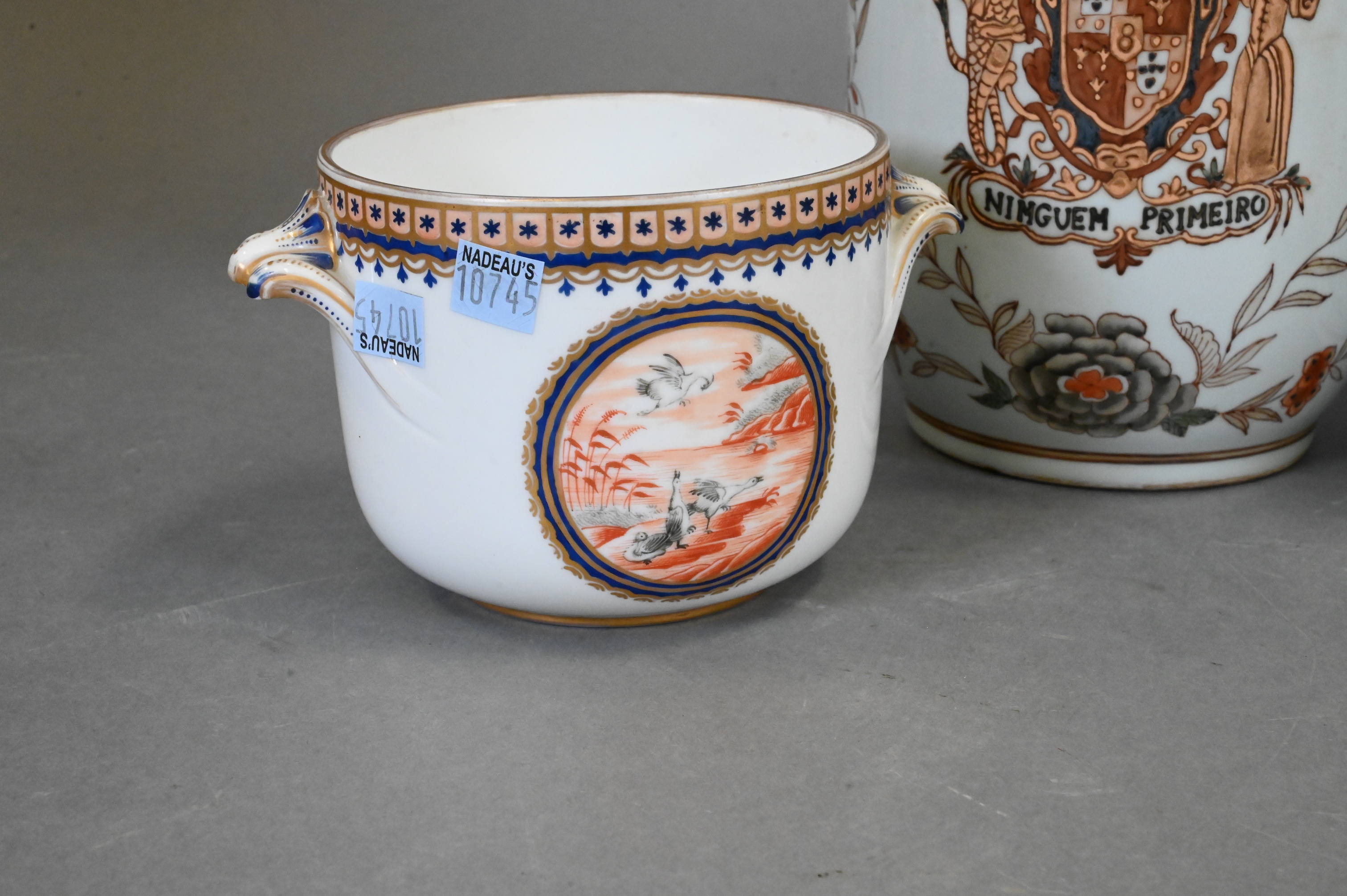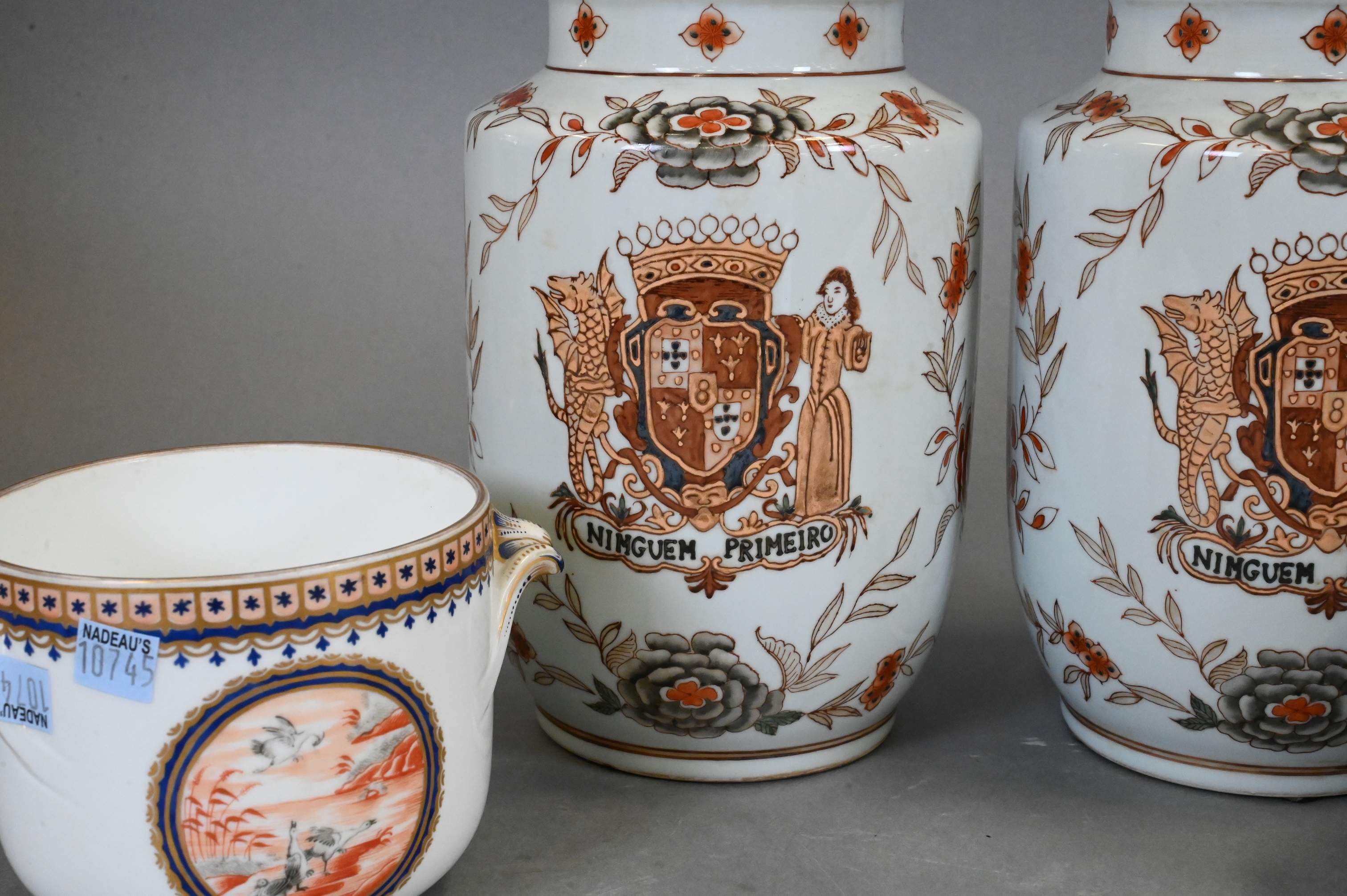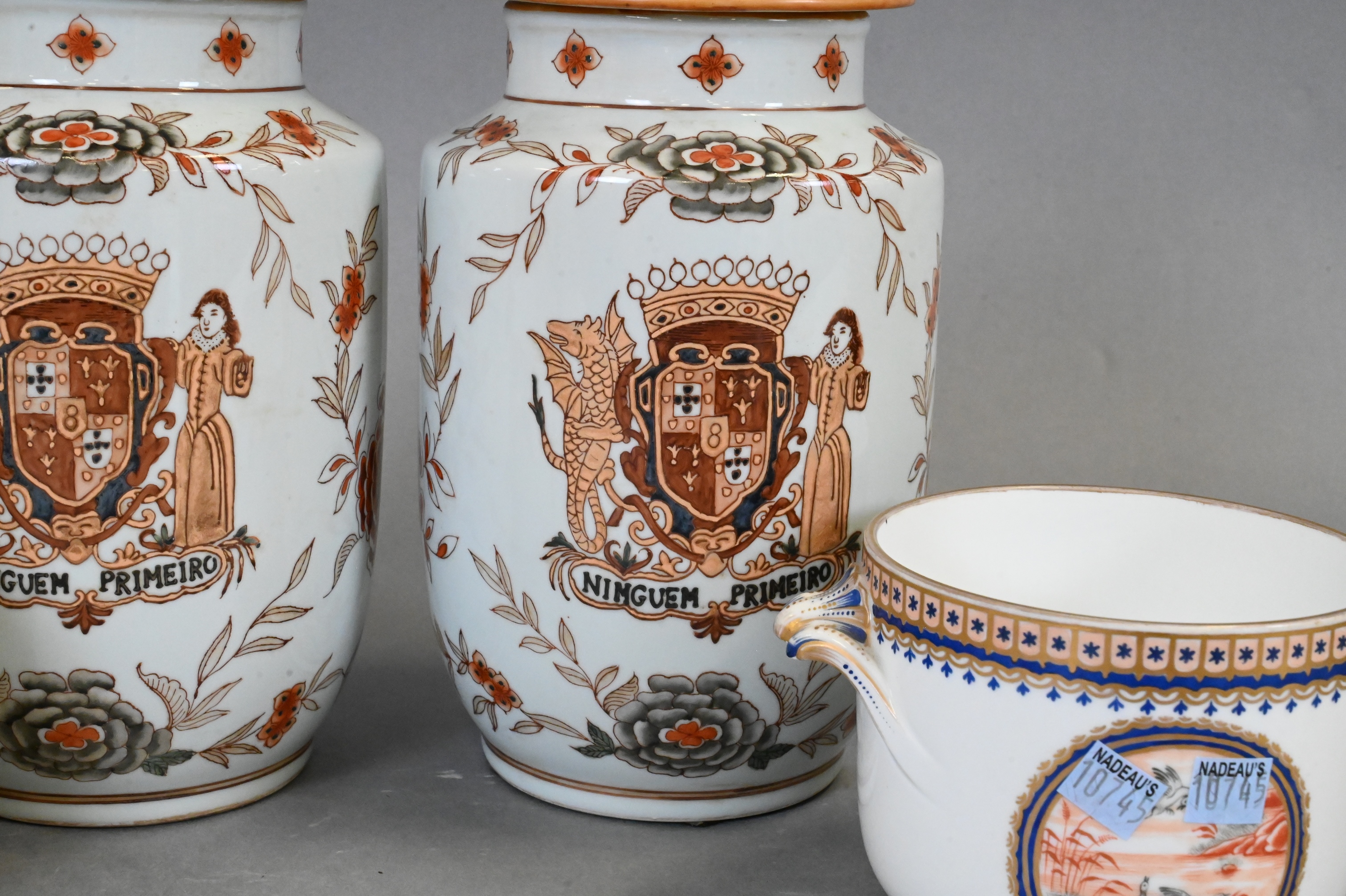 to include a pair of small double handled pots with bird motif (repairs), pair of export porcelain armorial covered jars having red painted floral motif, dragon crest inscribed “Ninguem Primeiro”
