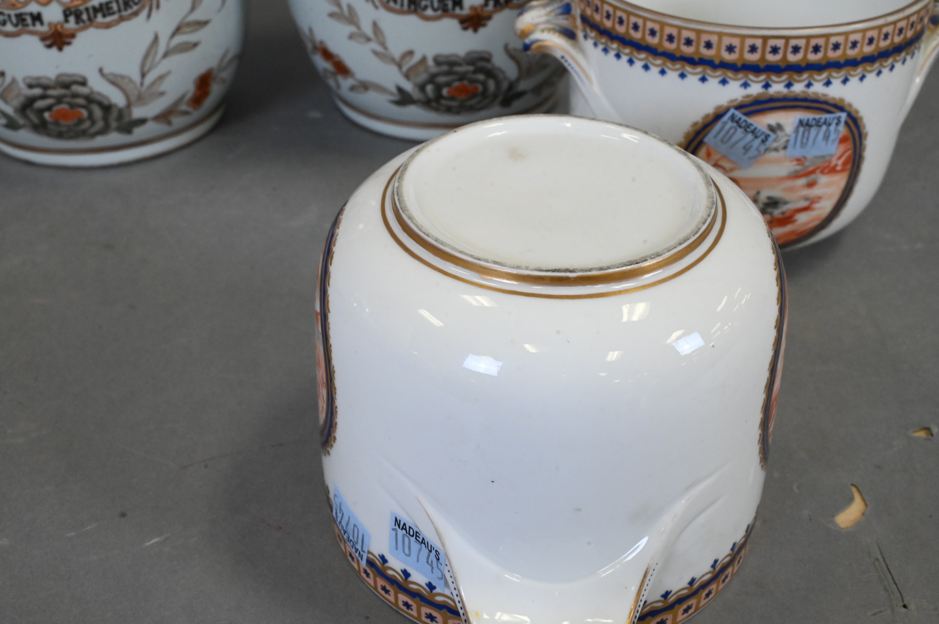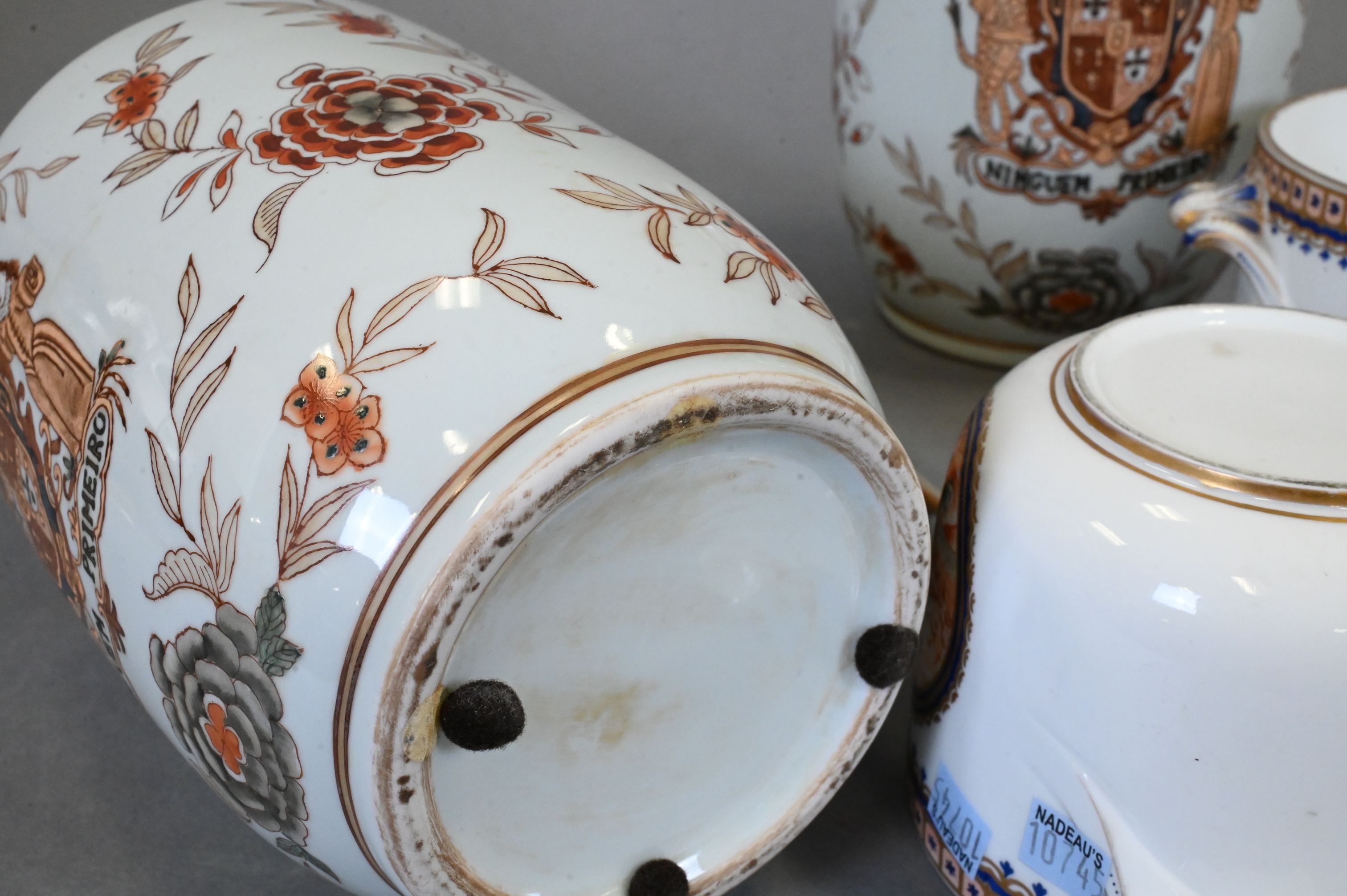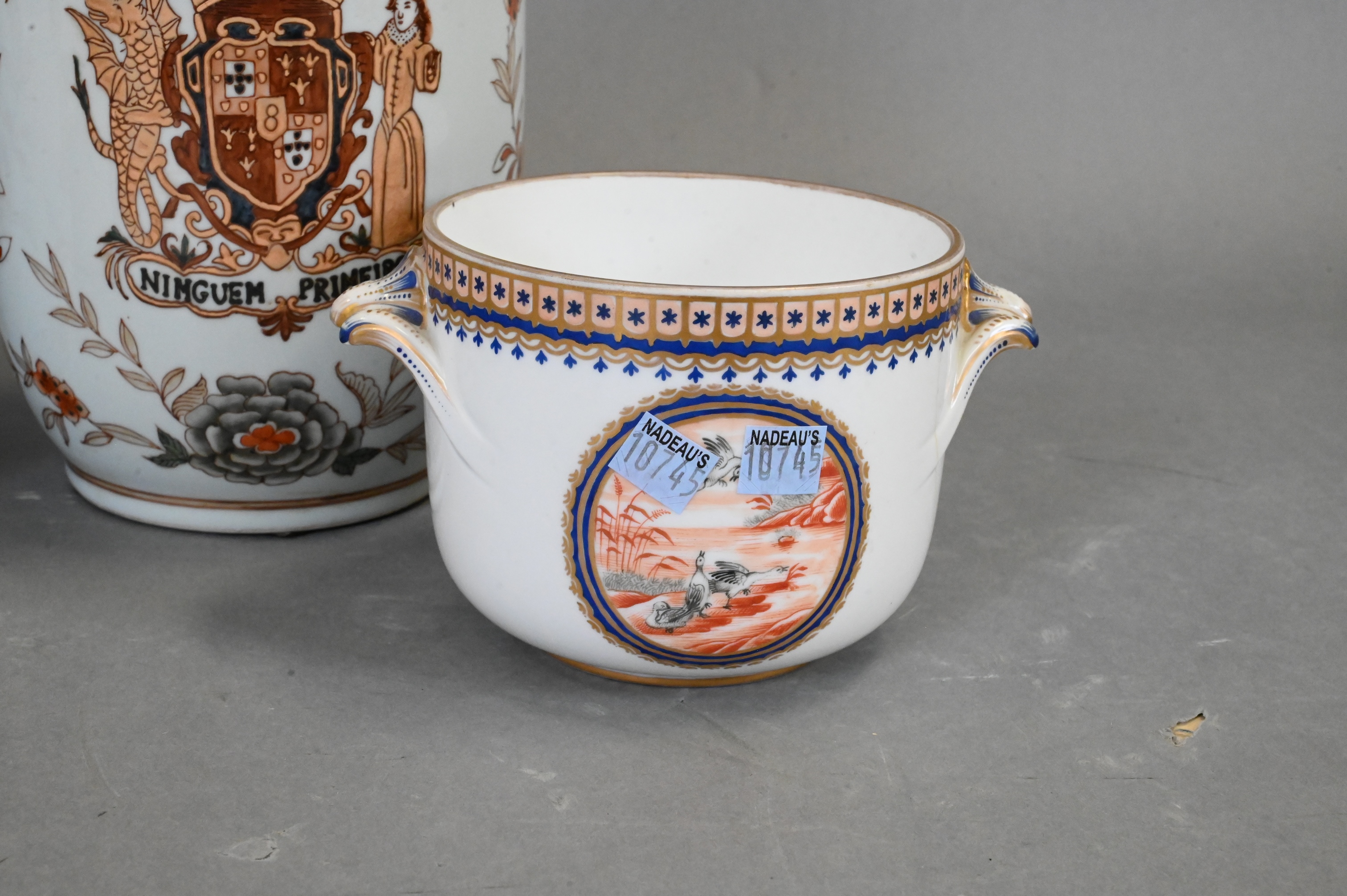 to include a pair of small double handled pots with bird motif (repairs), pair of export porcelain armorial covered jars having red painted floral motif, dragon crest inscribed “Ninguem Primeiro”