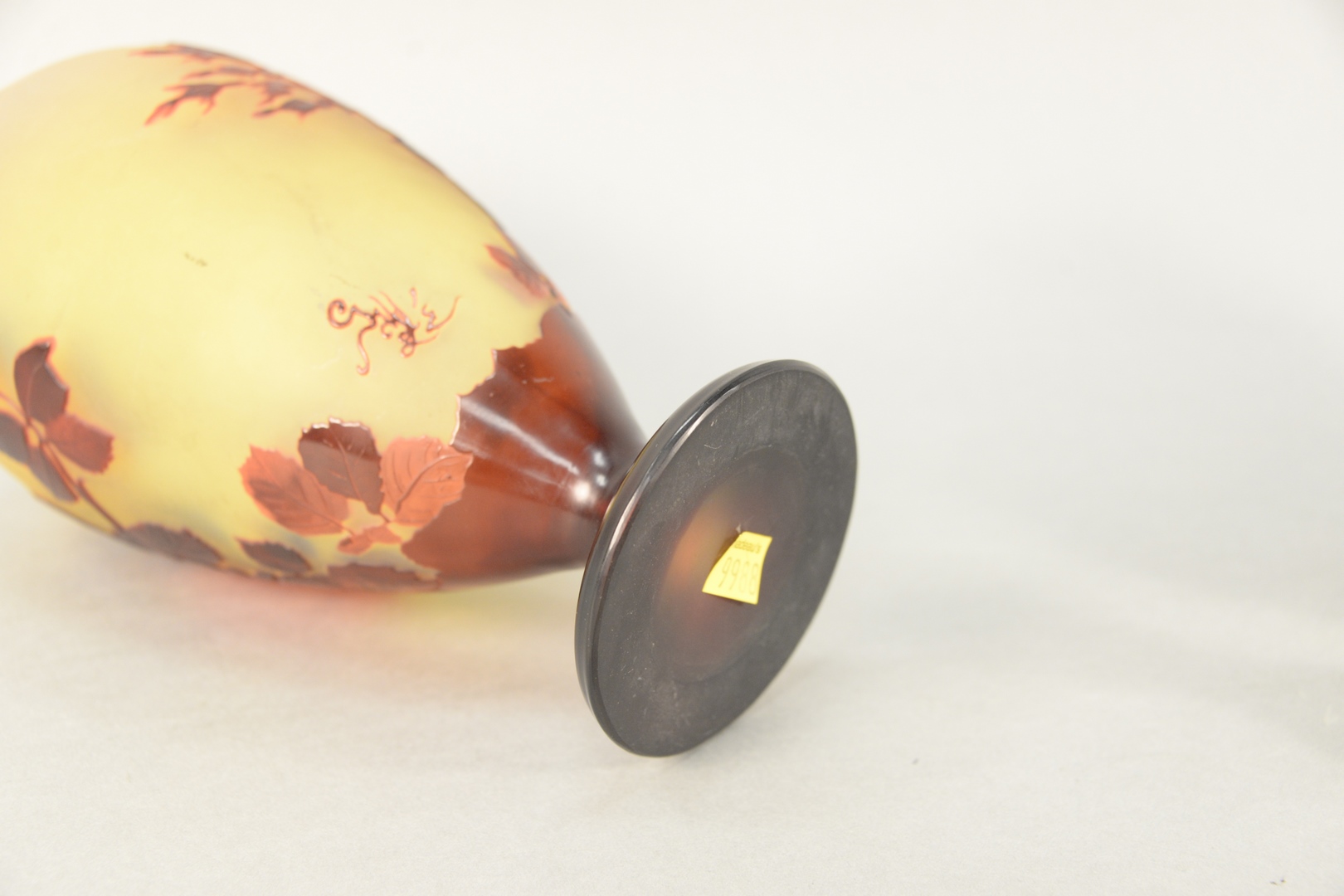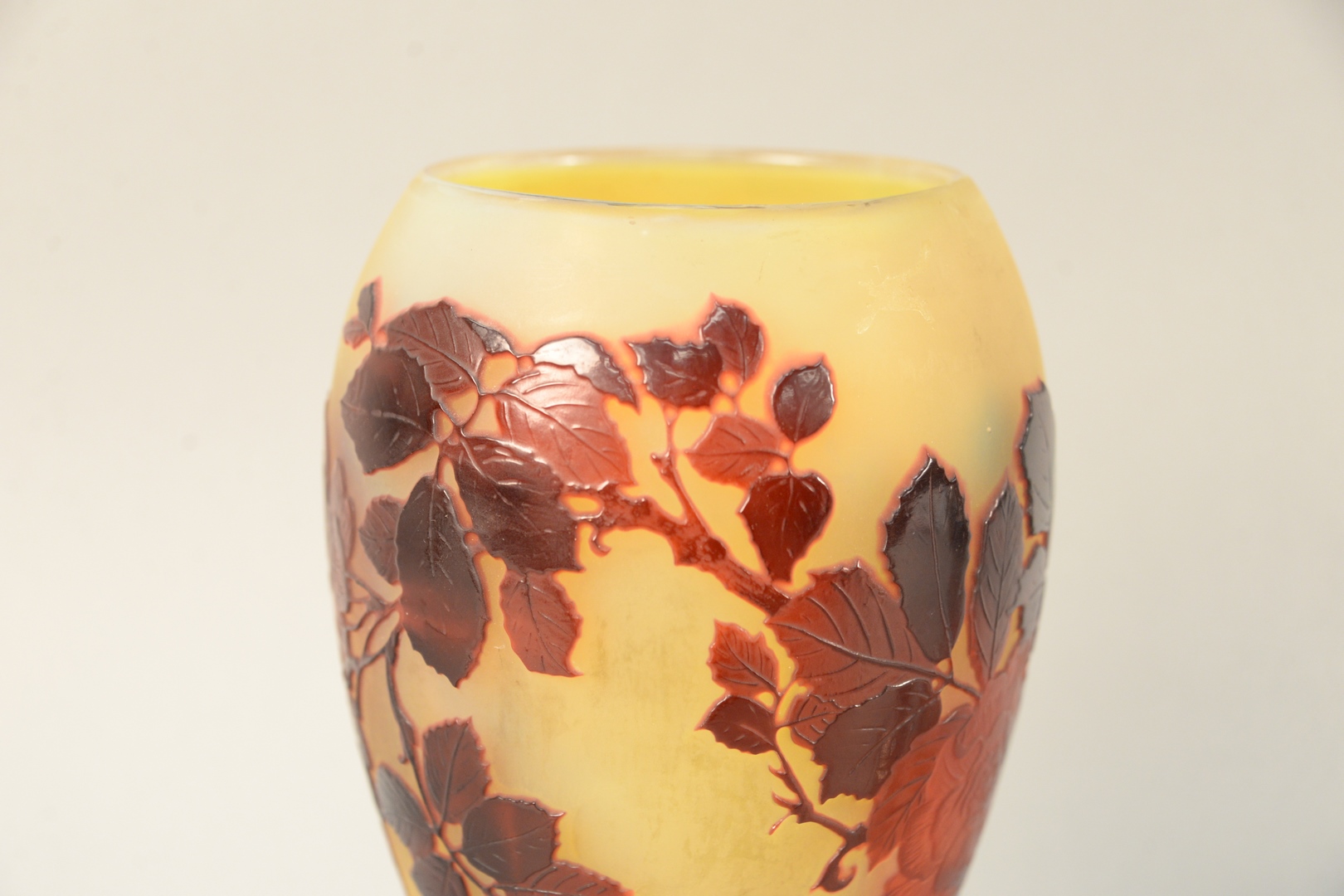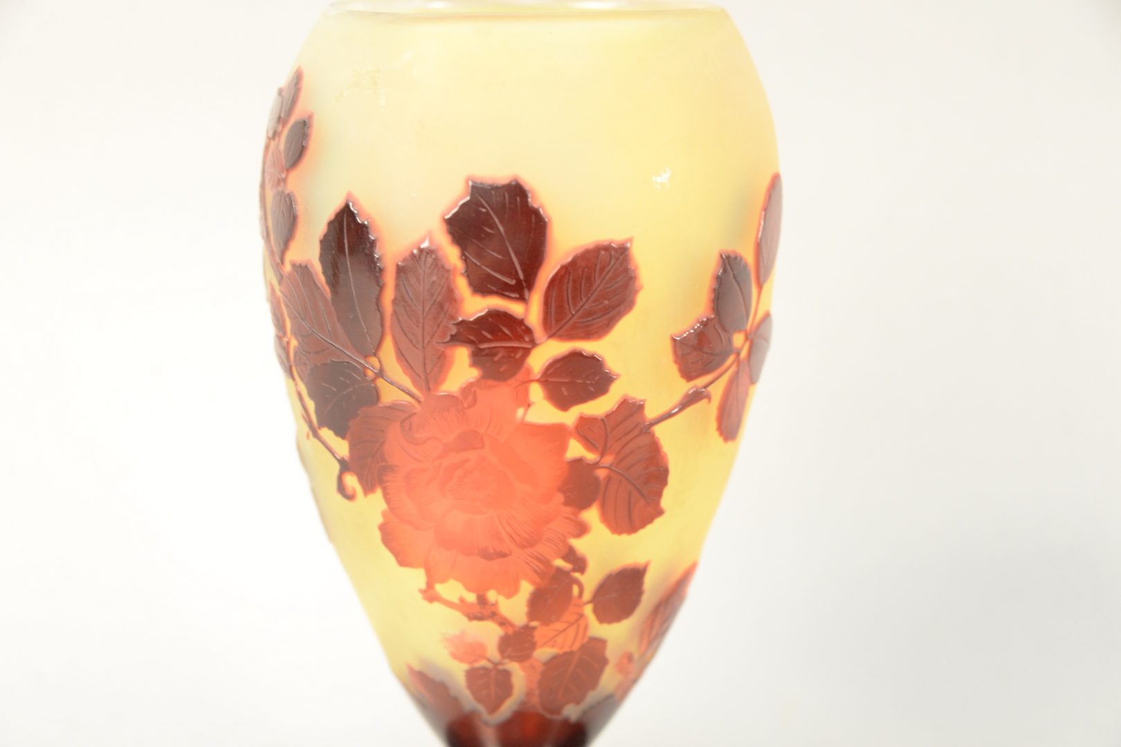 Lot 466: Galle Cameo Art Glass Vase having finely detailed cameo cut roses with leaves, in studies of red with yellow ground marked Galle on …