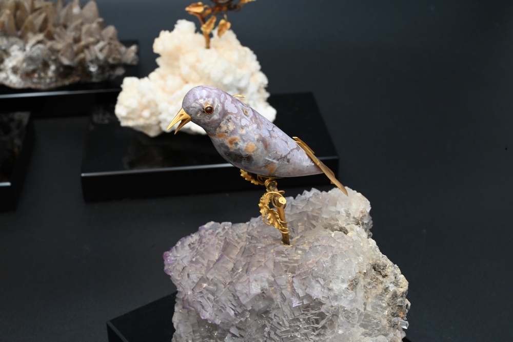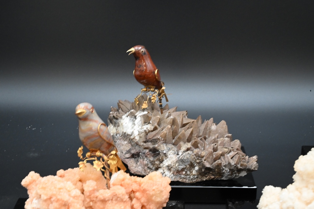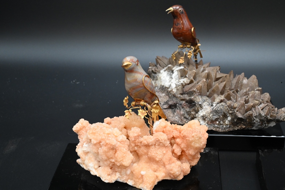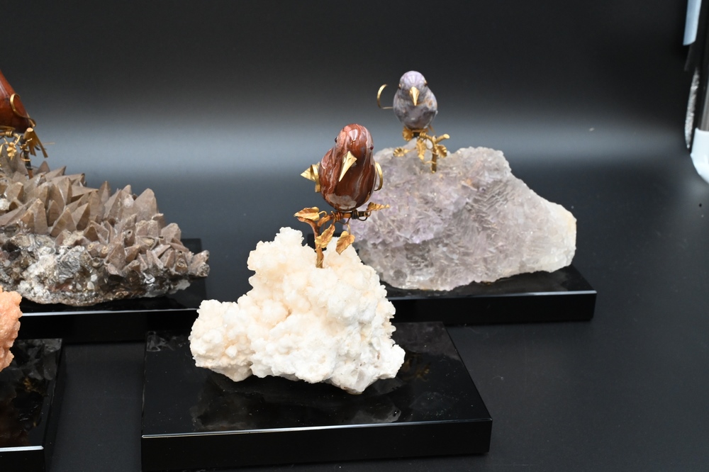 Group of Four Stone and Gold Songbirds, to include jasper bird having gold mounts, sitting on gold branch on white calcite mineral; agate bird having gold mounts, sitting on gold branch mounted on flourite base; obsidian bird having gold mounts, sitting on gold branch mounted on dog’s tooth base; along with agate bird having gold mounts sitting on gold branch, mounted on selenium base; tallest height 6 inches, all listed as totaling 57 grams of gold.