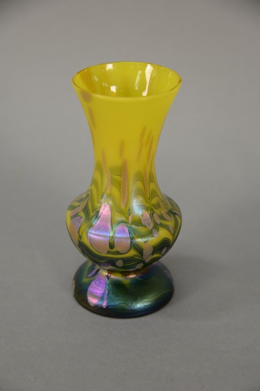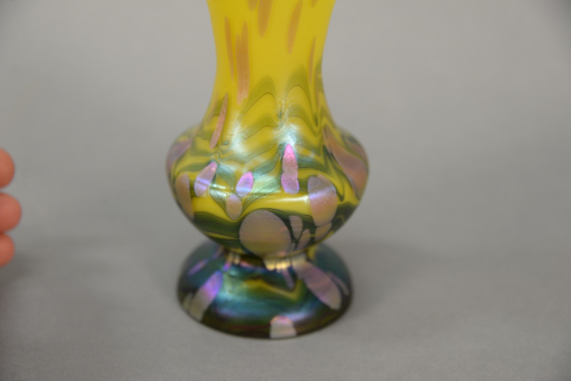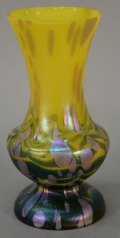 Lot 466: Loetz art glass vase, green blue purple iridescent oil spot decoration on wavy ground graduating from dark green at bottom to yellow…