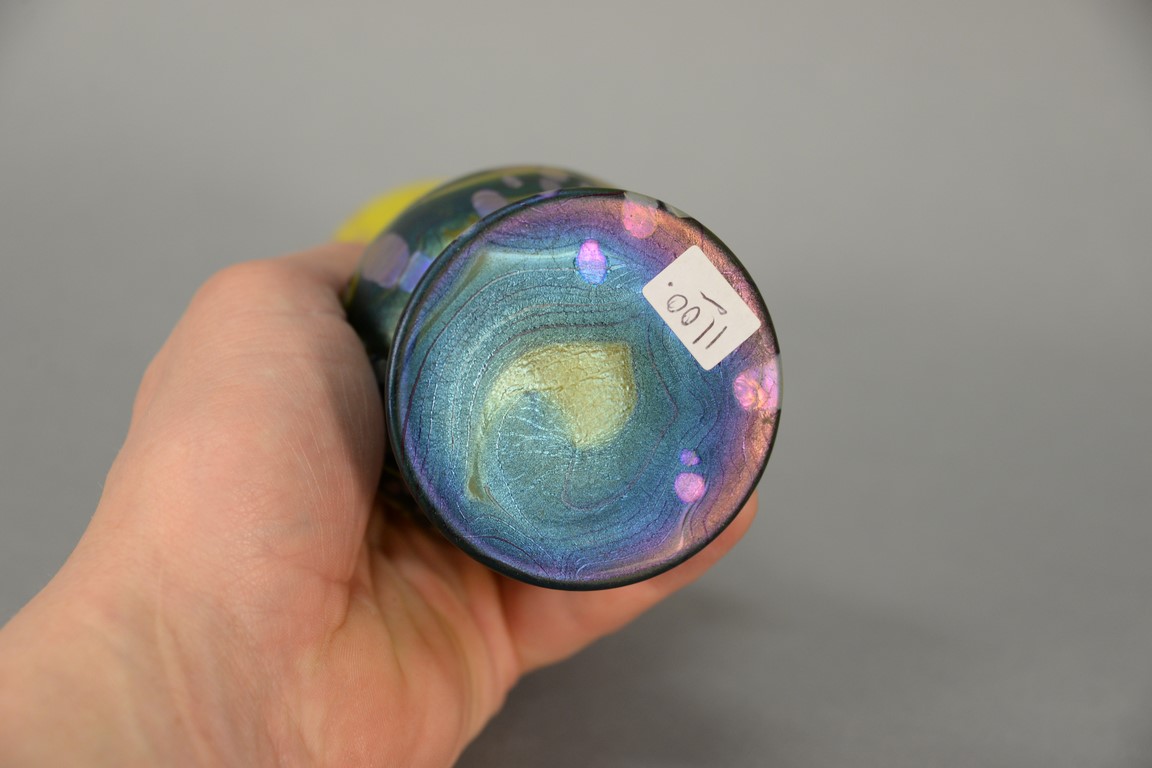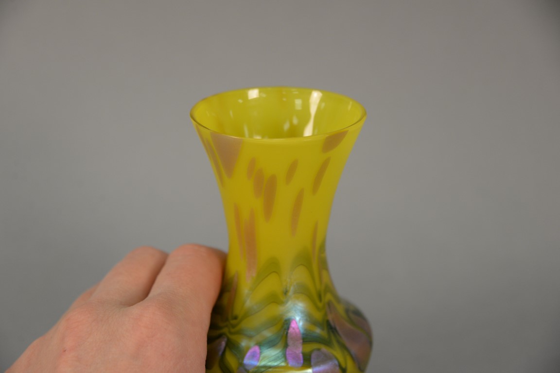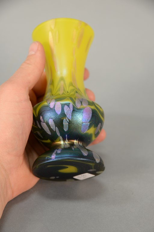Loetz art glass vase, green blue purple iridescent oil spot decoration on wavy ground graduating from dark green at bottom to yellow at top. ht. 6in.