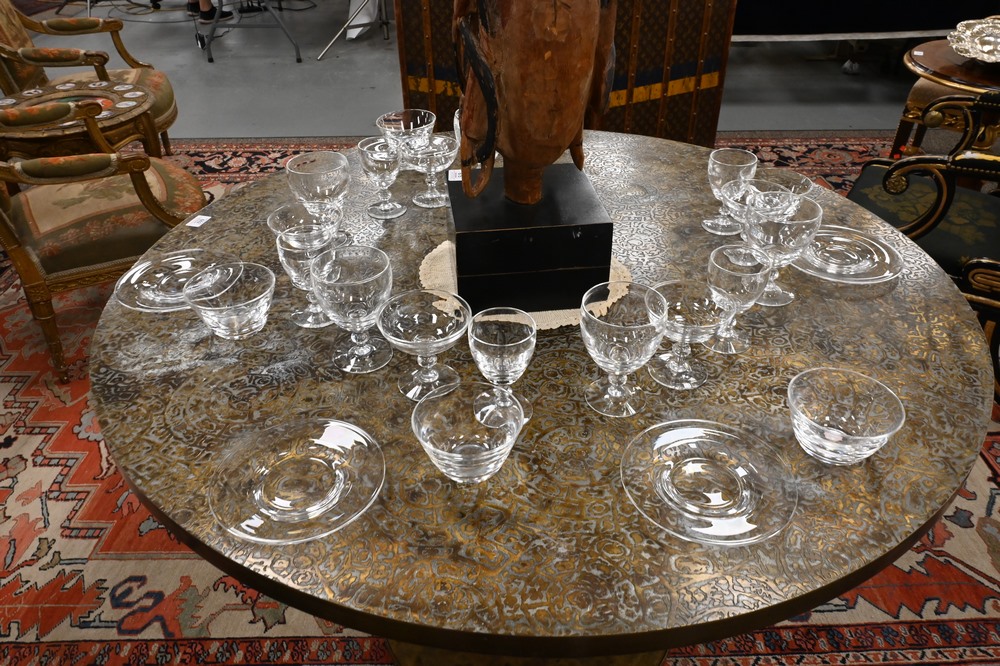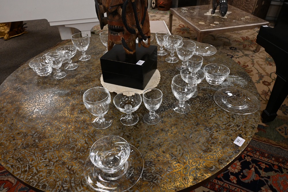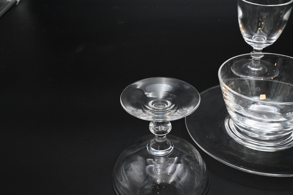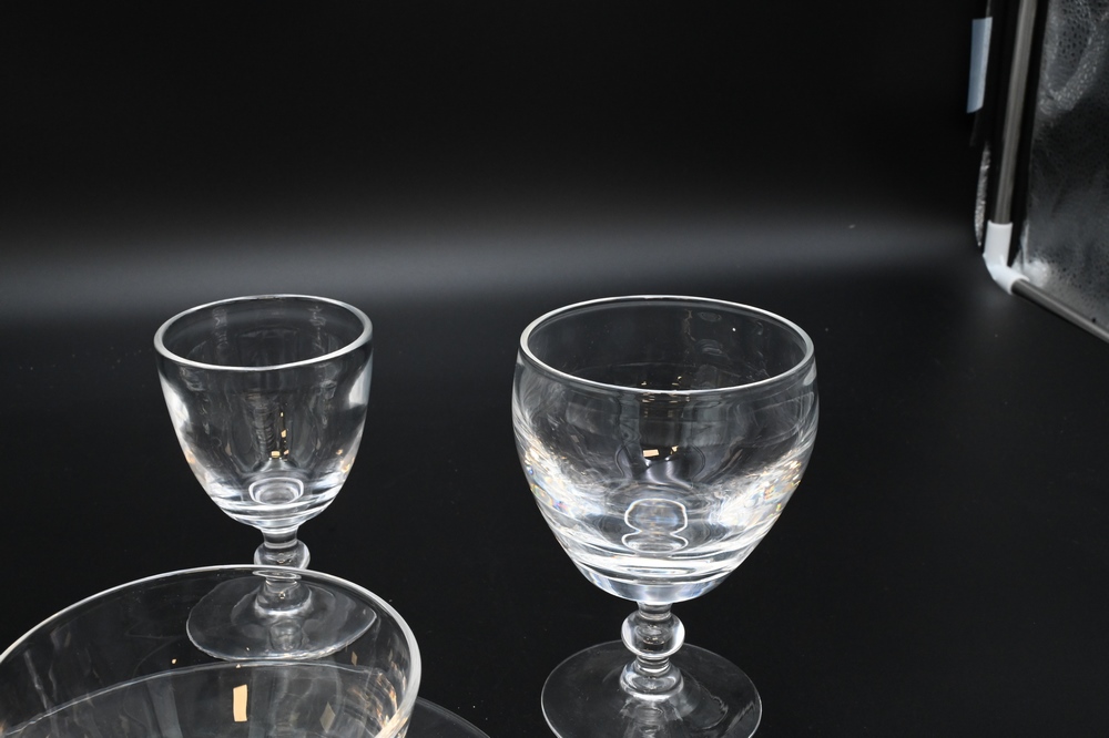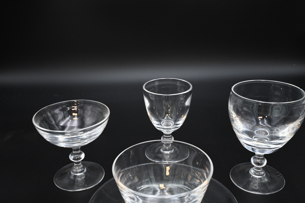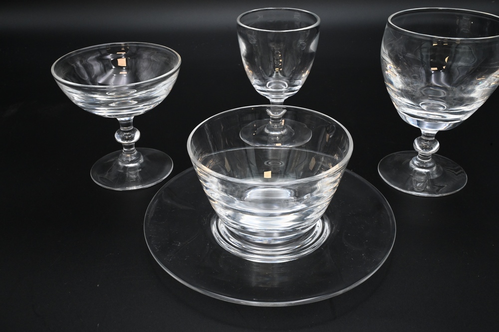 54 Piece Steuben Glass Group, to include 11 red wine, height 5 inches; 11 white wine, height 4 1/2 inches; 11 champagne, height 3 3/6 inches; 10 bowls, diameter 4 1/2 inches; along with 11 underplates, diameter 7 inches.