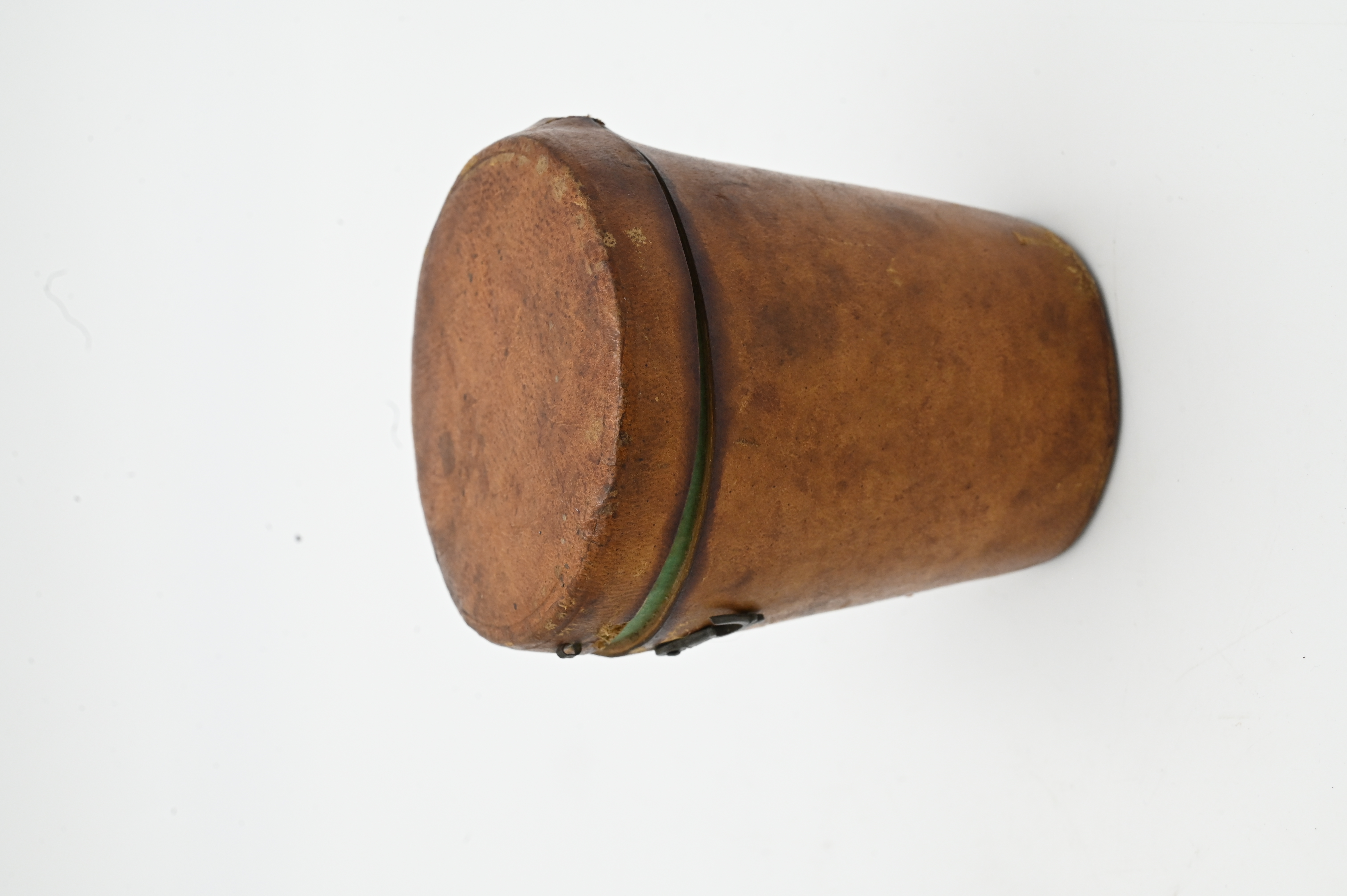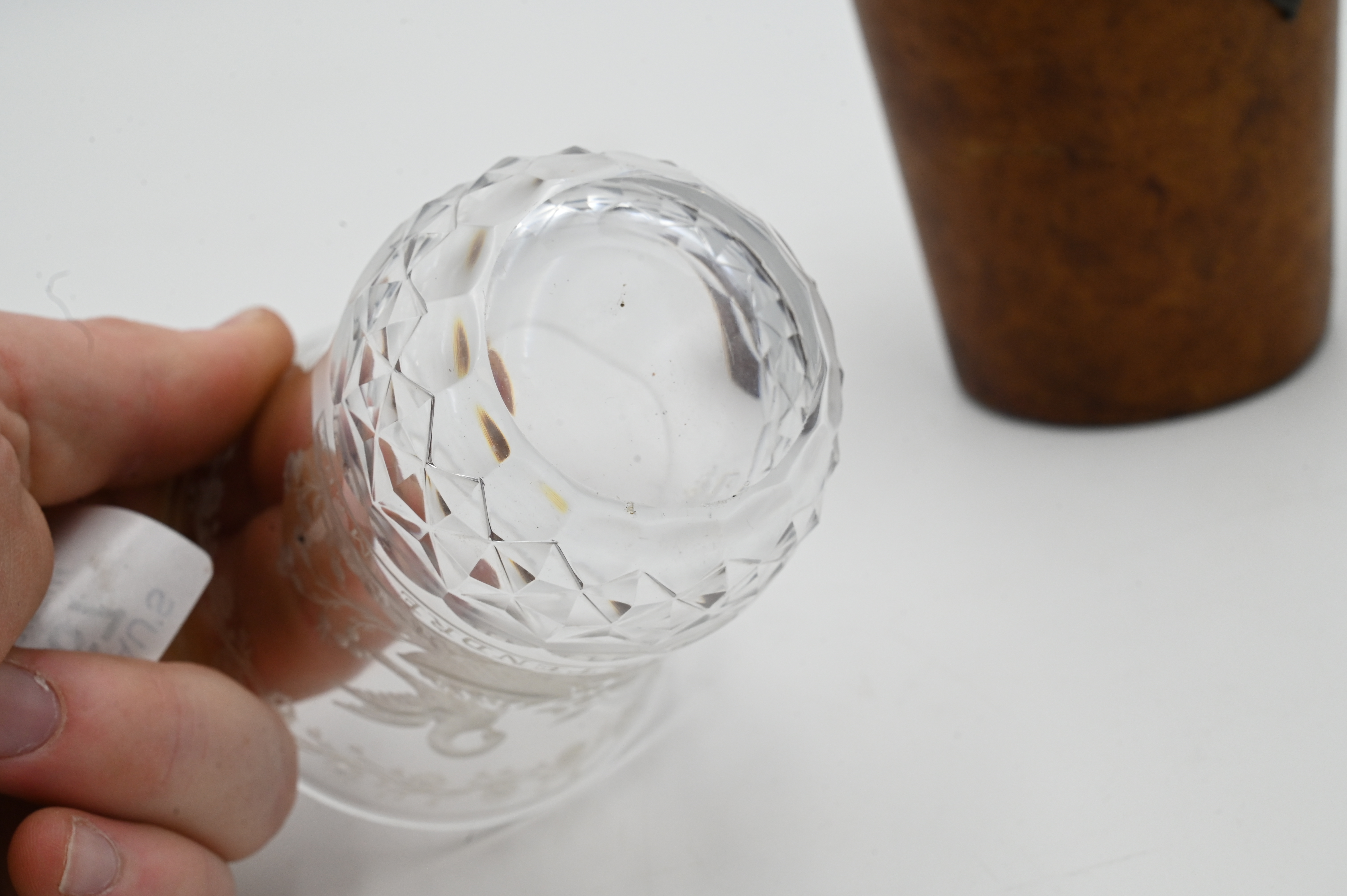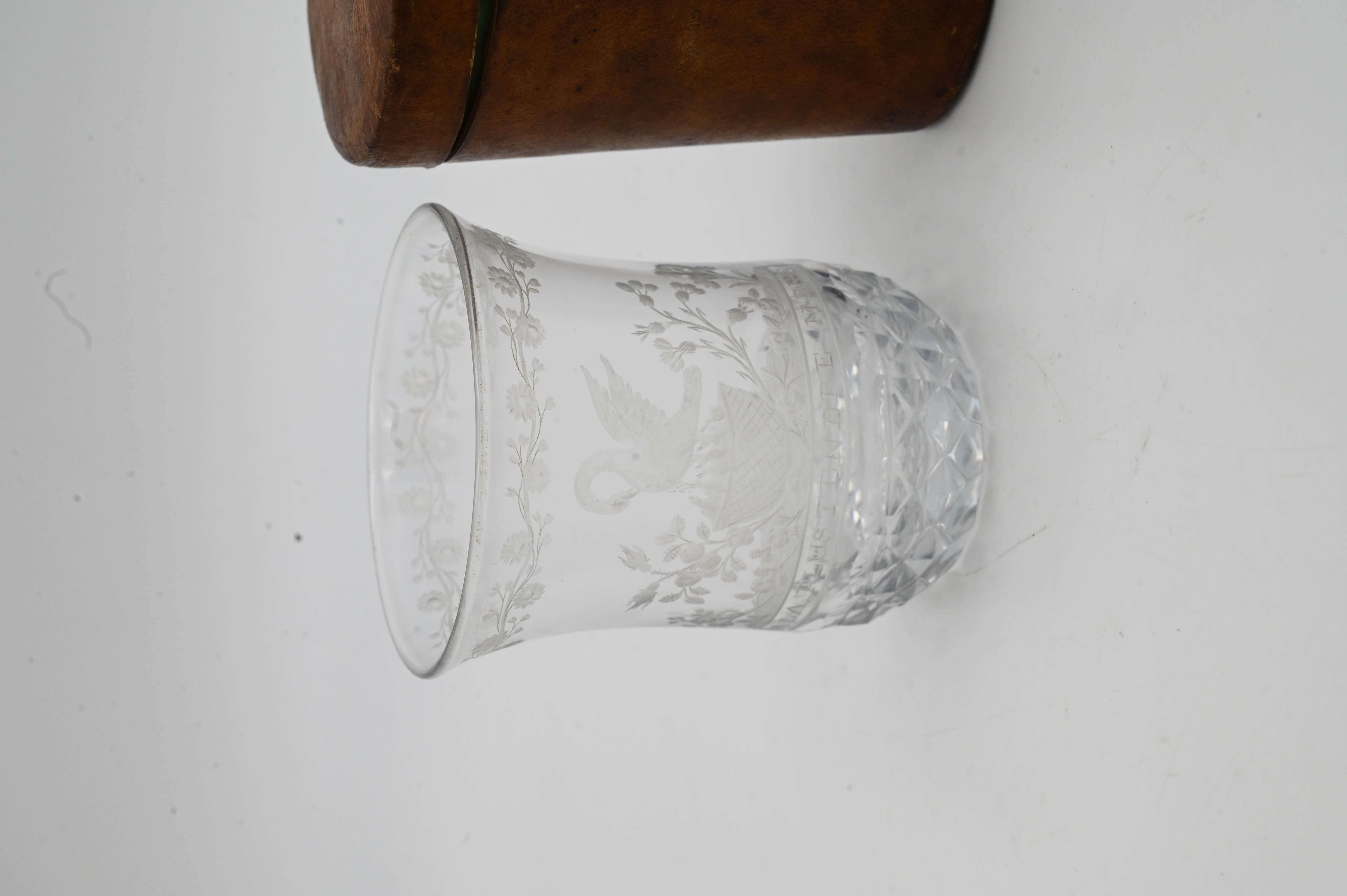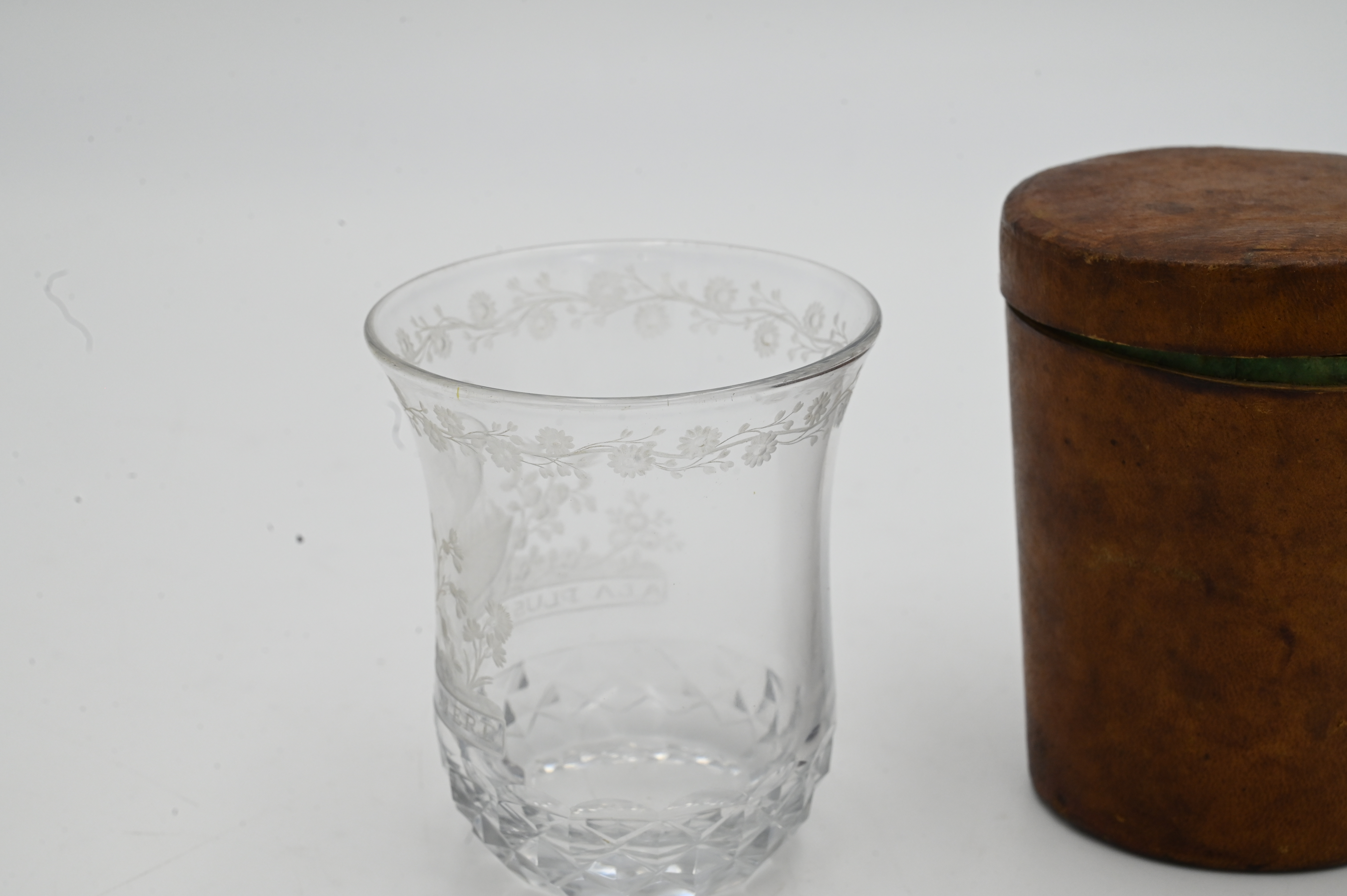 Etched Glass Medicine Cup, in fitted leather holder, having etched swan and flowers over “La Plusd Tendre Mere”, height 4 inches.
