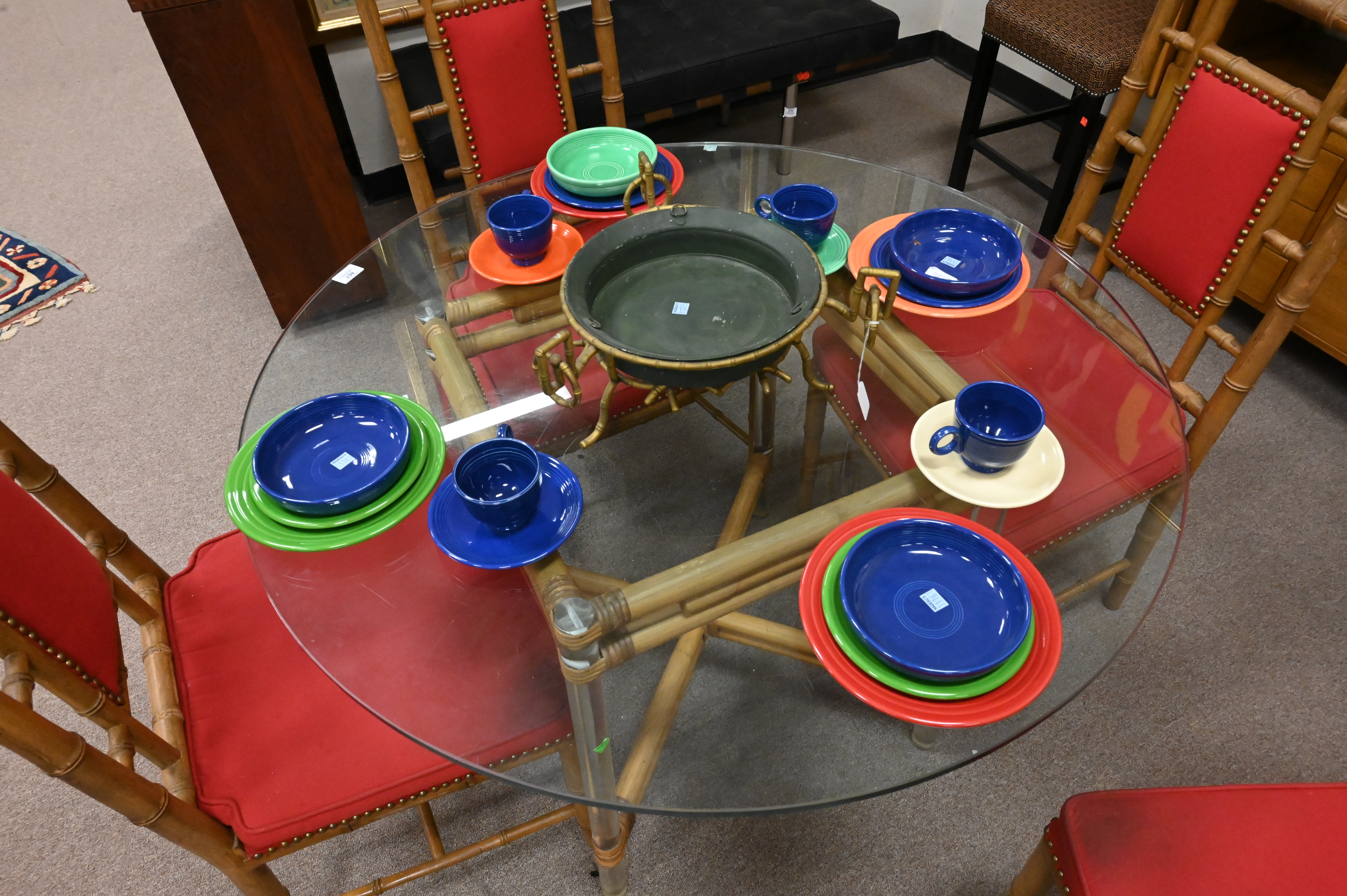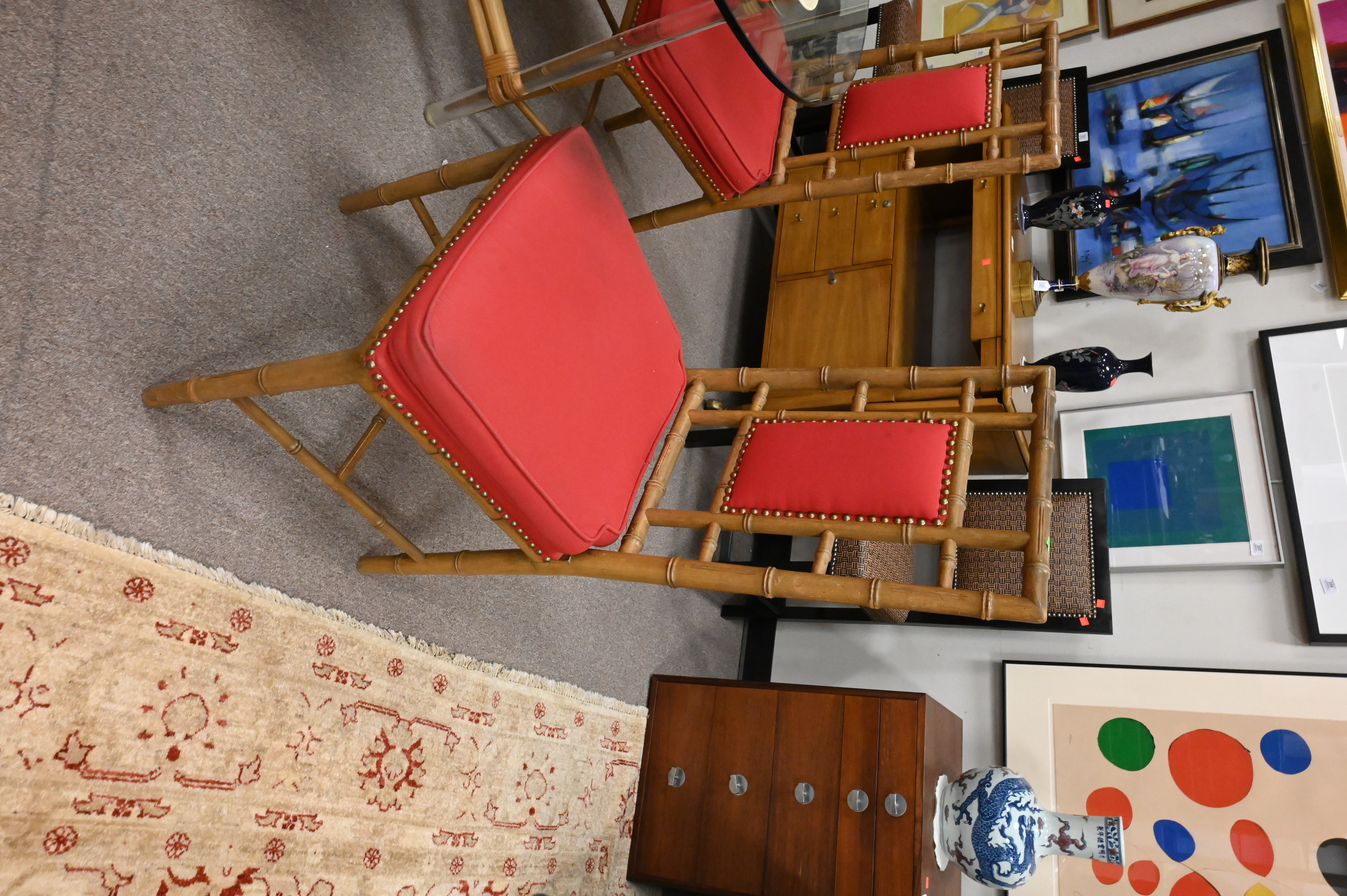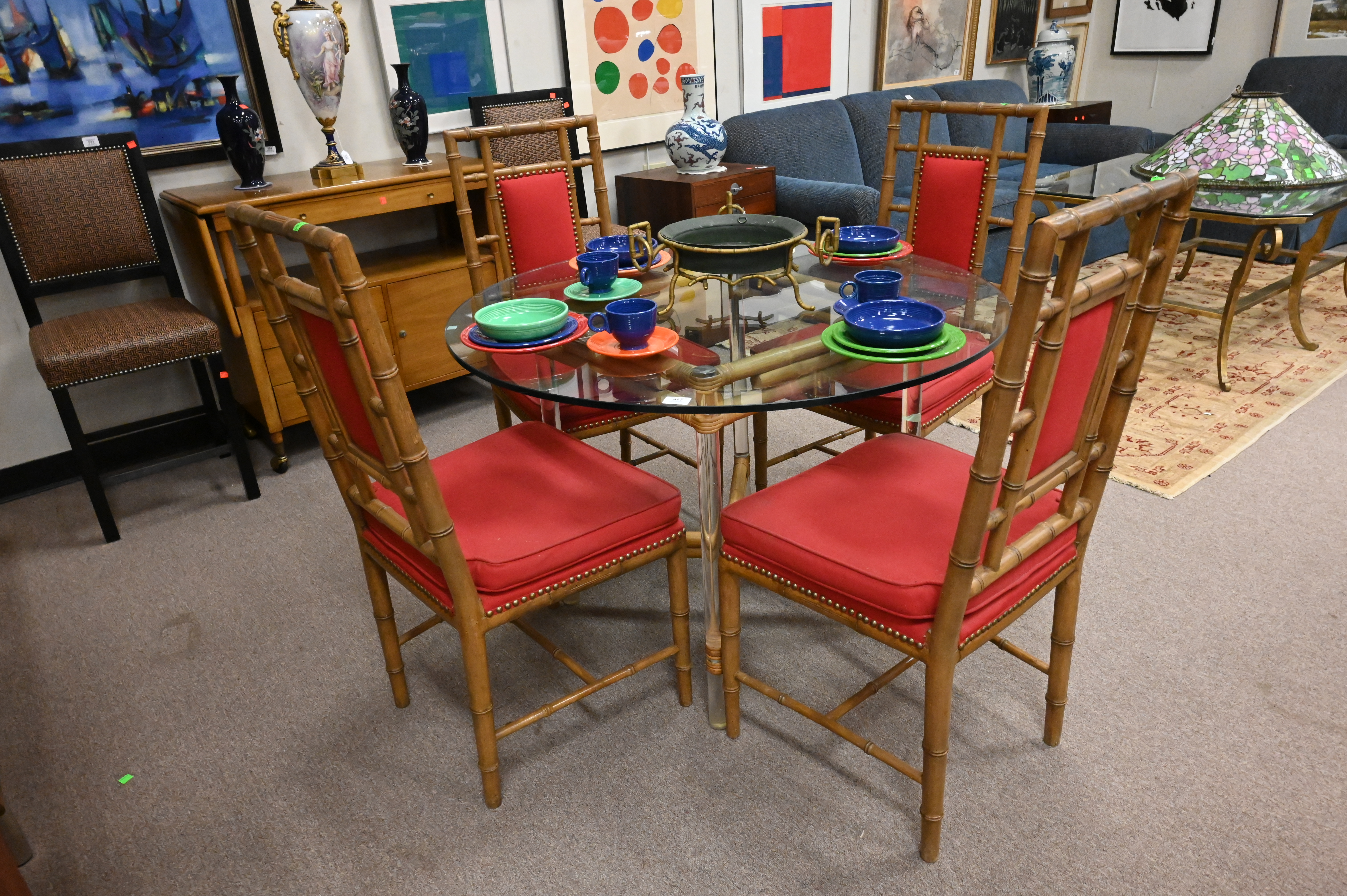 to include a set of four faux bamboo chairs and a table having rattan and lucite legs with a glass top