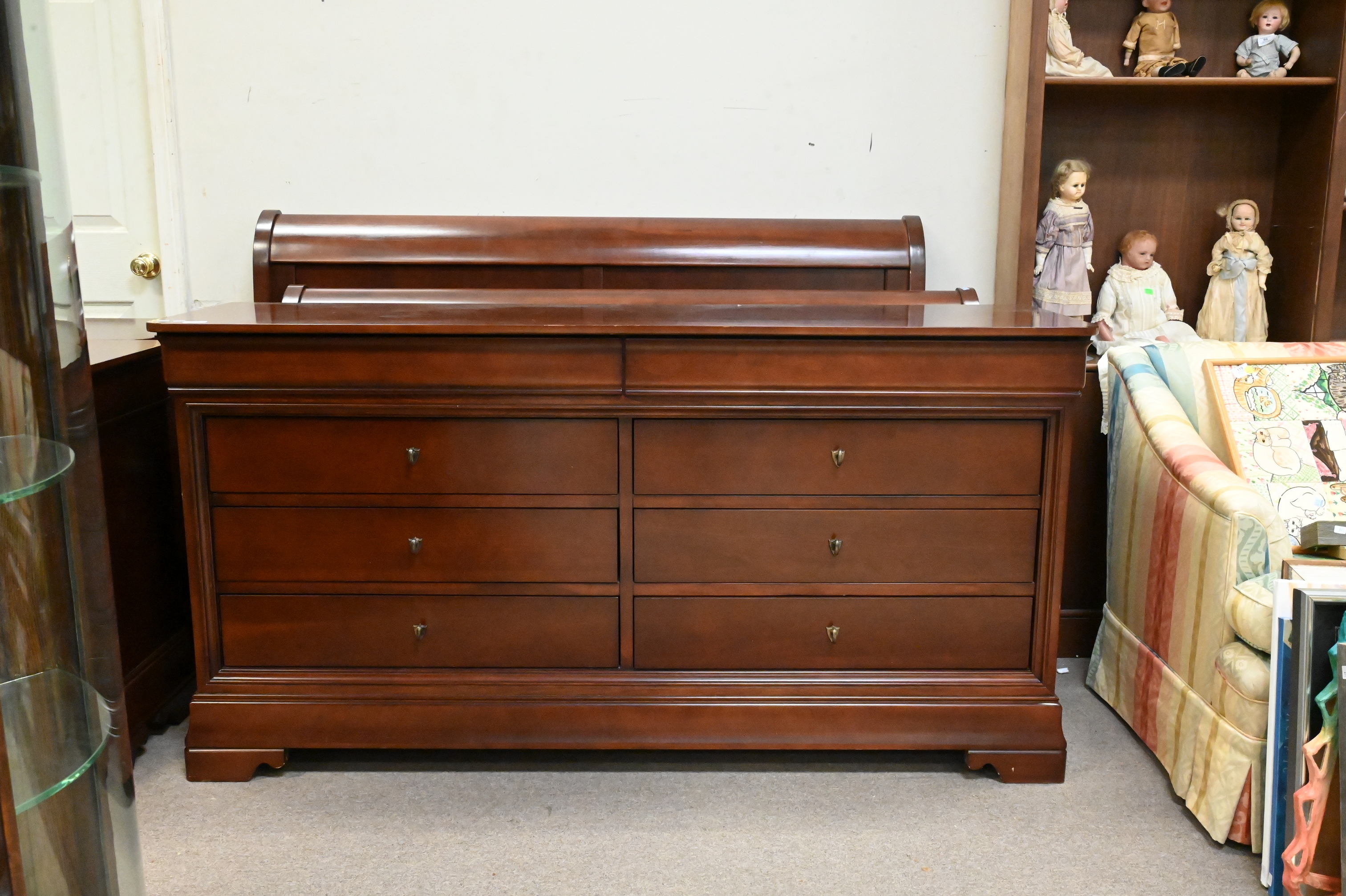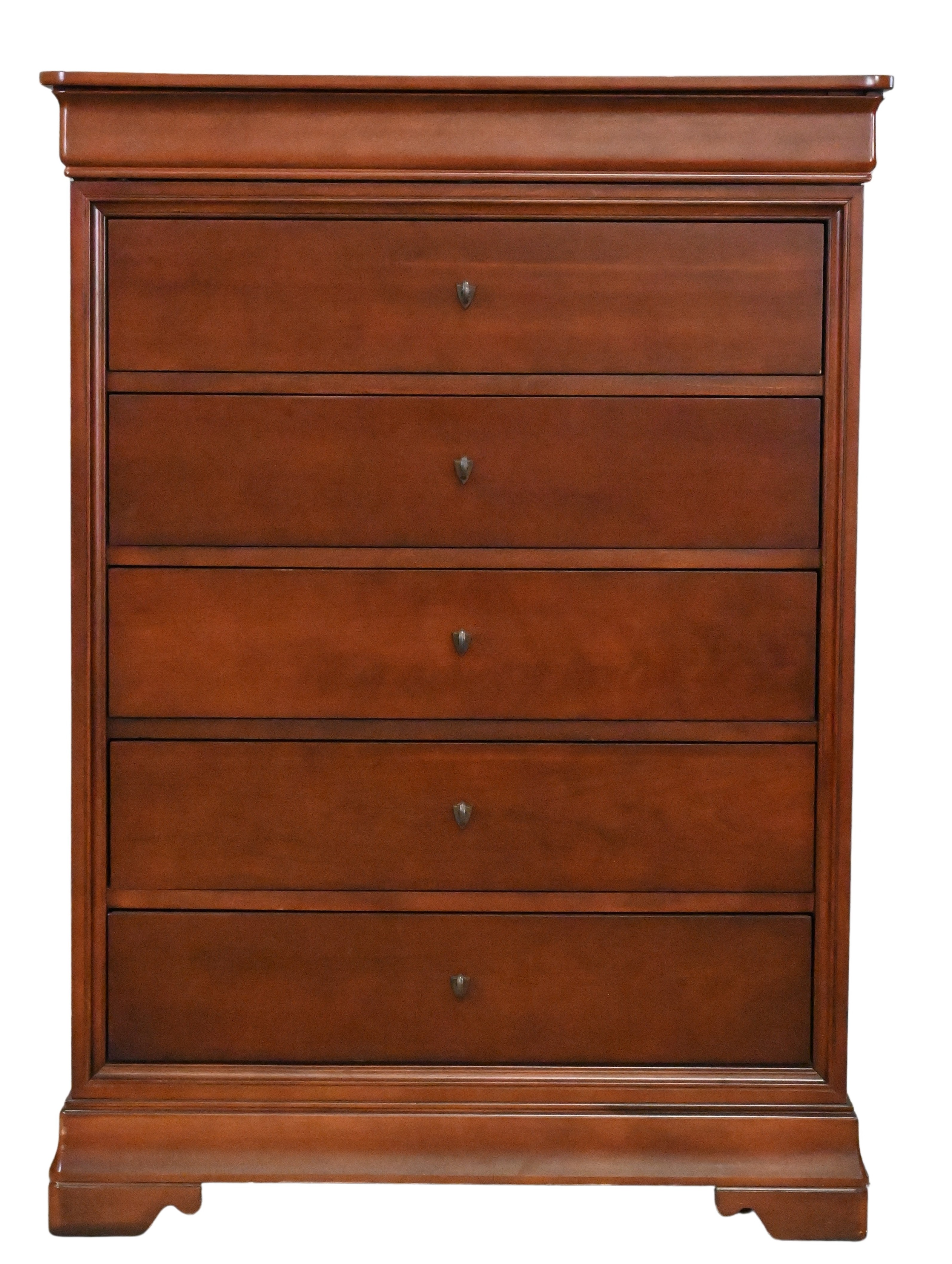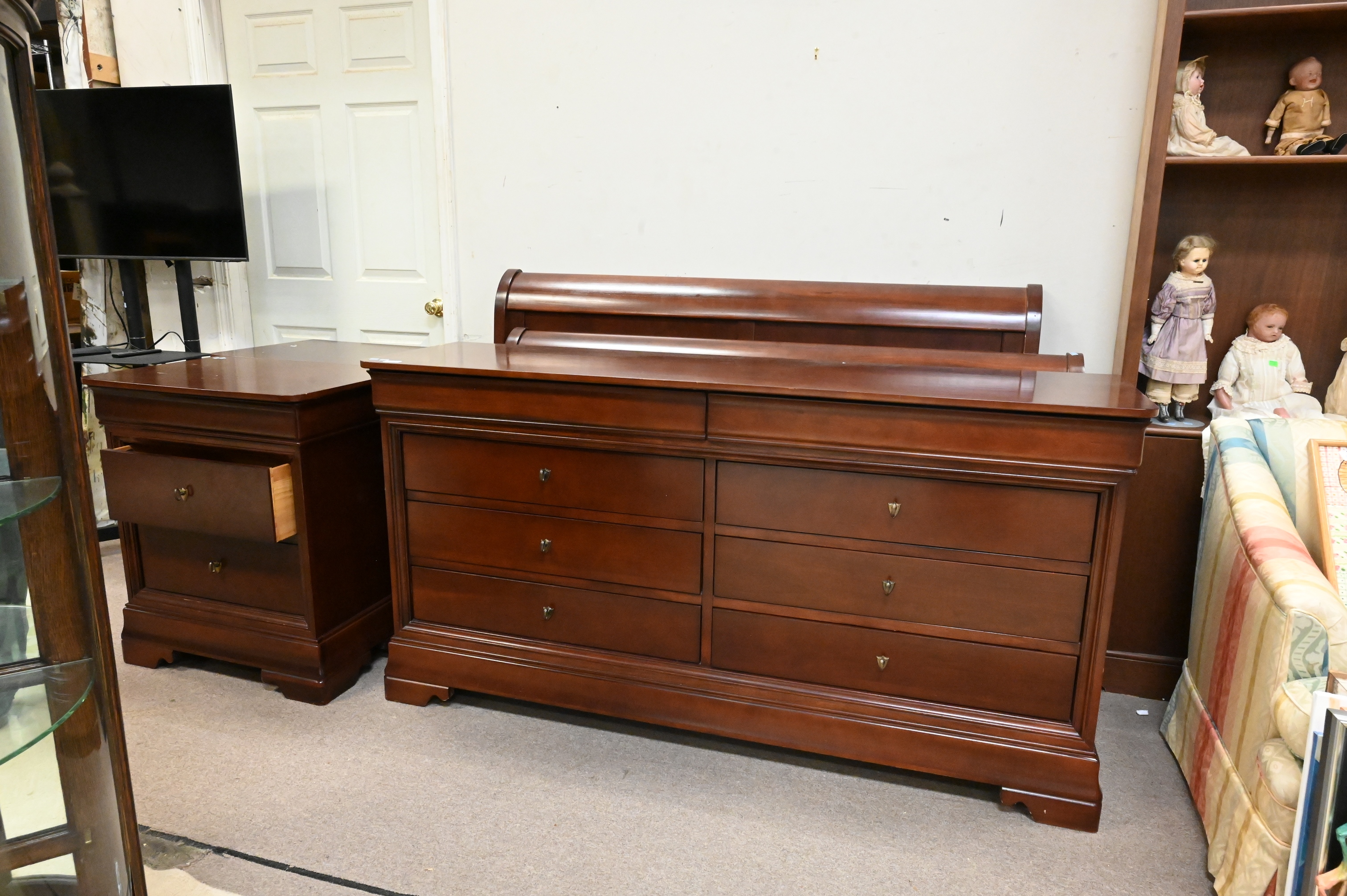 queen size bed frame, pair of nightstands, tall chest, and six drawer dresser