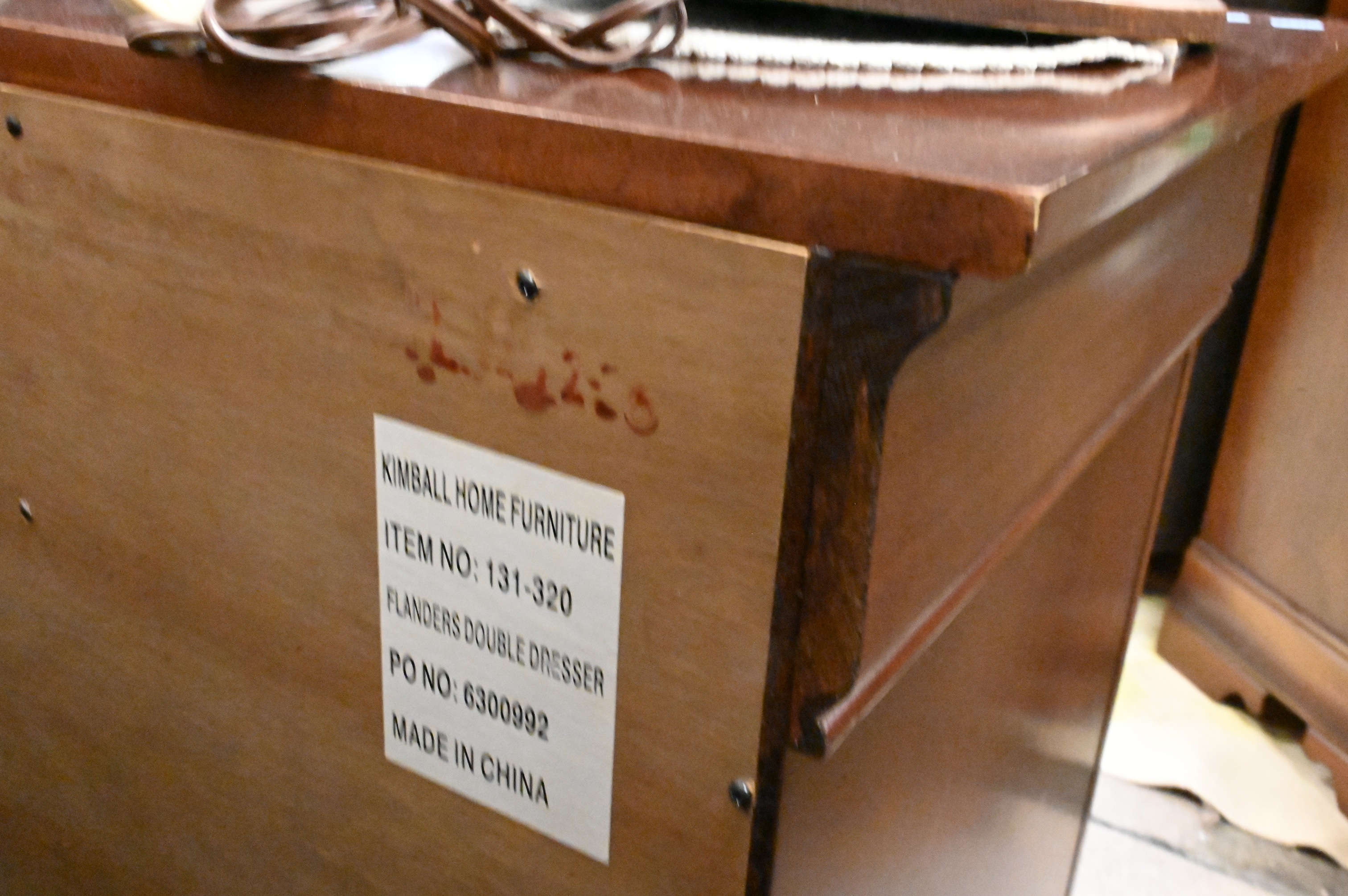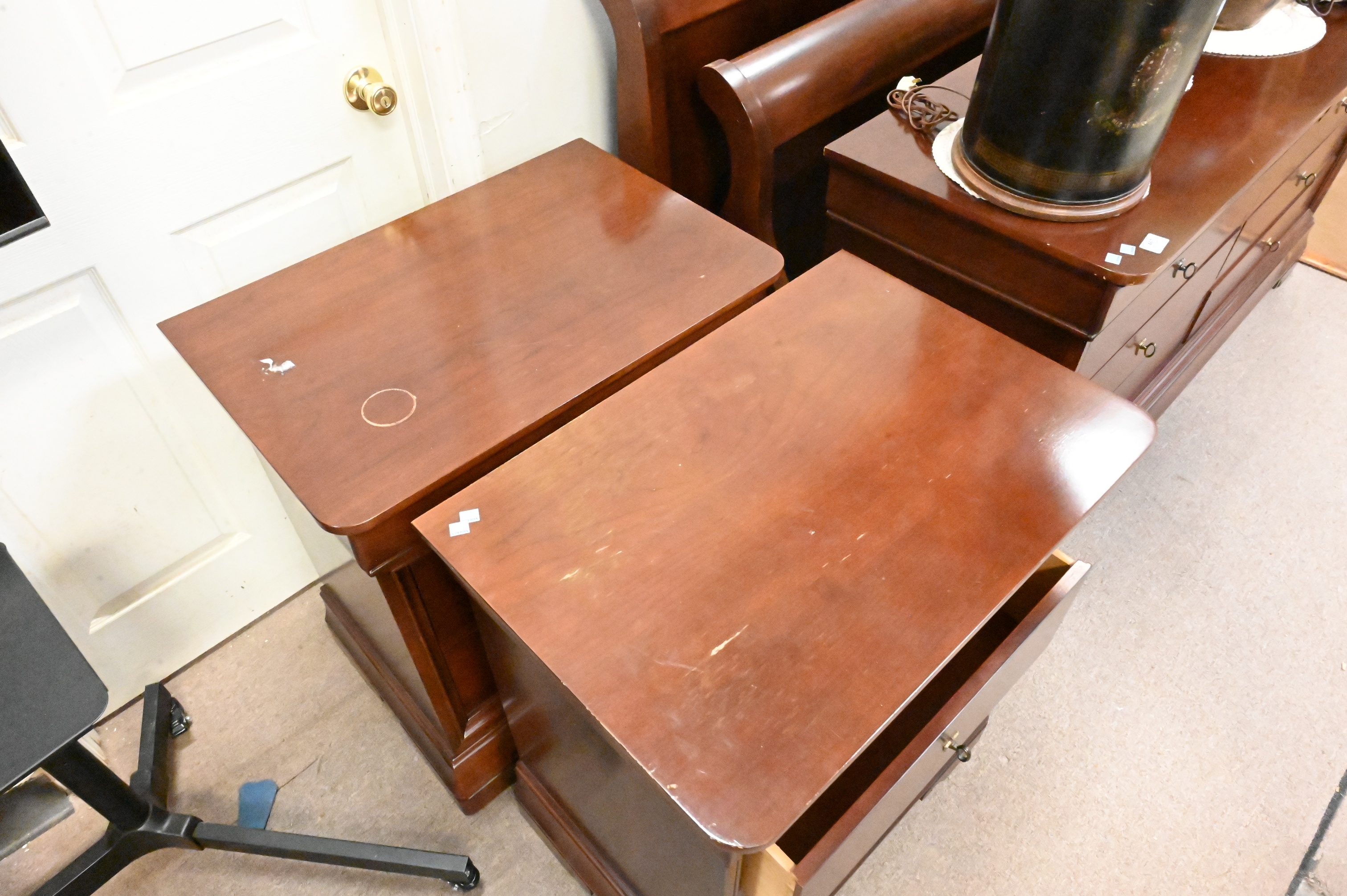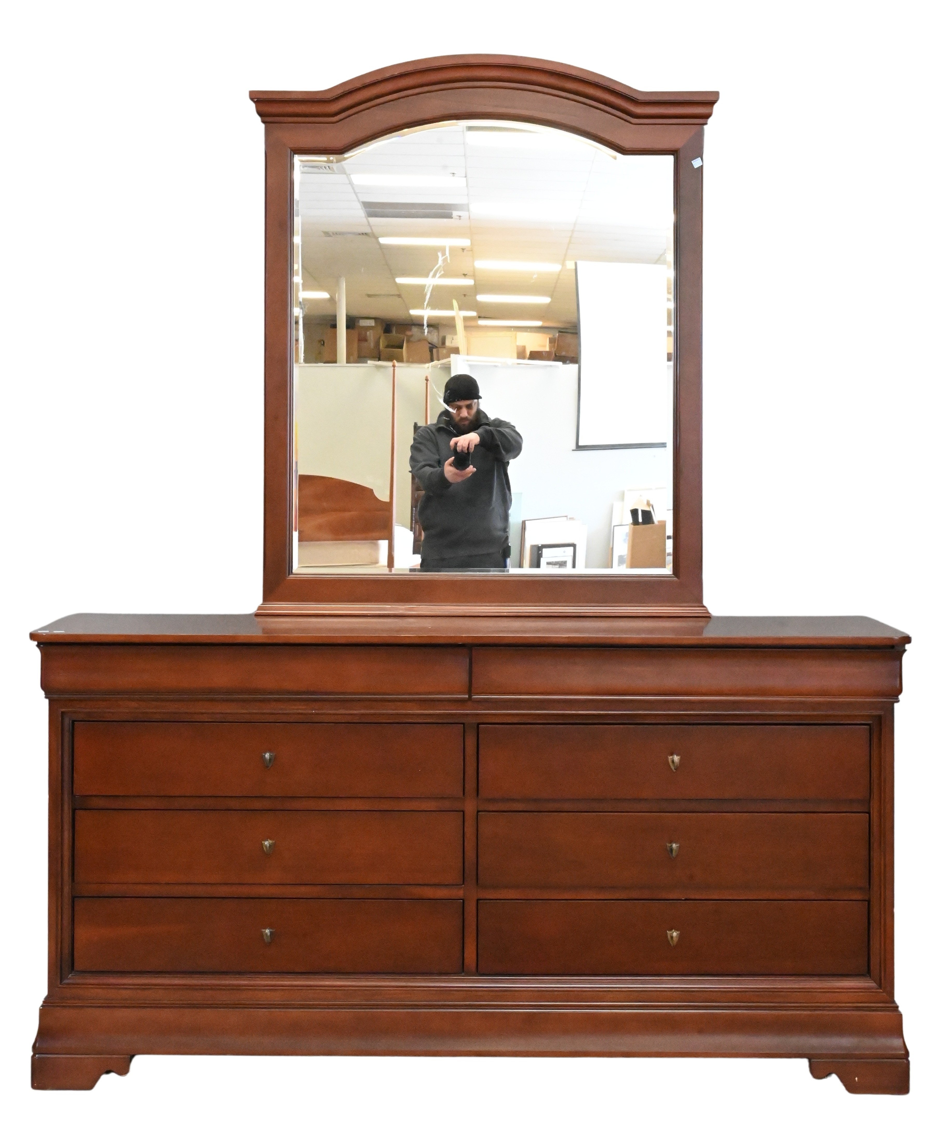 queen size bed frame, pair of nightstands, tall chest, and six drawer dresser