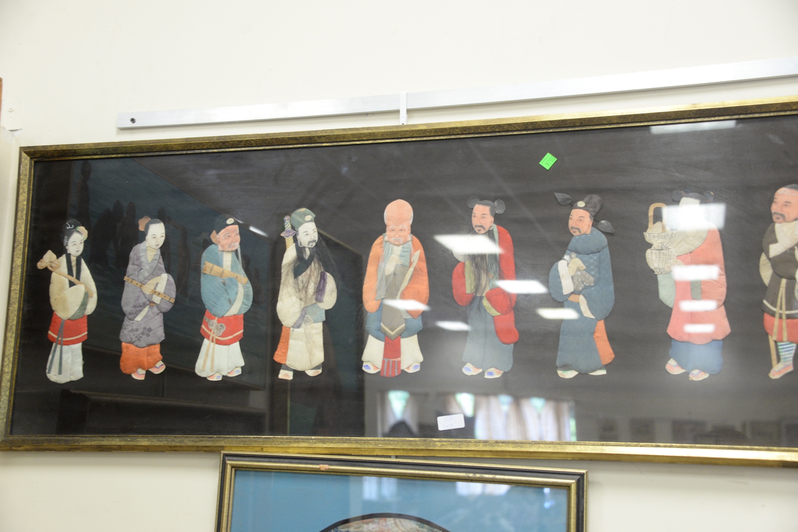 Lot 467: Four Piece Chinese Group, to include a framed embroidered badge; along with three framed pieces having Taoist figures on padded and painted silk with human hair, sight size of largest 17 1/2″ x 48 1/2″. Provenance: Estate of James Wadhams
