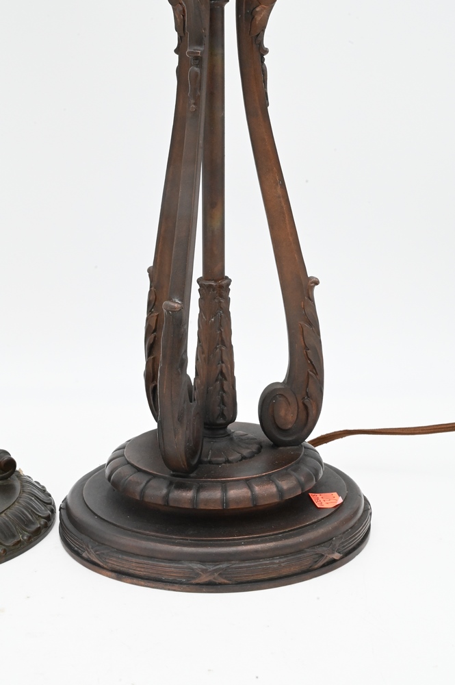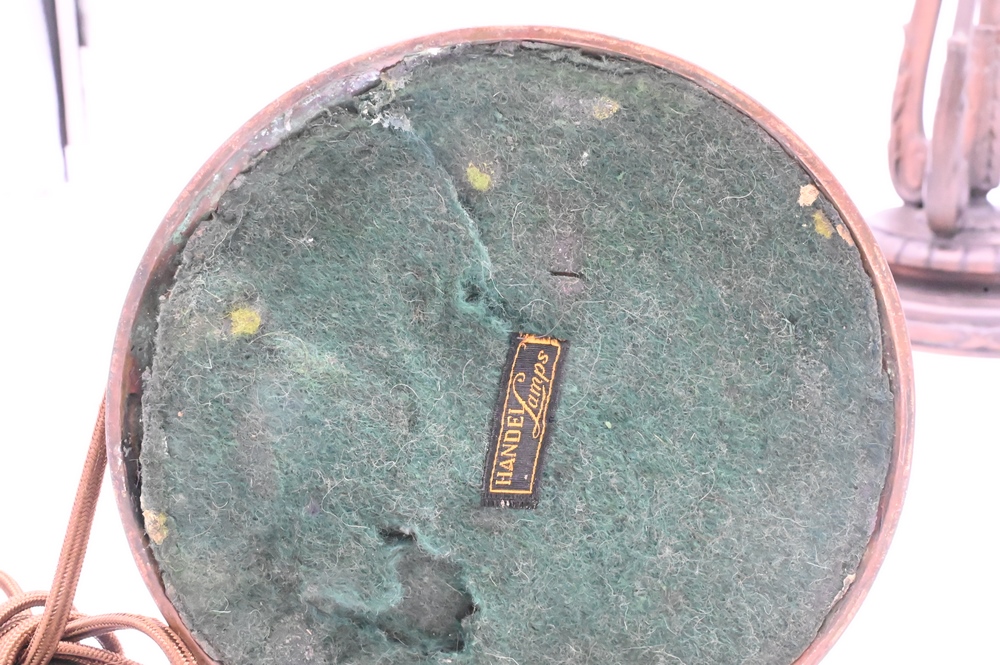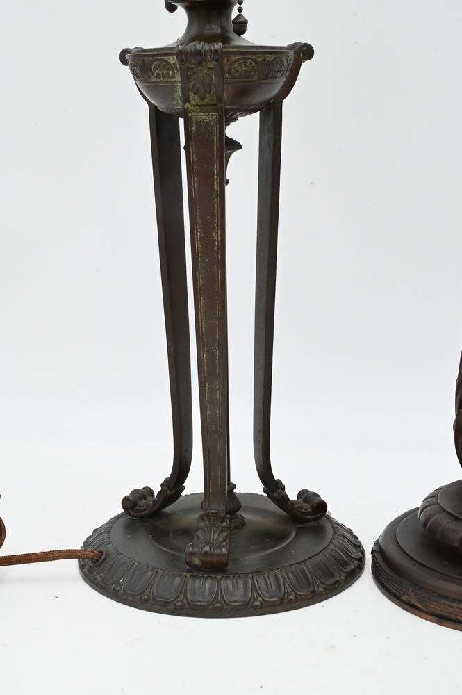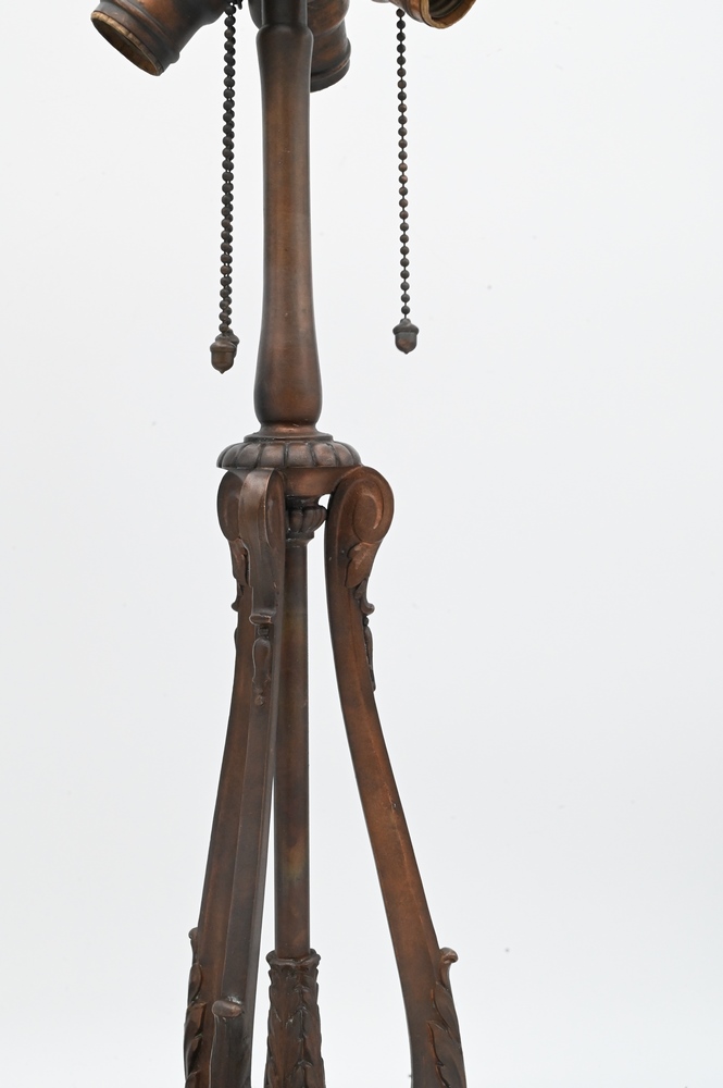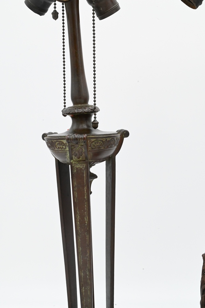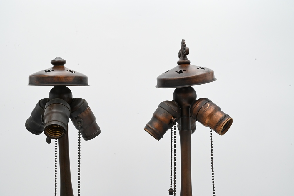 Group of Three Handel Table Lamp Bases, each having three sockets with acorn pulls; one repaired, tallest 25 inches.