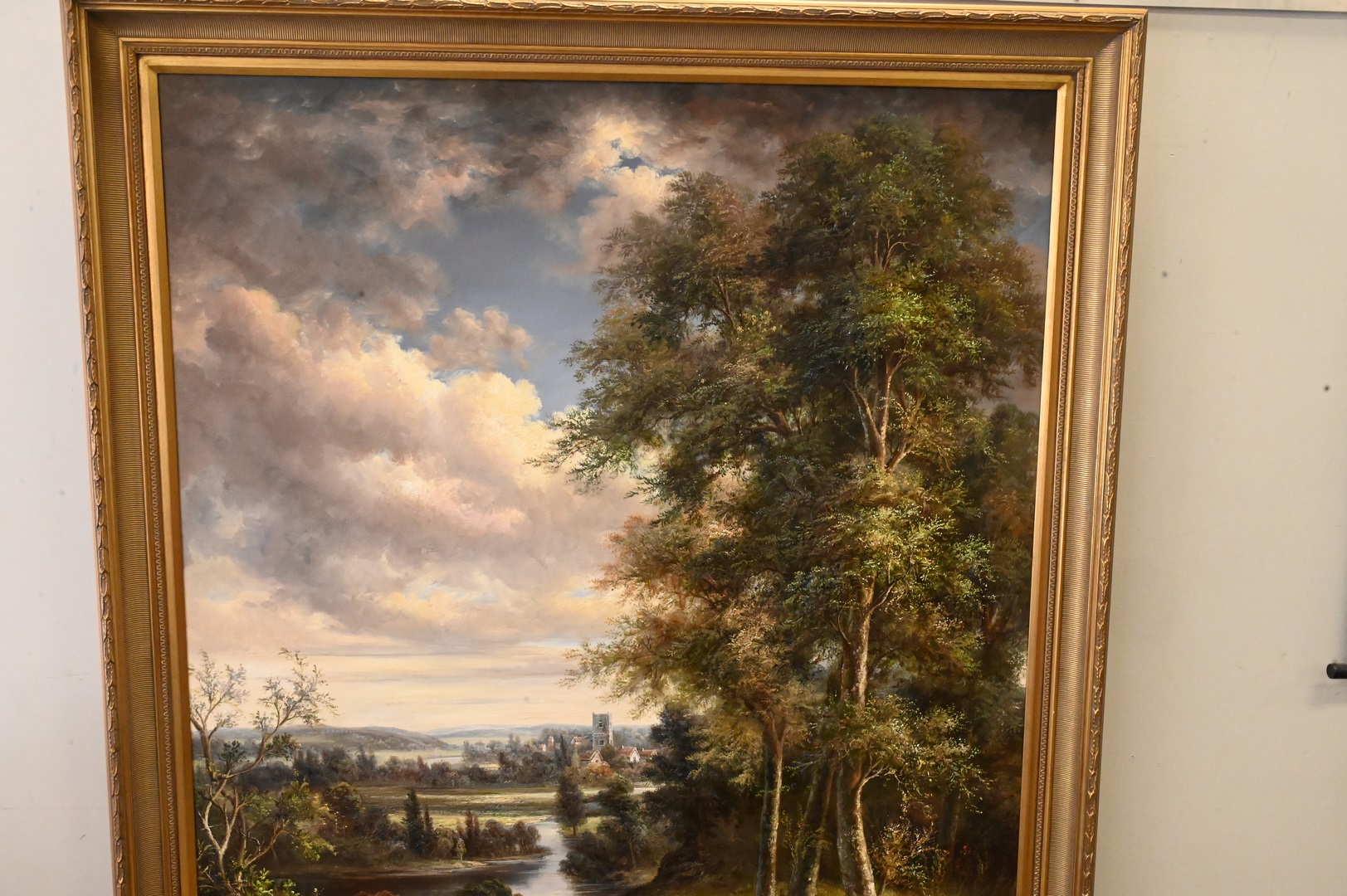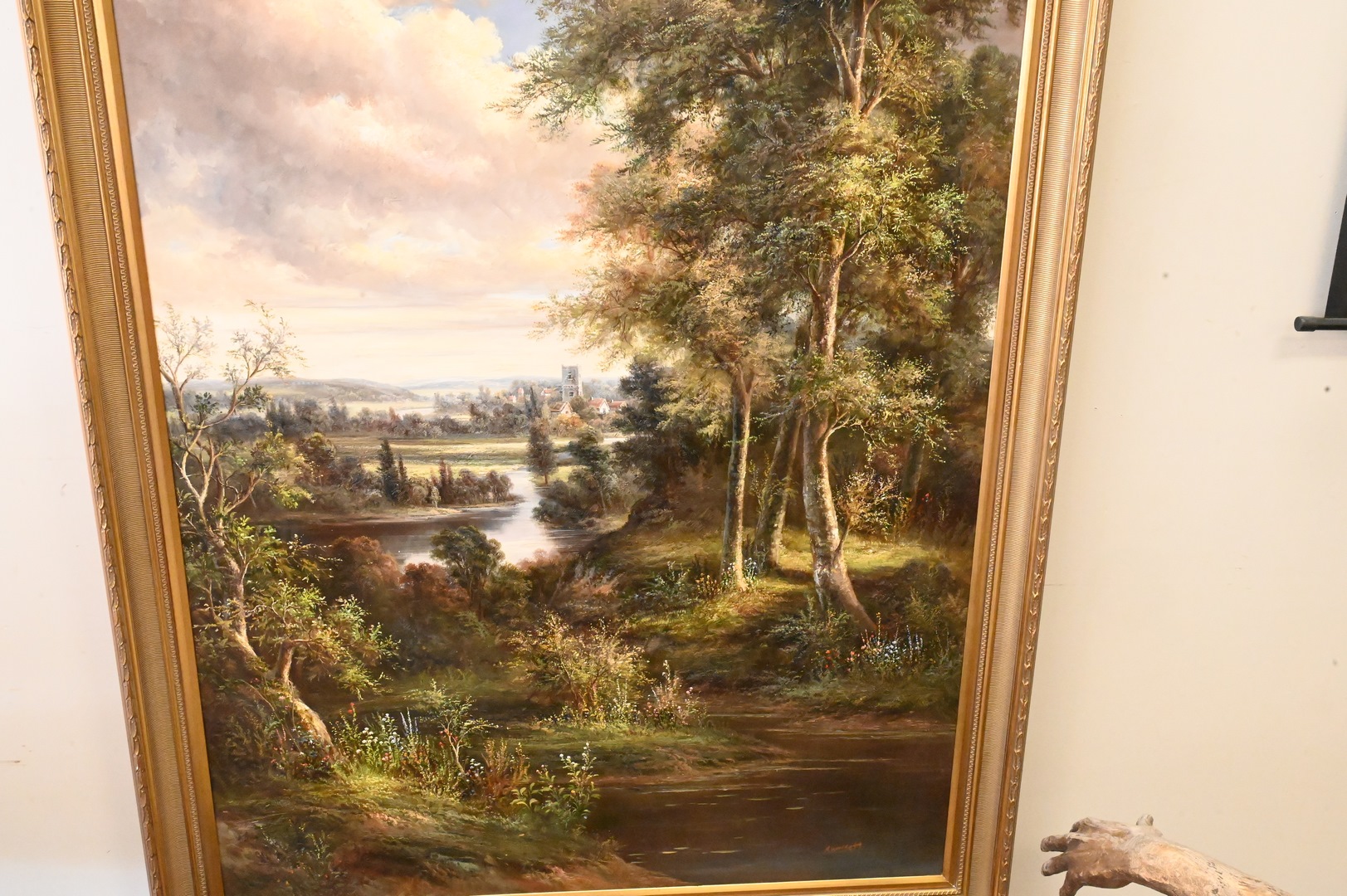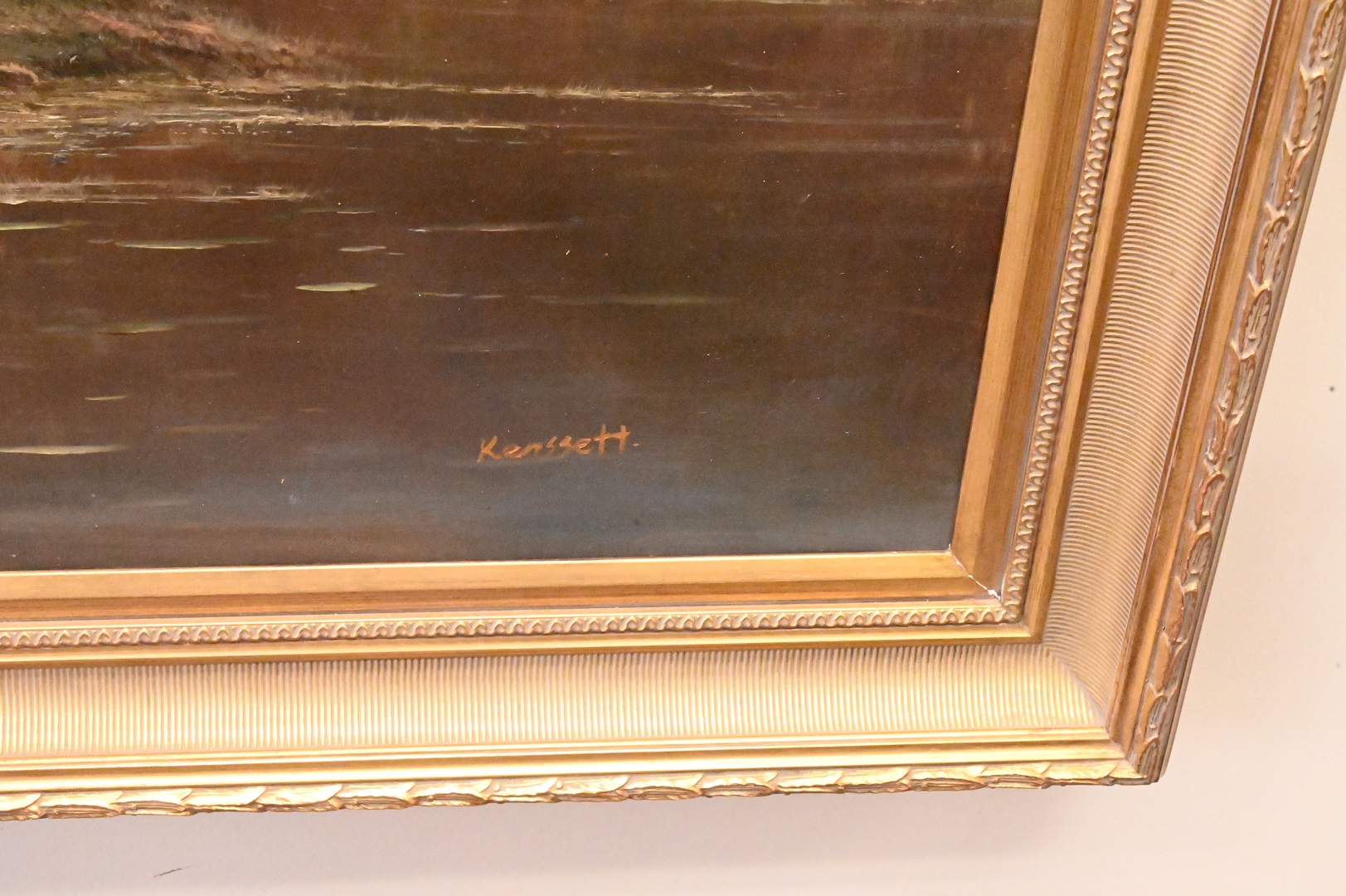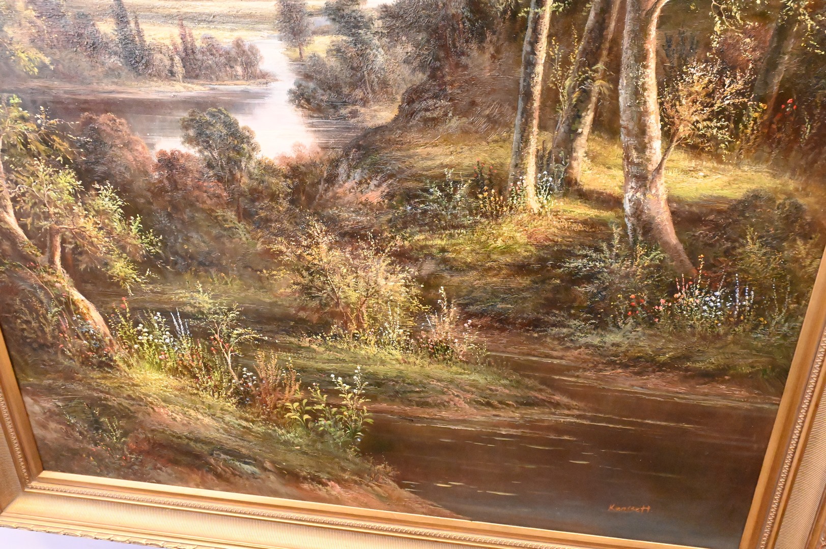 Large Continental Landscape, oil on canvas, having wooded foreground and river leading to a small village, signed lower right “Kensett”, in ornate gilt frame, 72″ x 48″.