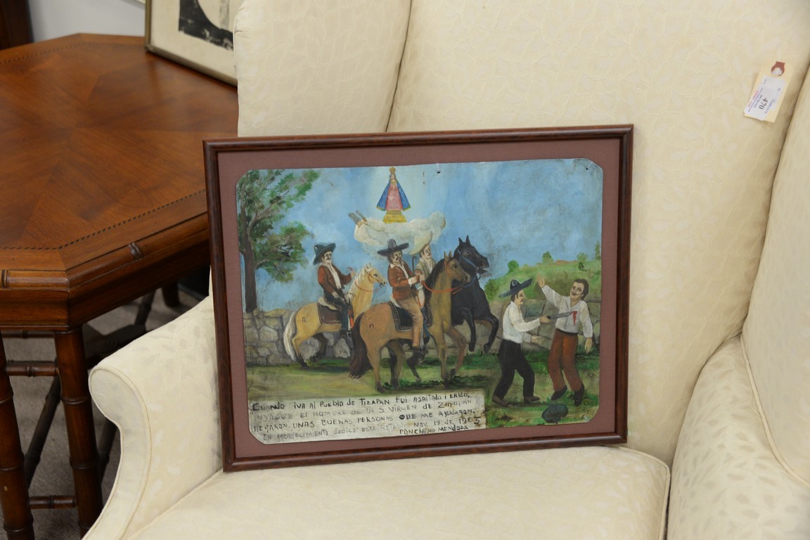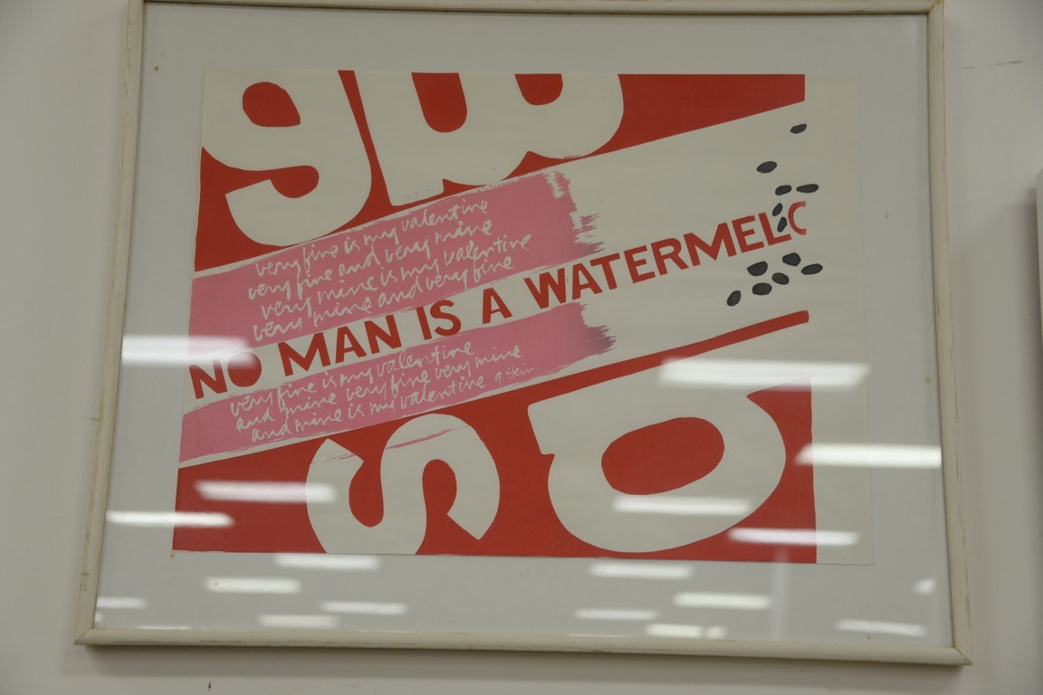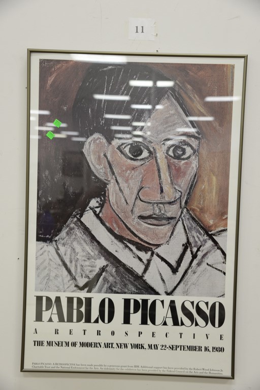 Large group of fourteen miscellaneous lithographs, prints, and paintings to include Clive Van der Berg monotype untitled, No Man is a Watermelon poster/lithograph, Pablo Picasso printed poster, R. Angilock 1985 mountainside 68/75, oil on canvas of a man signed Rose, oil on canvas bust of a man initialed, oil on tin, etc. sizes: 8 1/2 x 11 1/2 to 35 3/4 23 1/2