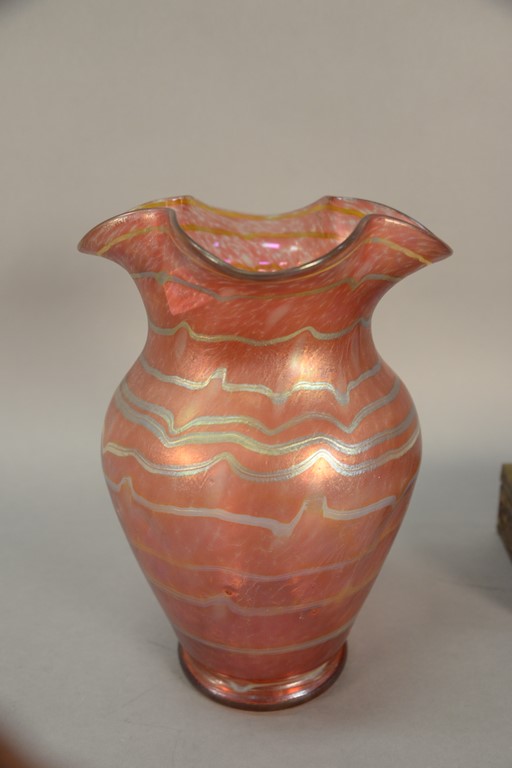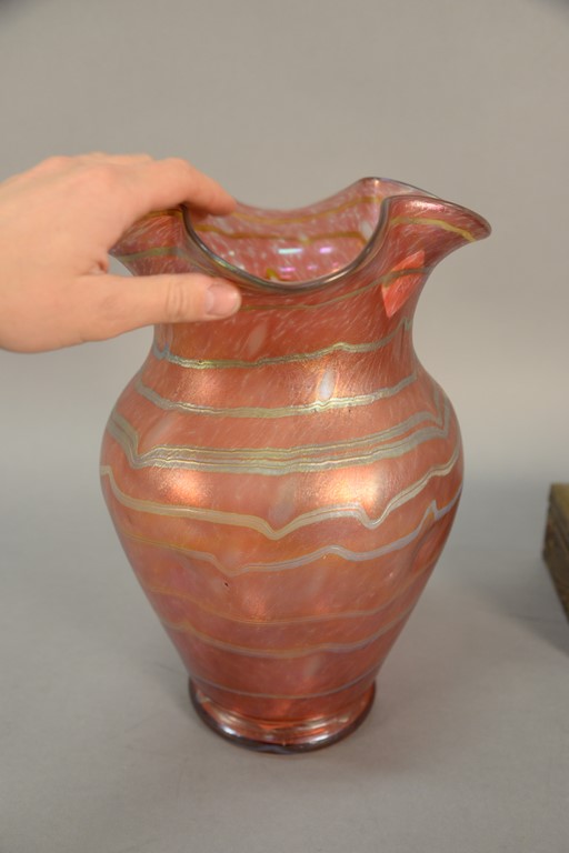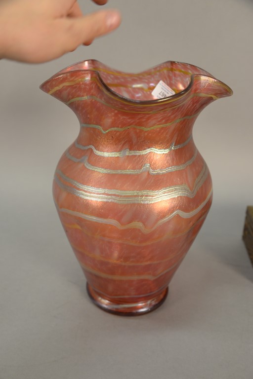 Large Loetz art glass vase, red iridescent with ruffle rim. ht. 15in., dia. 9 3/4in. This is actually Fritz Heckert, in changeant decor flaring, ruffled rim with pulled bands