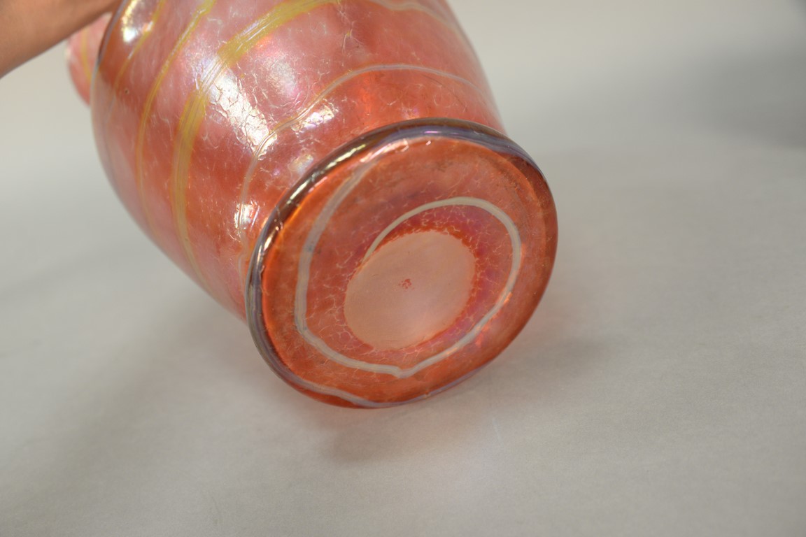 Lot 467: Large Loetz art glass vase, red iridescent with ruffle rim. ht. 15in., dia. 9 3/4in. This is actually Fritz Heckert, in changeant…