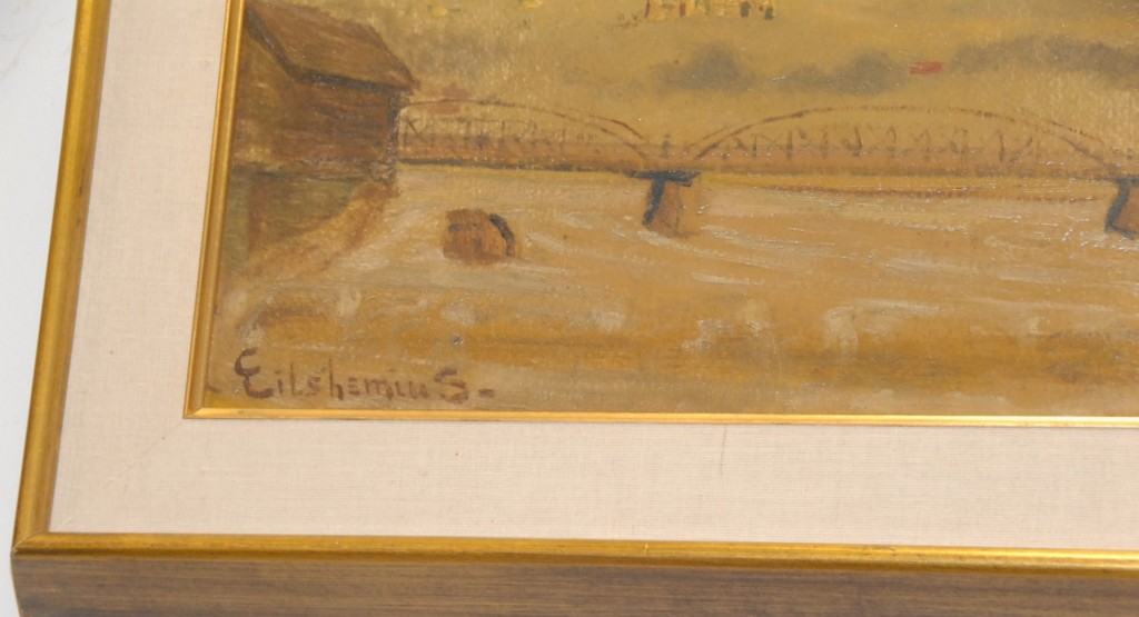 LOUIS EILSHEMIUS AM 1864-1941 LANDSCAPE WITH BRIDGE oil on masonite signed lower left Eilshemius 11 1/2 x 25