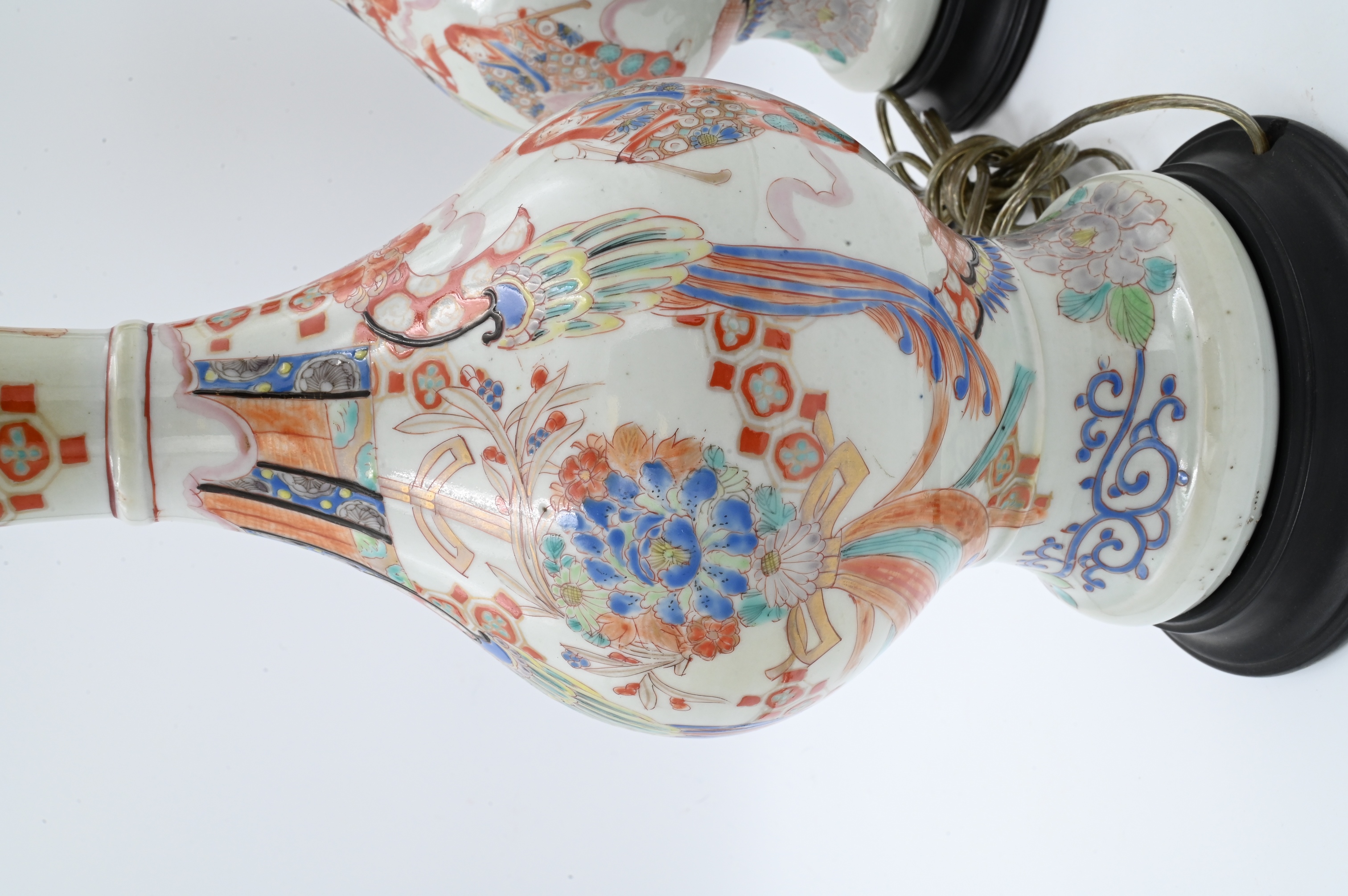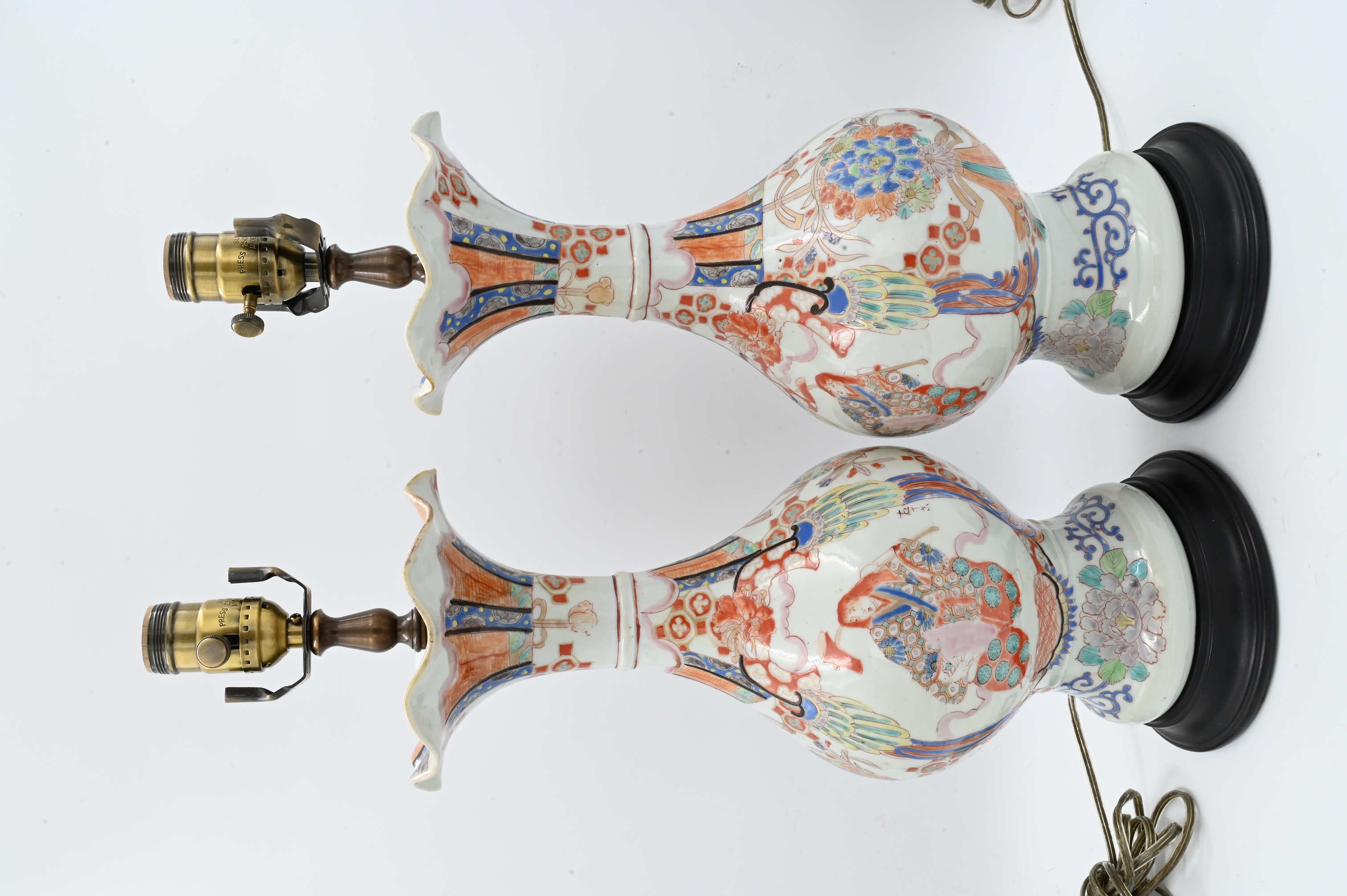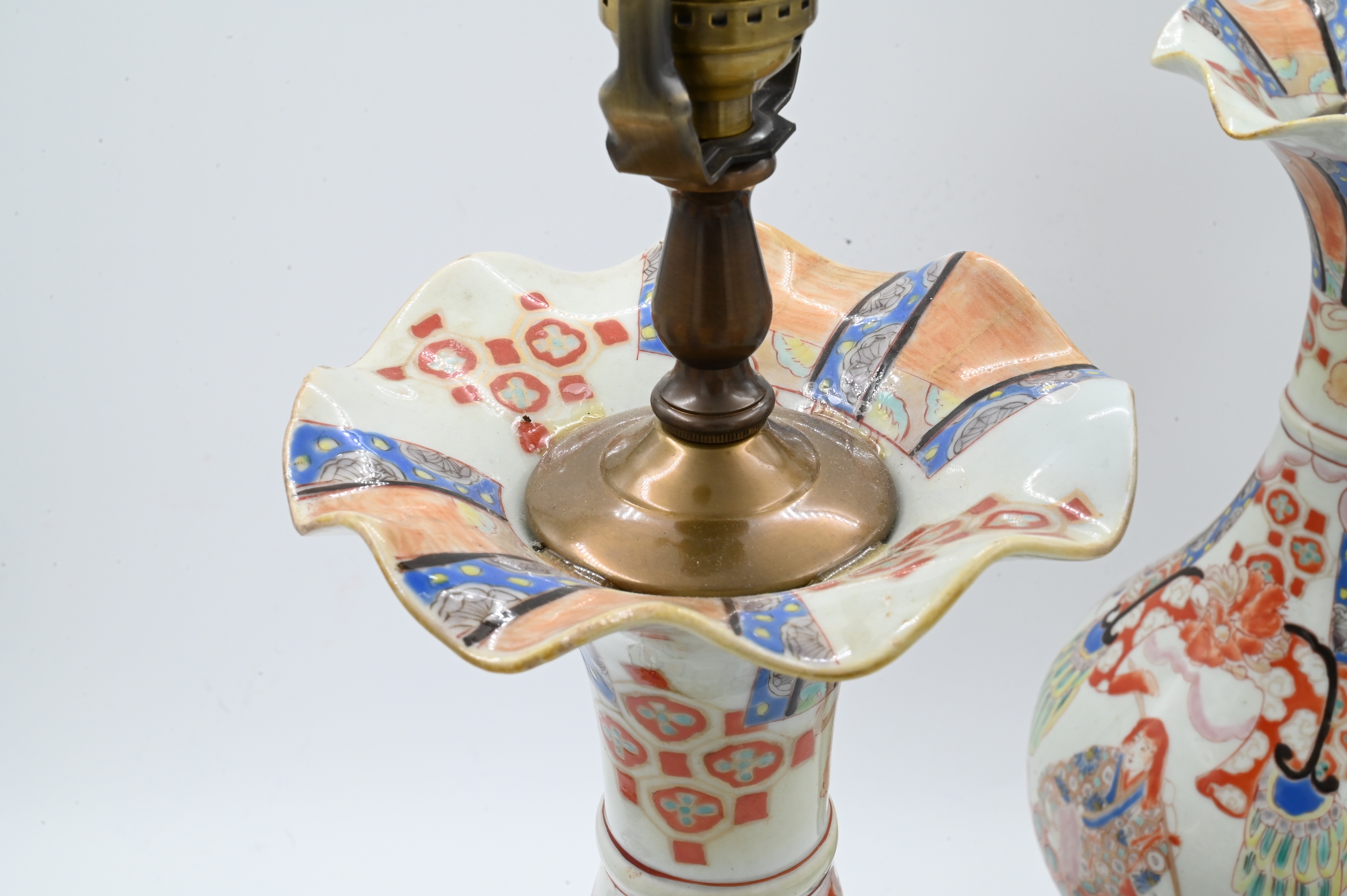 Meiji style having scalloped trumpet mouths and decorated with ceremonial flower motifs, now mounted as lamps