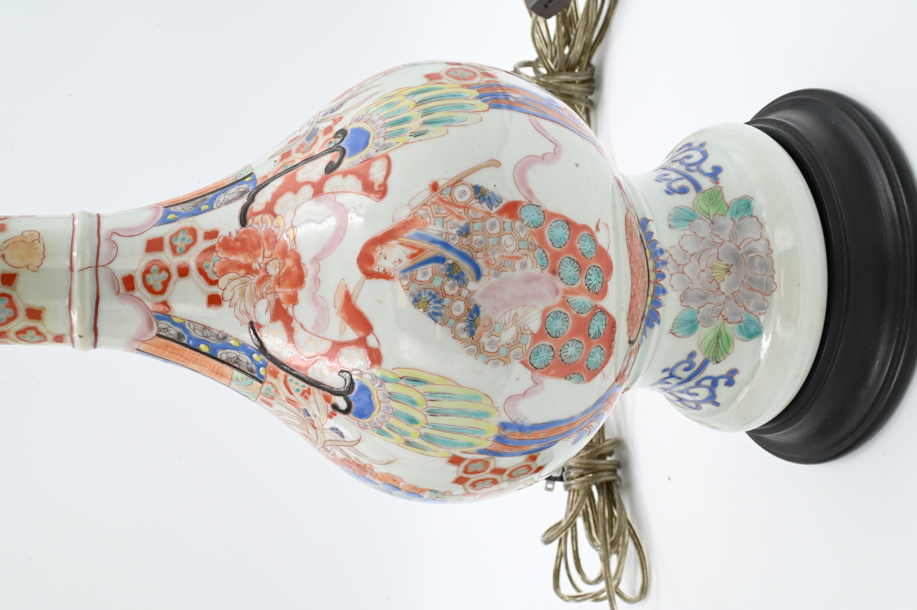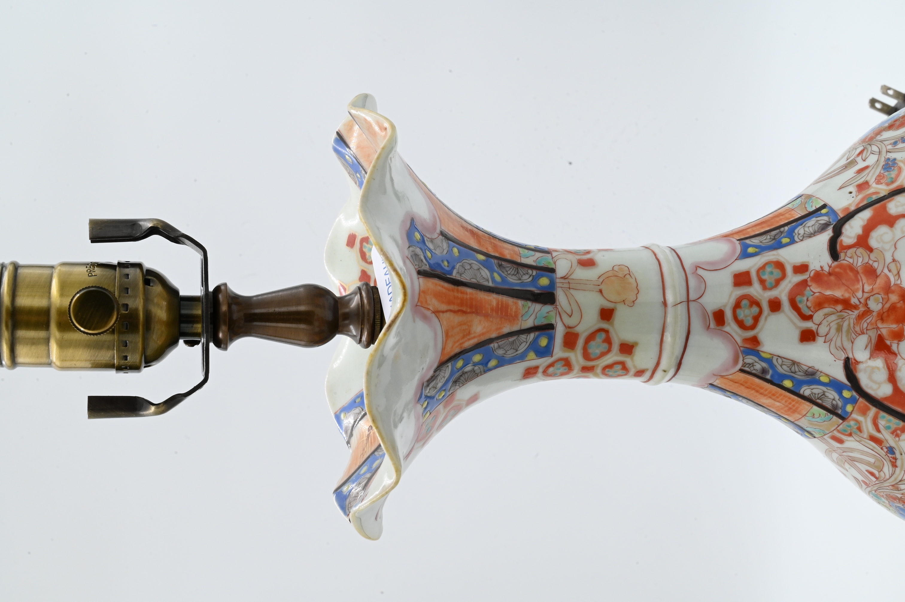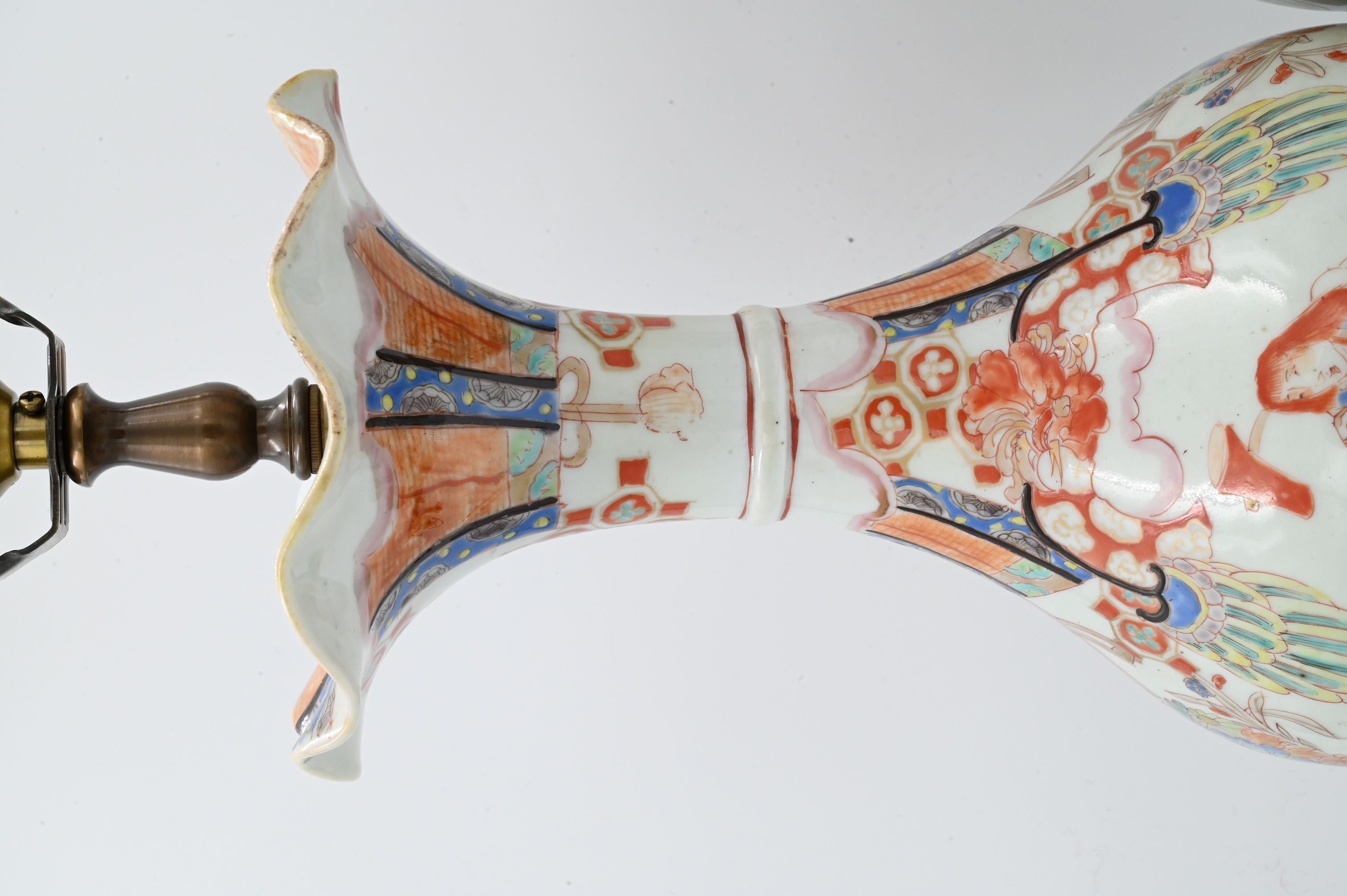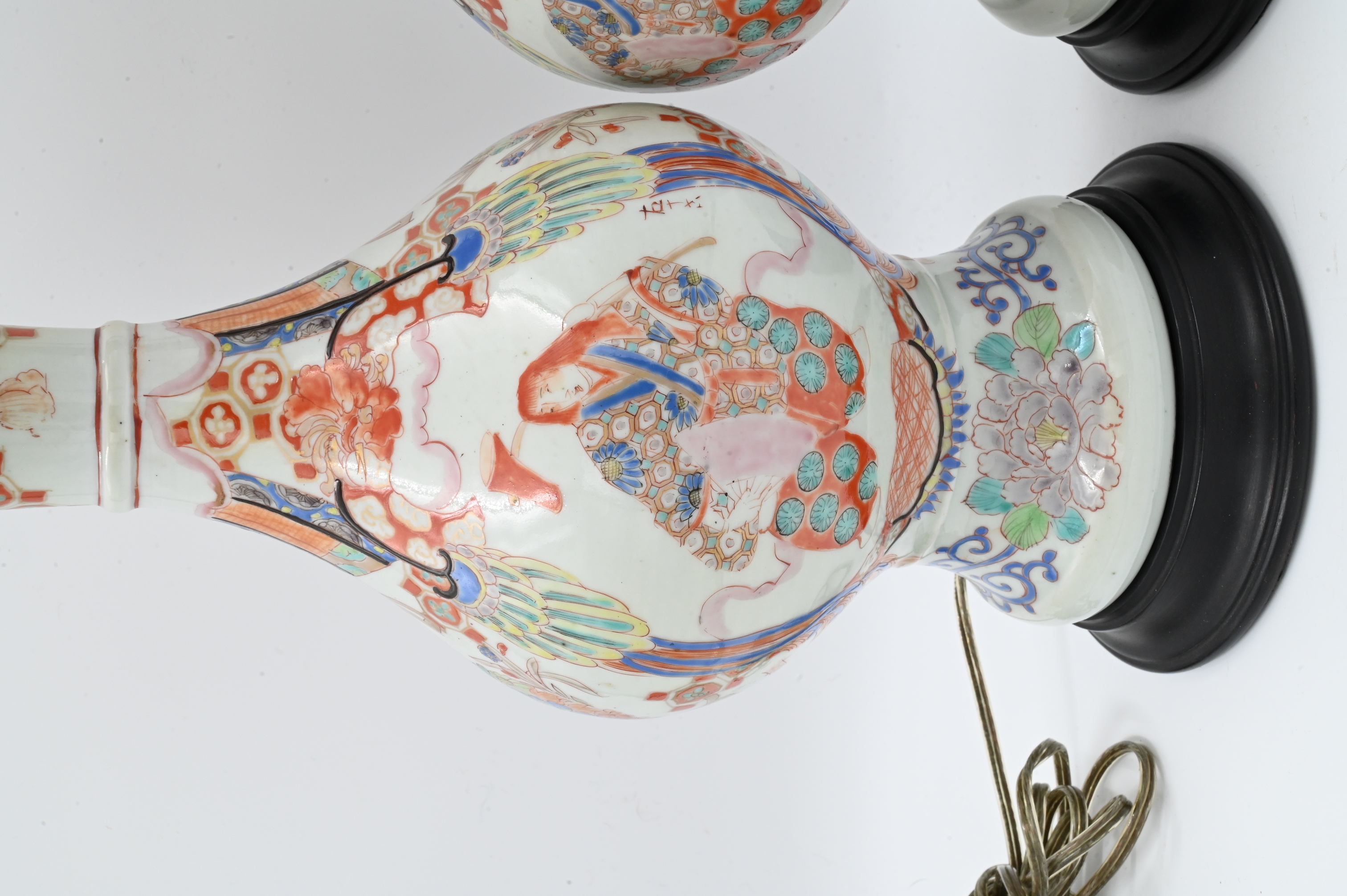 Meiji style having scalloped trumpet mouths and decorated with ceremonial flower motifs, now mounted as lamps