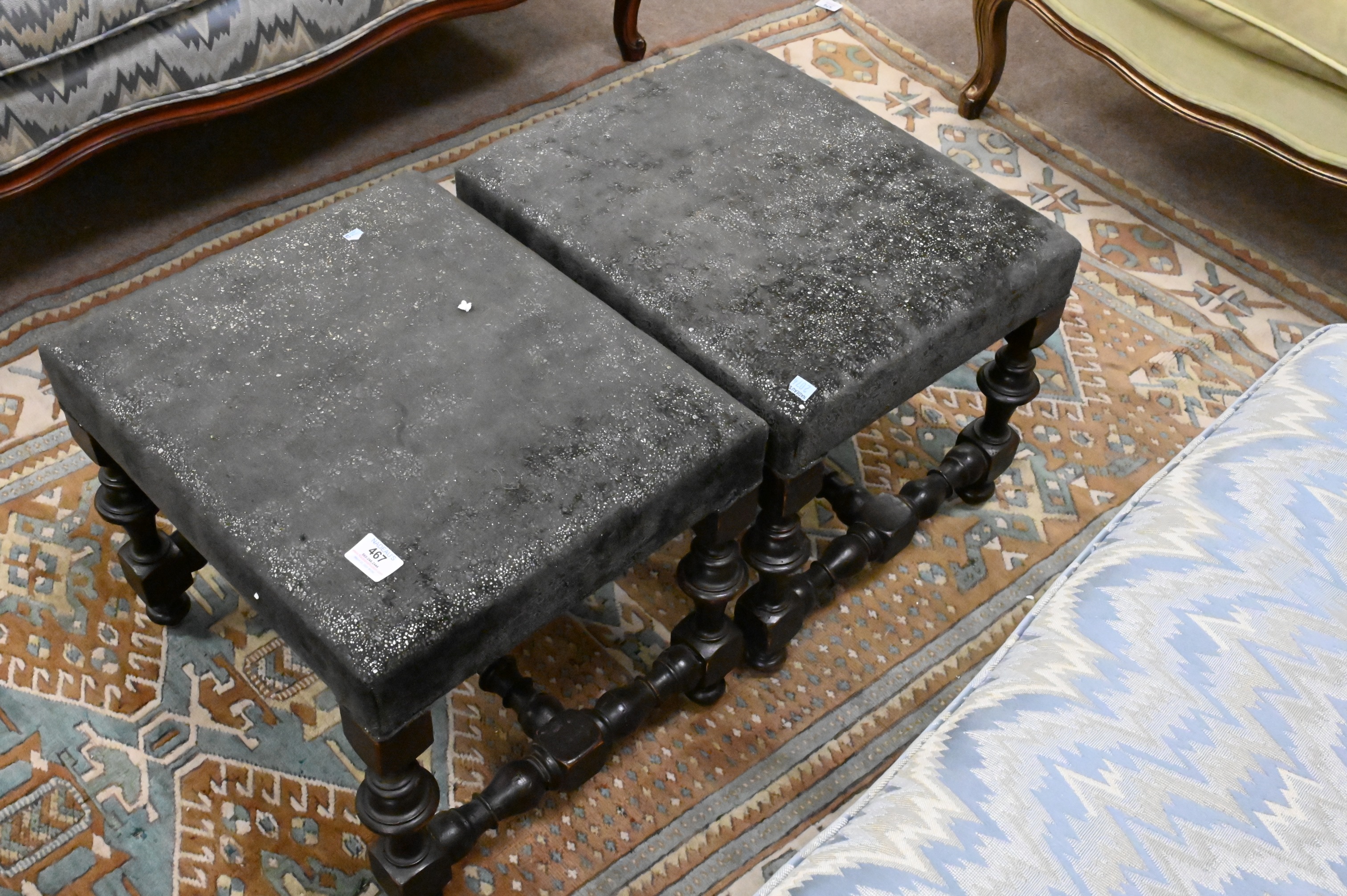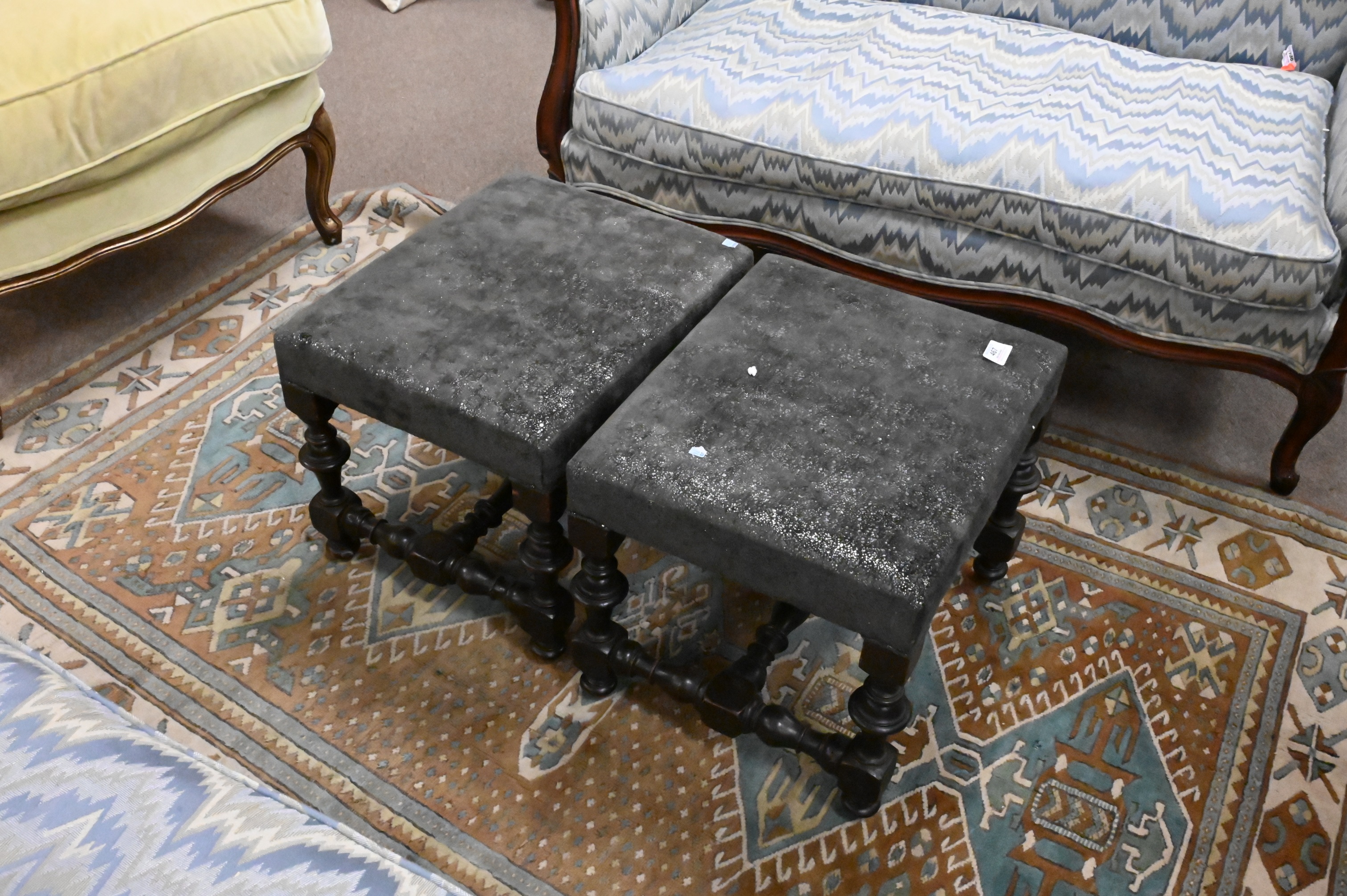 Pair of Queen Anne Style Stools, having turned legs and stretcher, height 15 inches, top 15″ x 18″.