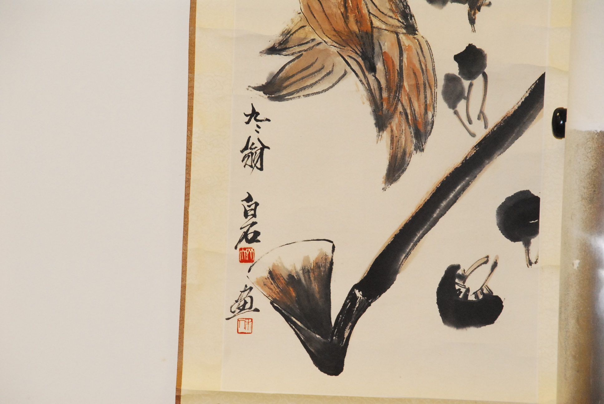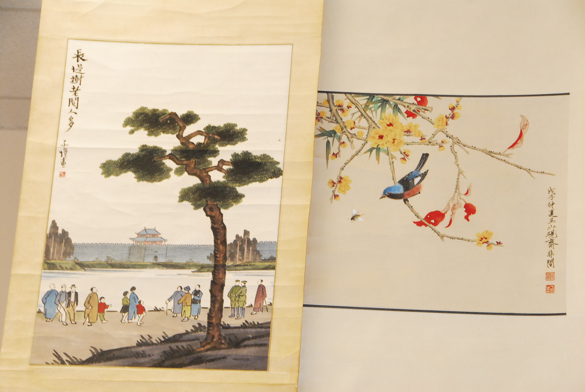 Three Oriental scrolls watercolor on paper landscape 26 x 18, watercolor on paper birds and bug 17 x 20, and watercolor on paper paint brushes 26 x 12.