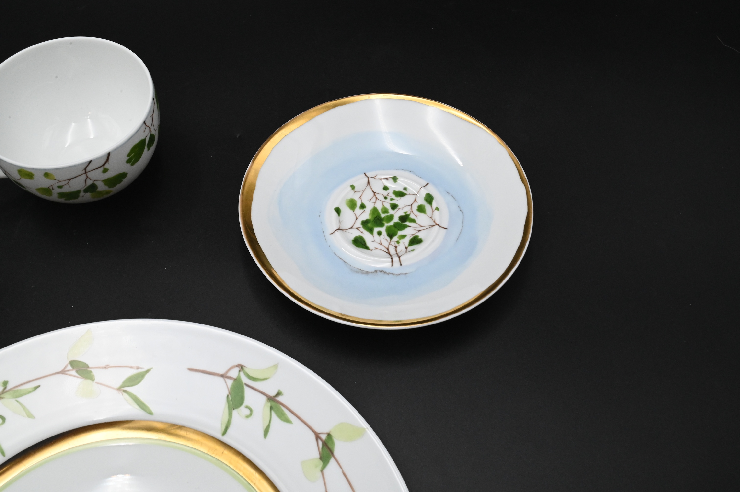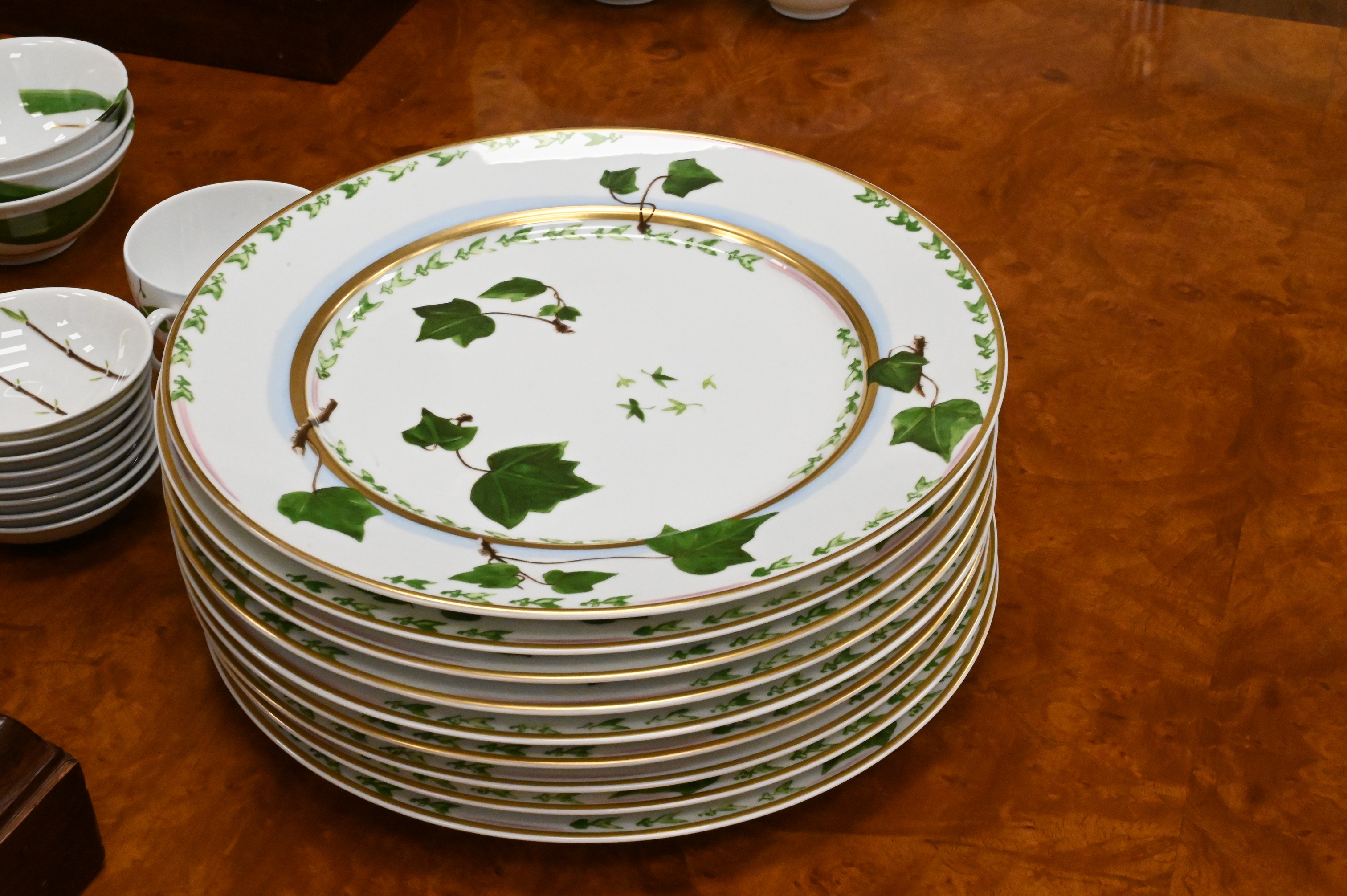 sixteen buffet plates (10 3/4 inches), sixteen salad plates (9 inches), nine service plates (11 1/2 inches), sixteen soup plates (8 1/4 inches), three oval platters (length 16 1/2 inches), three serving bowls (9 3/4 inches), four serving bowls (11 3/4 inches), sixteen teacups, sixteen saucers (6 1/2 inches), two oval vegetable dishes (length 9 1/8 inches each), eight finger bowls (4 inches), eight spoons, eight spoon rests, nine ice cream bowls (5 inches), 16 bread plates (6 1/2 inches), one teapot, one sugar bowl, one creamer, nine vegetable bowls (7 inches)