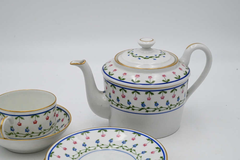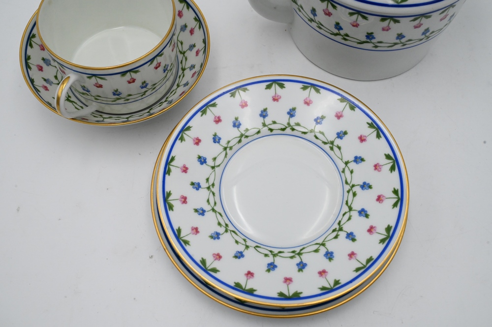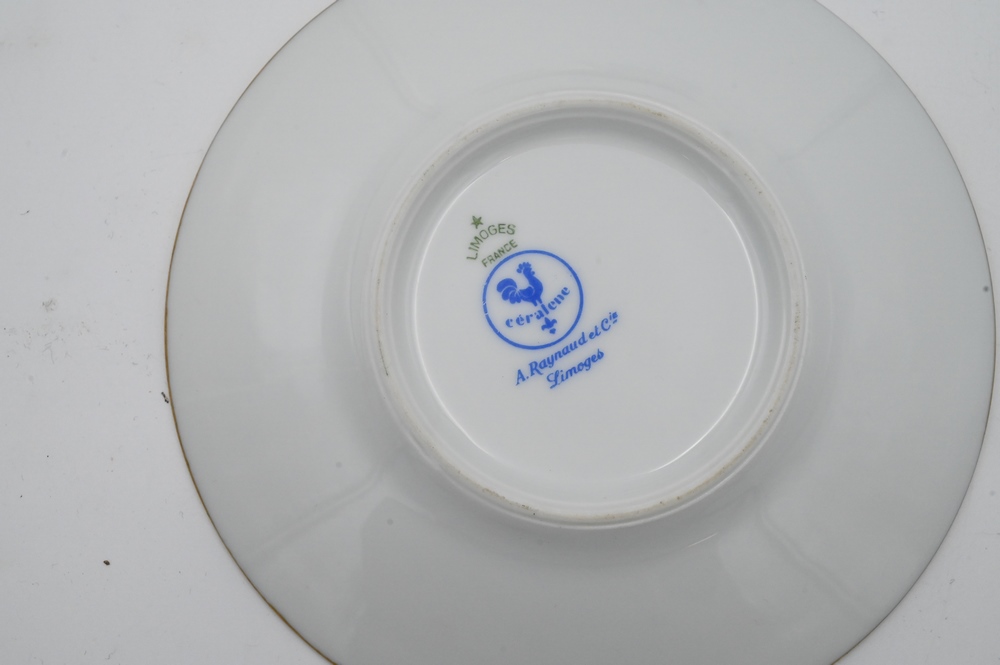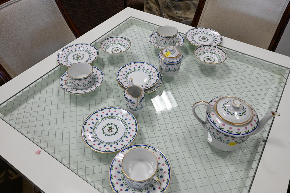 Lot 468: 21 Piece Set of A. Raynaud Limoges “LaFayette” Porcelain Coffee Setting, to include 5 dessert plates, 5 tea saucers, 4 tea cups, 4 finger bowls, 1 creamer, 1 sugar, 1 teapot, all marked Limoges, Ceralene A. Raynaud on bottom, length 6.5 inches.