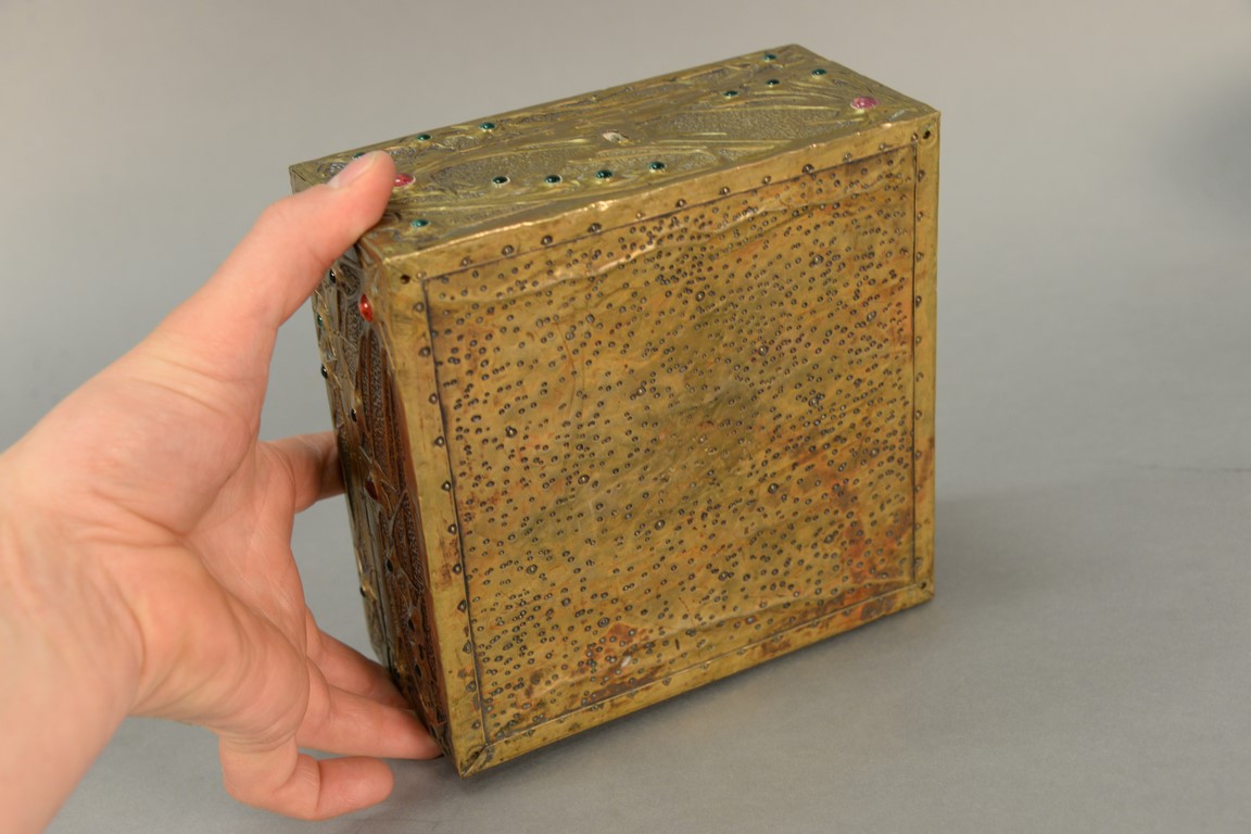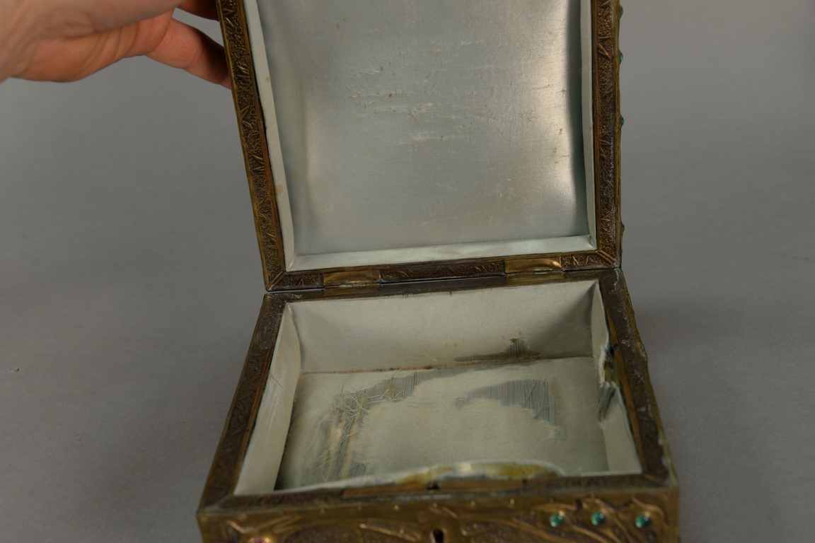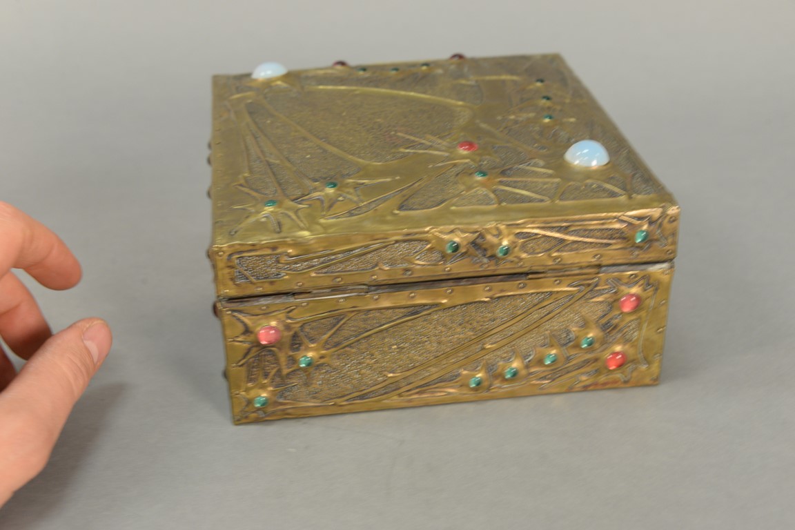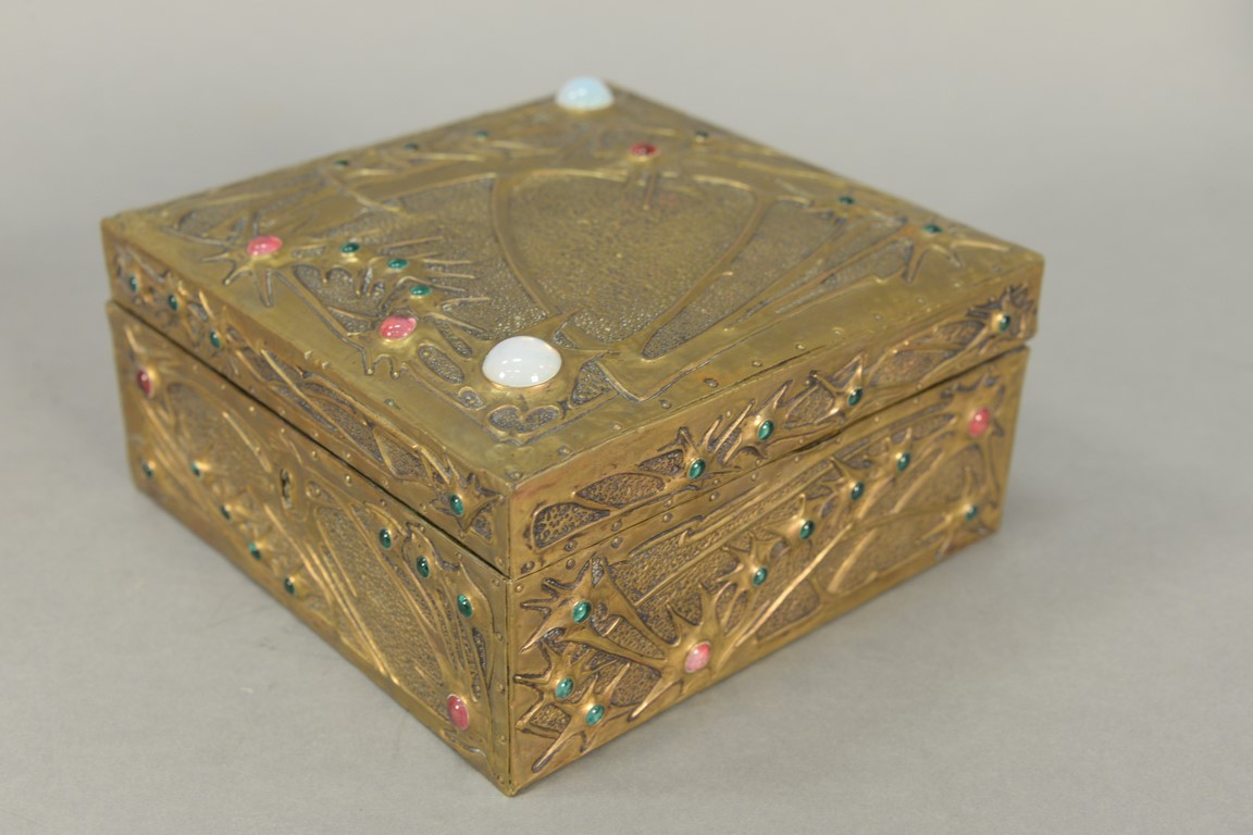 Lot 468: Alfred Daguet 1875-1942 repousse brass vanity box with jeweled glass cabochons and silk interior. ht. 4 1/2in., top: 7 x 7