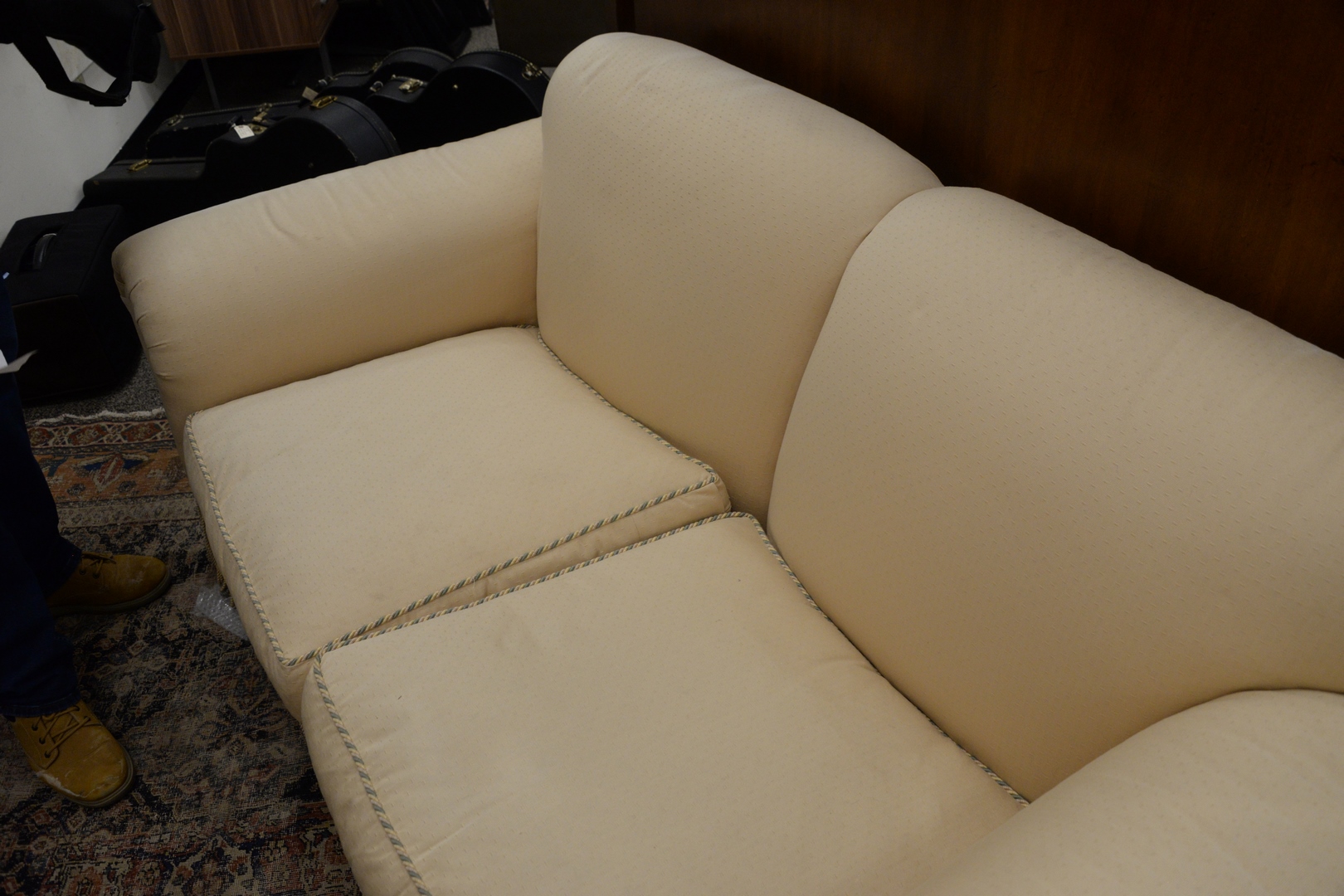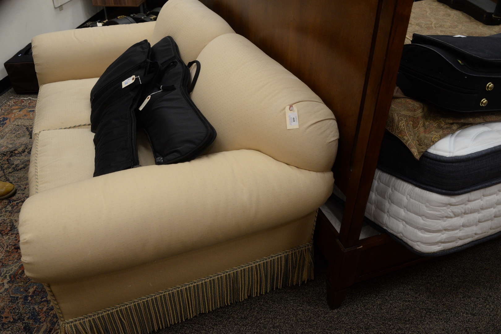 Custom Upholstered Loveseat, having two cushions with fringe, 32″ x 71″ x 37″.