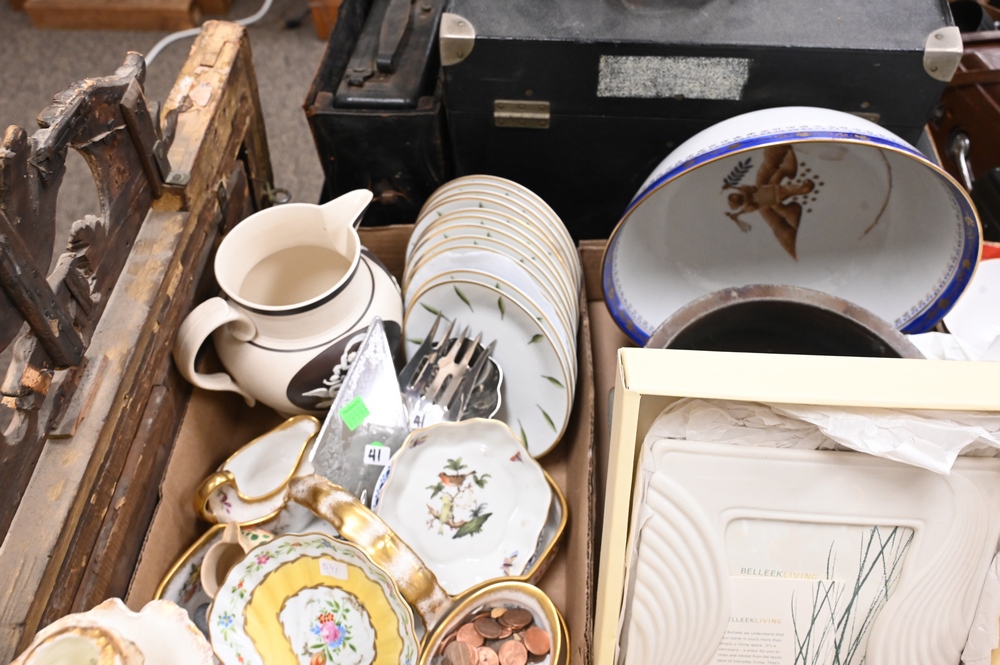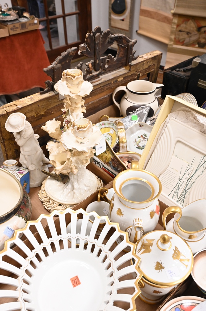 Lot 468: Eight Tray Lots of Assorted Porcelain and Ceramic Items, to include Roseville pottery, Bluehill bowl, Napoleon porcelain set, bowls, etc.