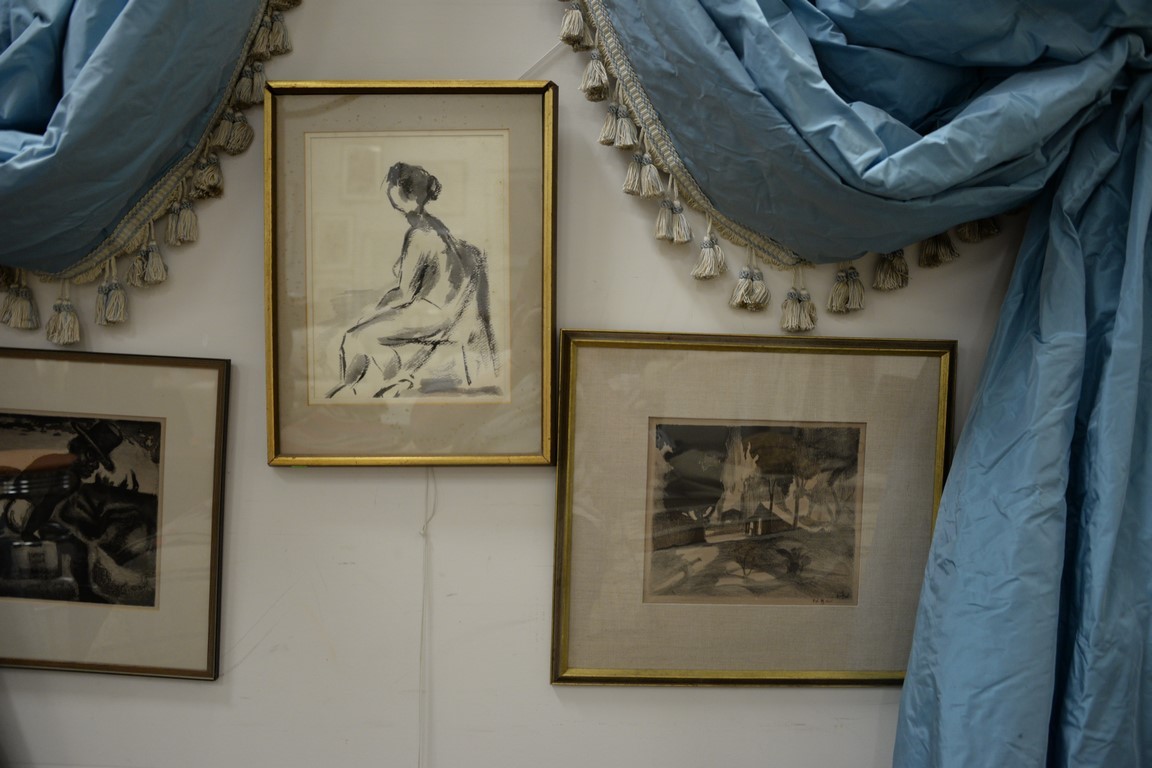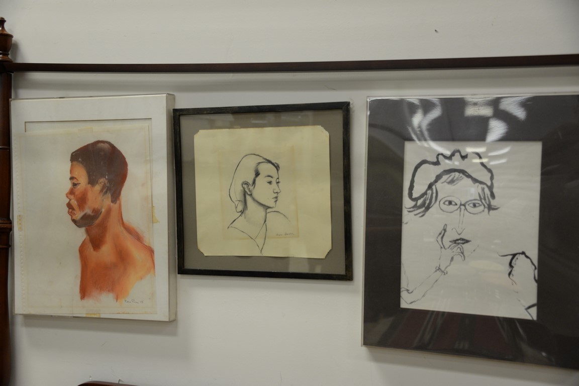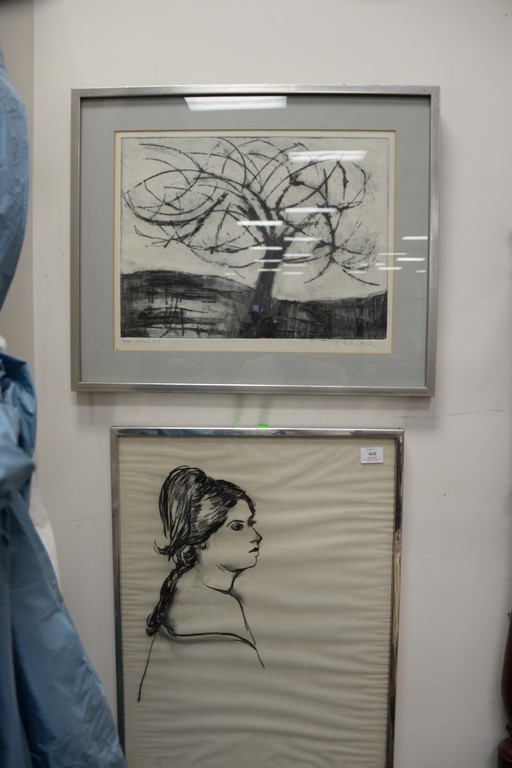 Lot 468: Group of eleven lithographs, etchings, and drawings including Lily Ente, Tree etching by Sheila, 2 Woman in a Chair signed illeg…