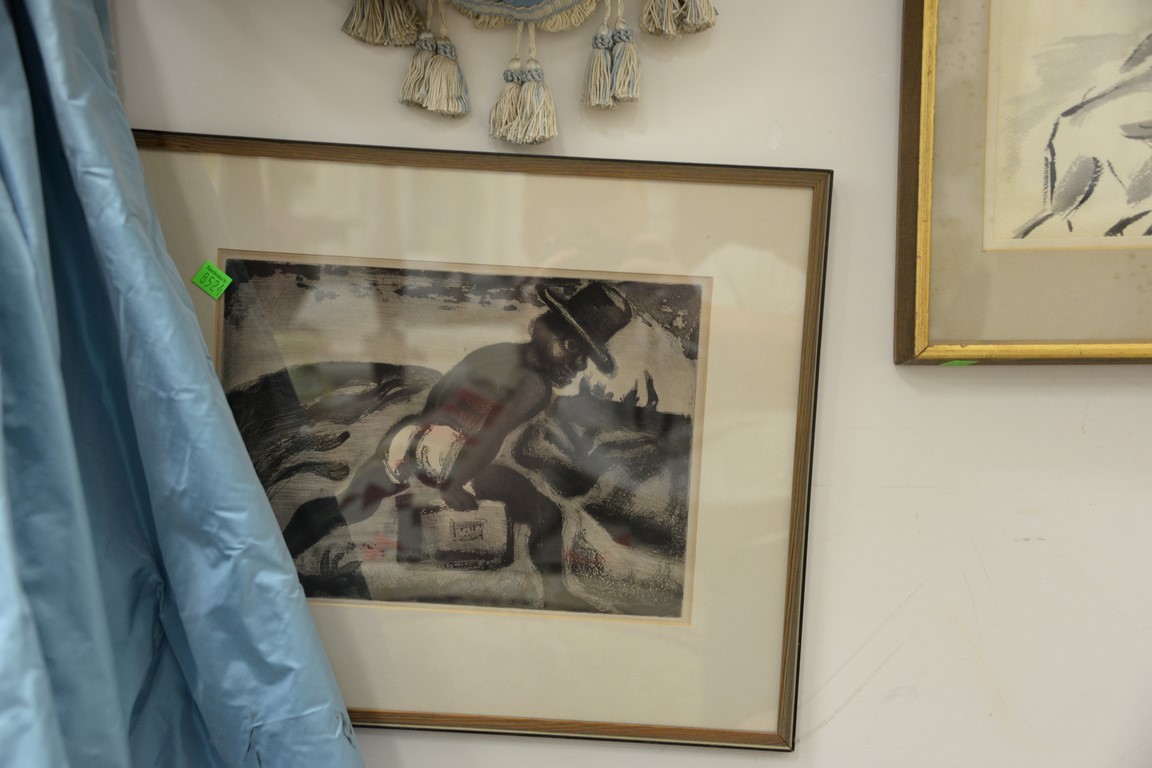 Group of eleven lithographs, etchings, and drawings including Lily Ente, Tree etching by Sheila, 2 Woman in a Chair signed illegibly, Man with Case initialed S.B. 1928, House in the woods signed illegibly, and five watercolor and pencil sketches. 8 1/2 x 10 to 24 3/4 x 18 3/4