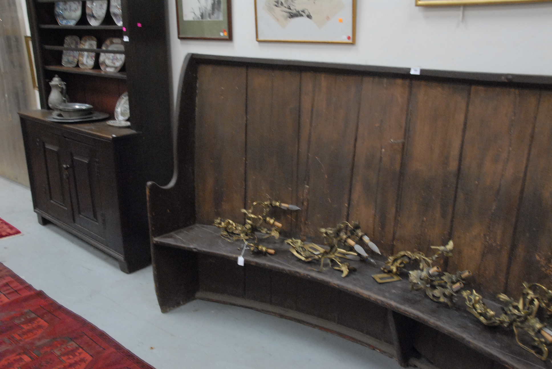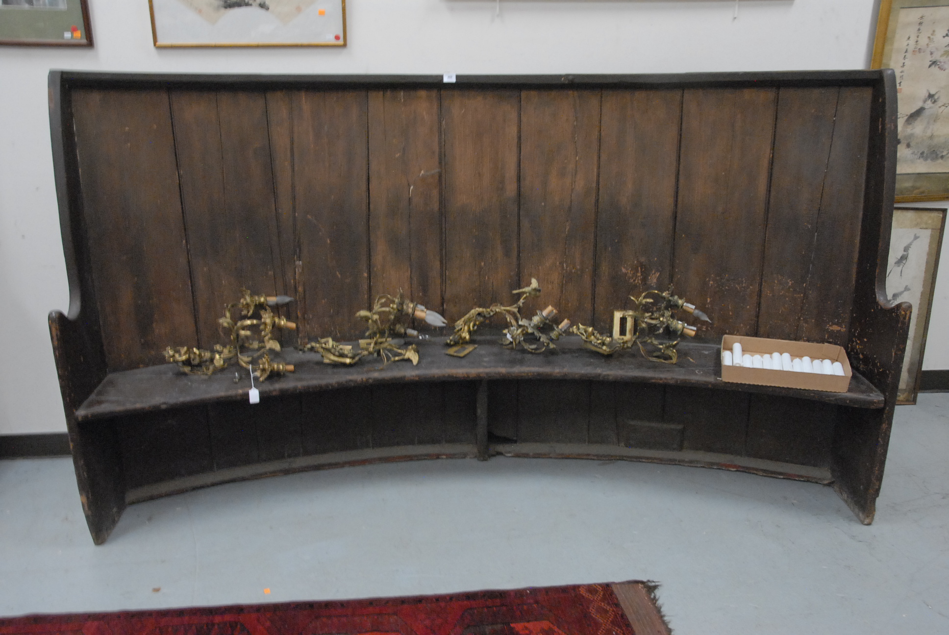 Lot 468: Primitive settle bench, rounded form with crackled brown paint, 18th-19th century. ht. 54in. wd. 97in.