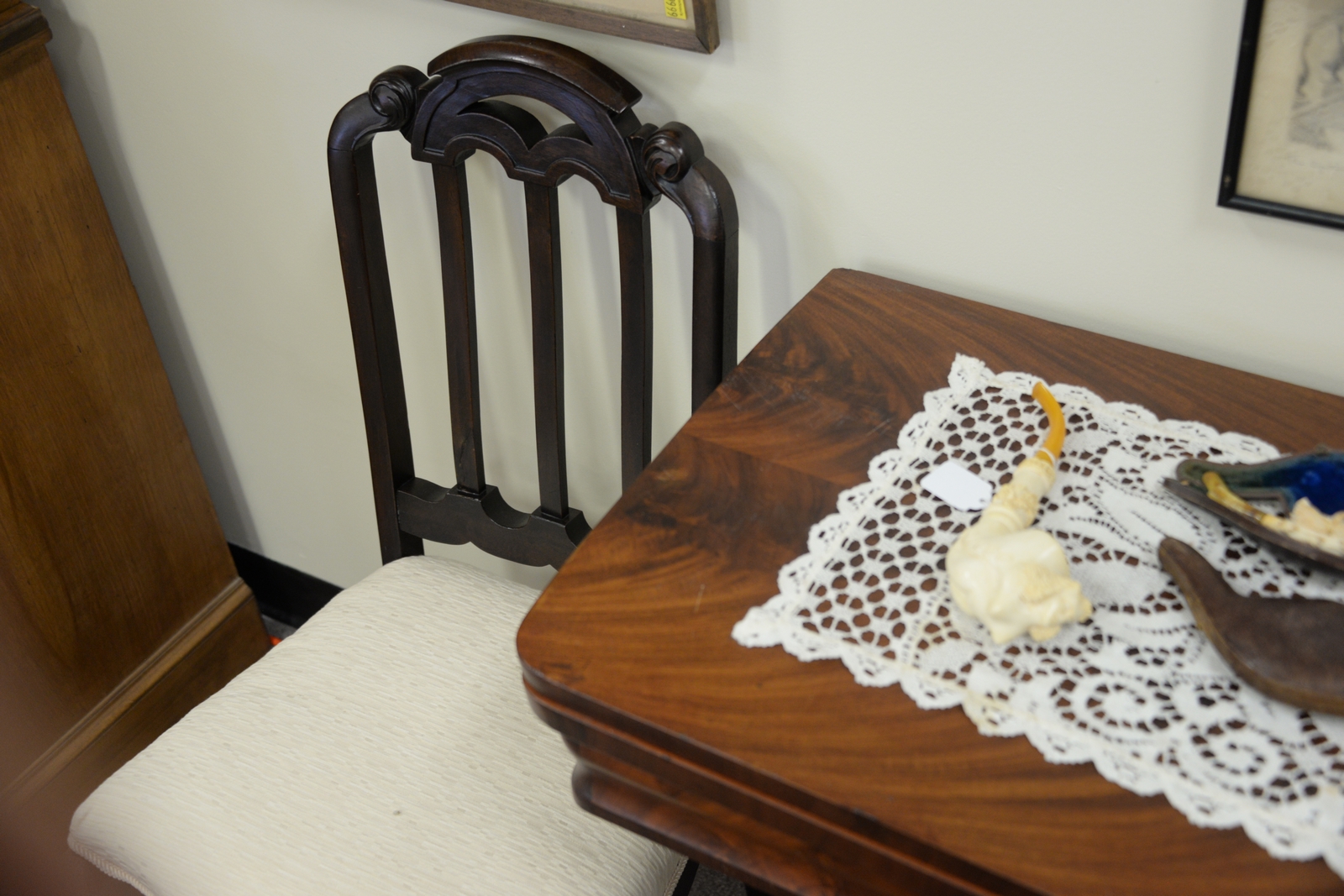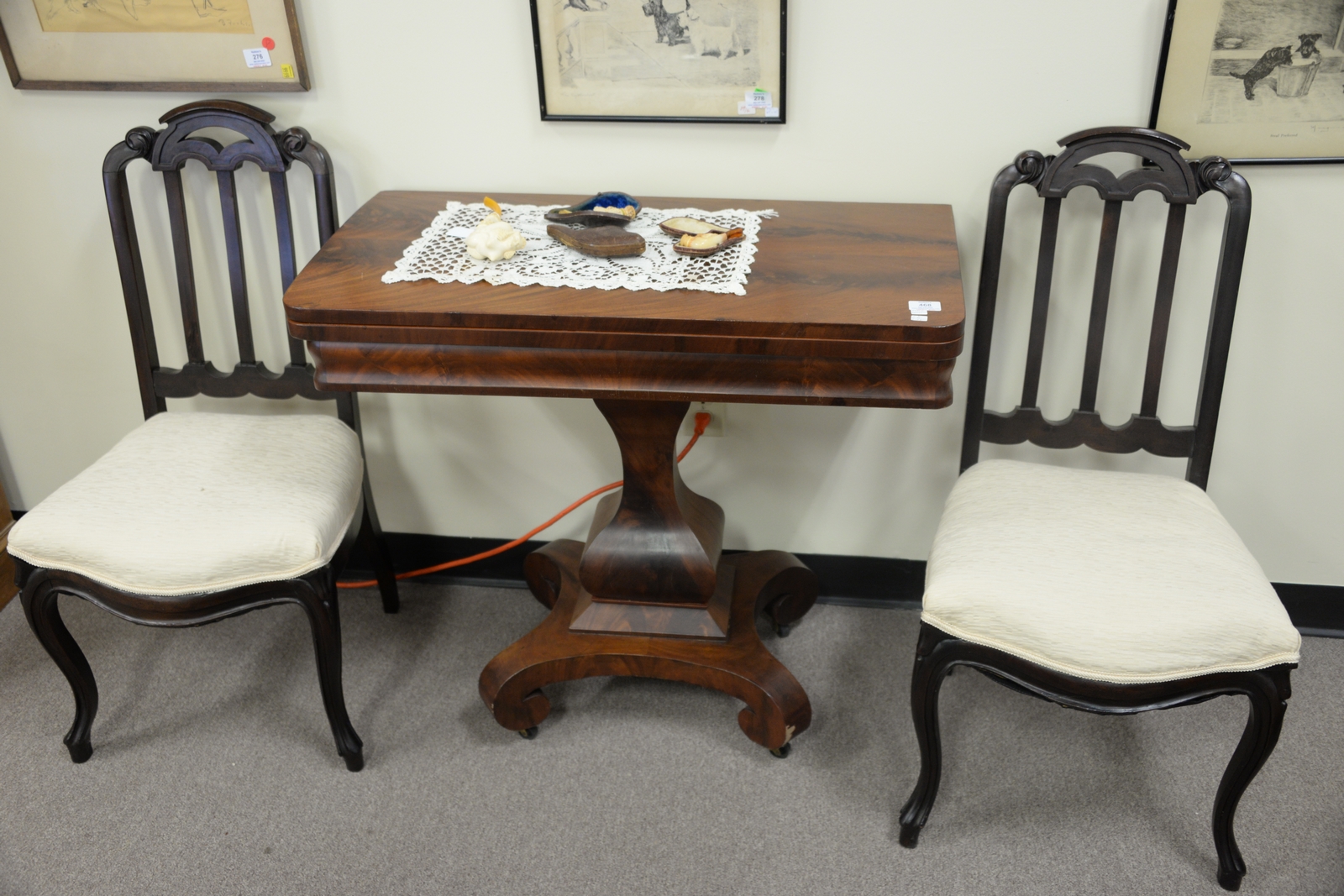 Lot 468: Three piece lot including Empire game table and pair of side chairs. ht. 30in., wd. 34in., dp. 16 1/2in.