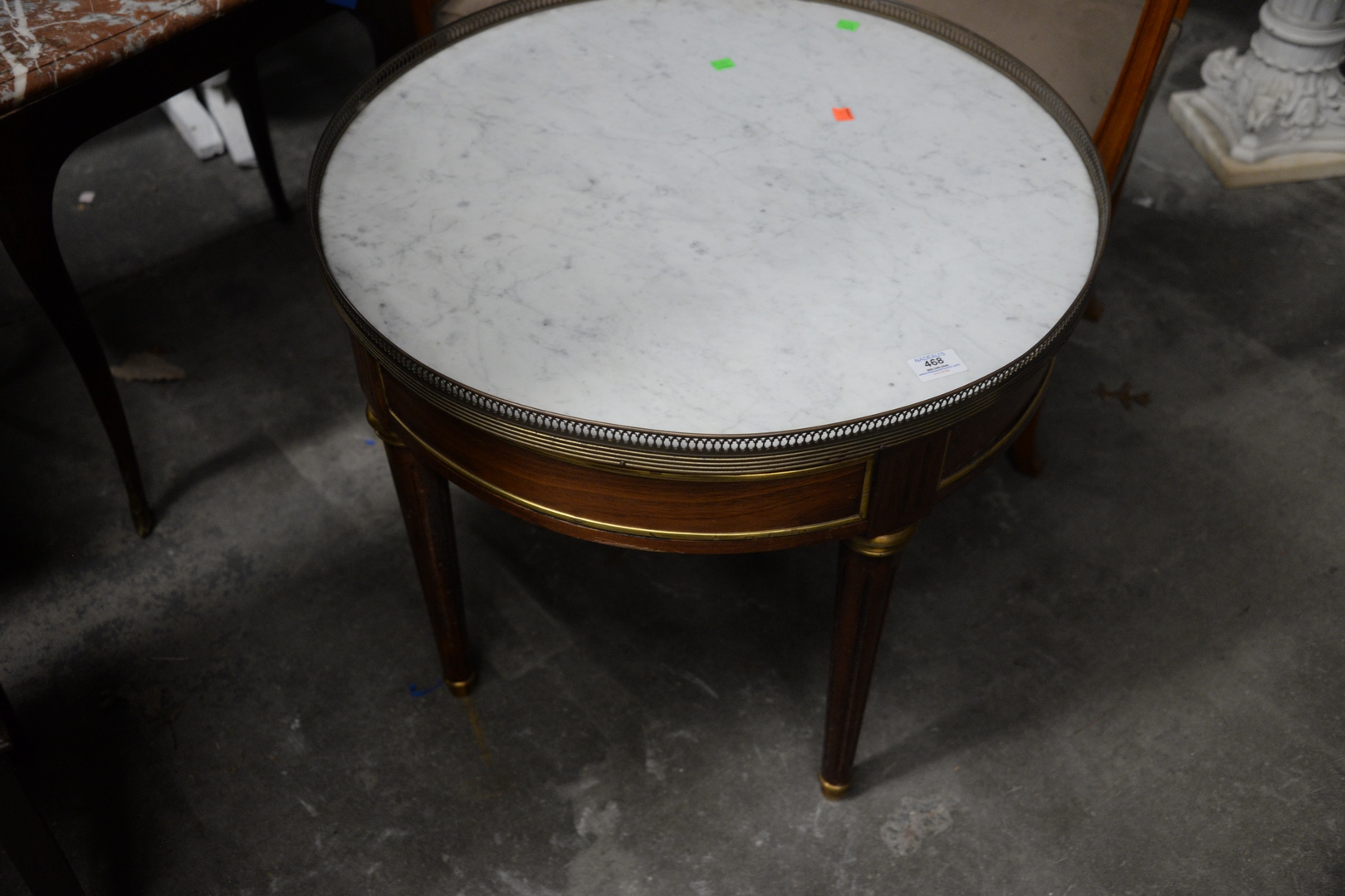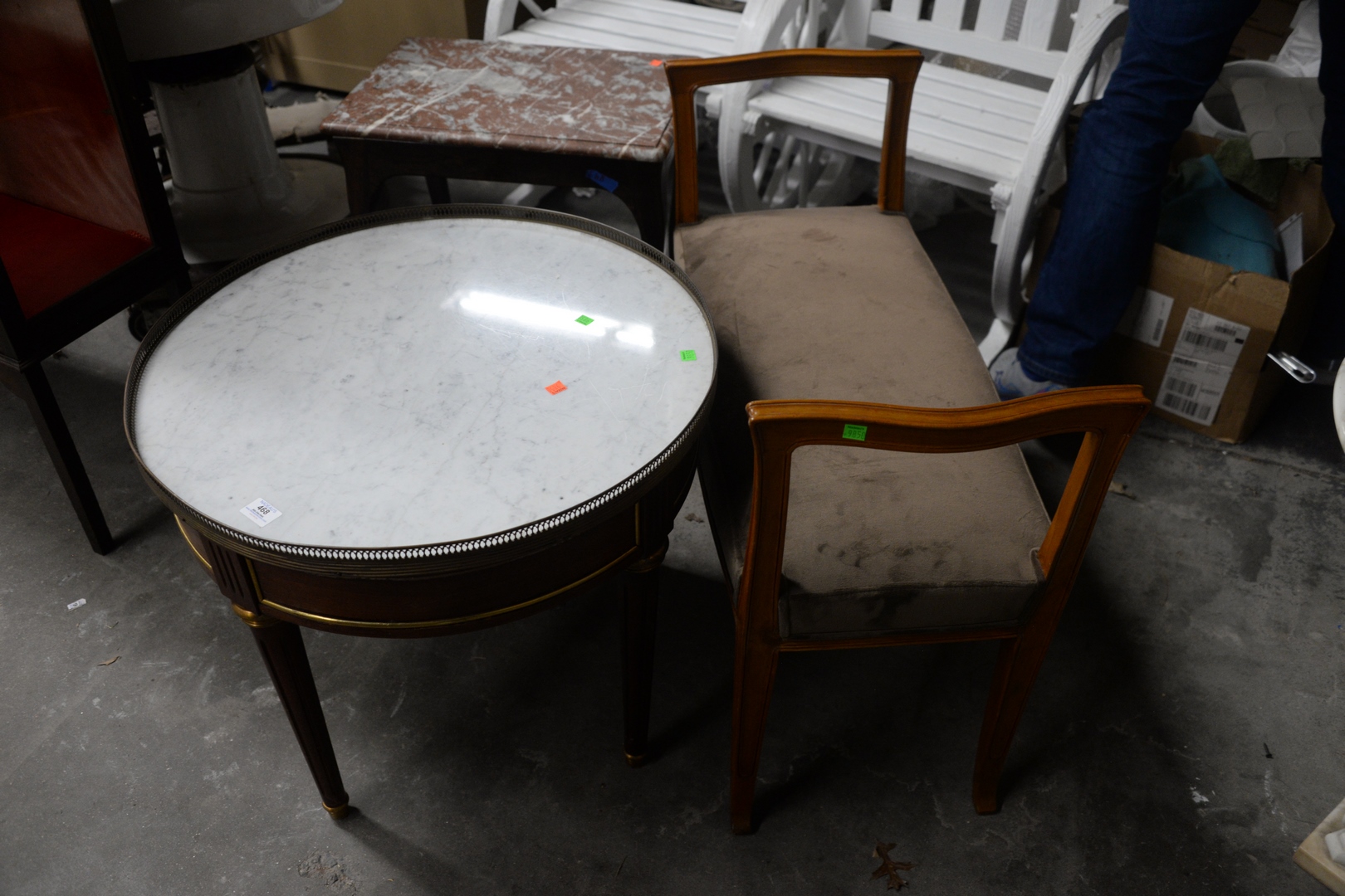 Lot 468: Three Piece Lot, to include a rosewood Louis XV style table, having brown and white marble top, height 22 inches, top 15 x 21 1/2 and upholstered bench along with a Louis XVI style table having brass gallery, drawer, and marble top, height 28 1/2