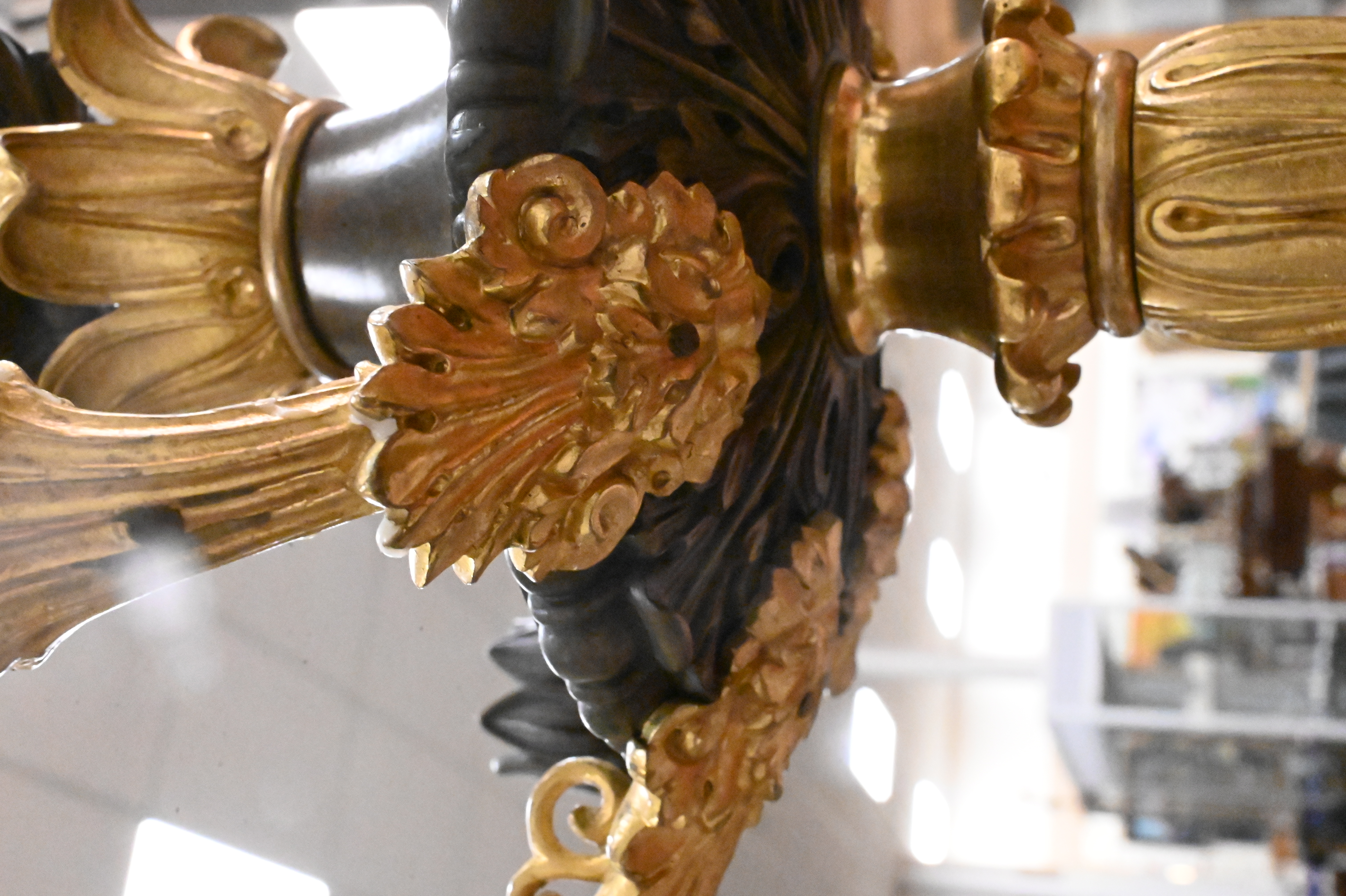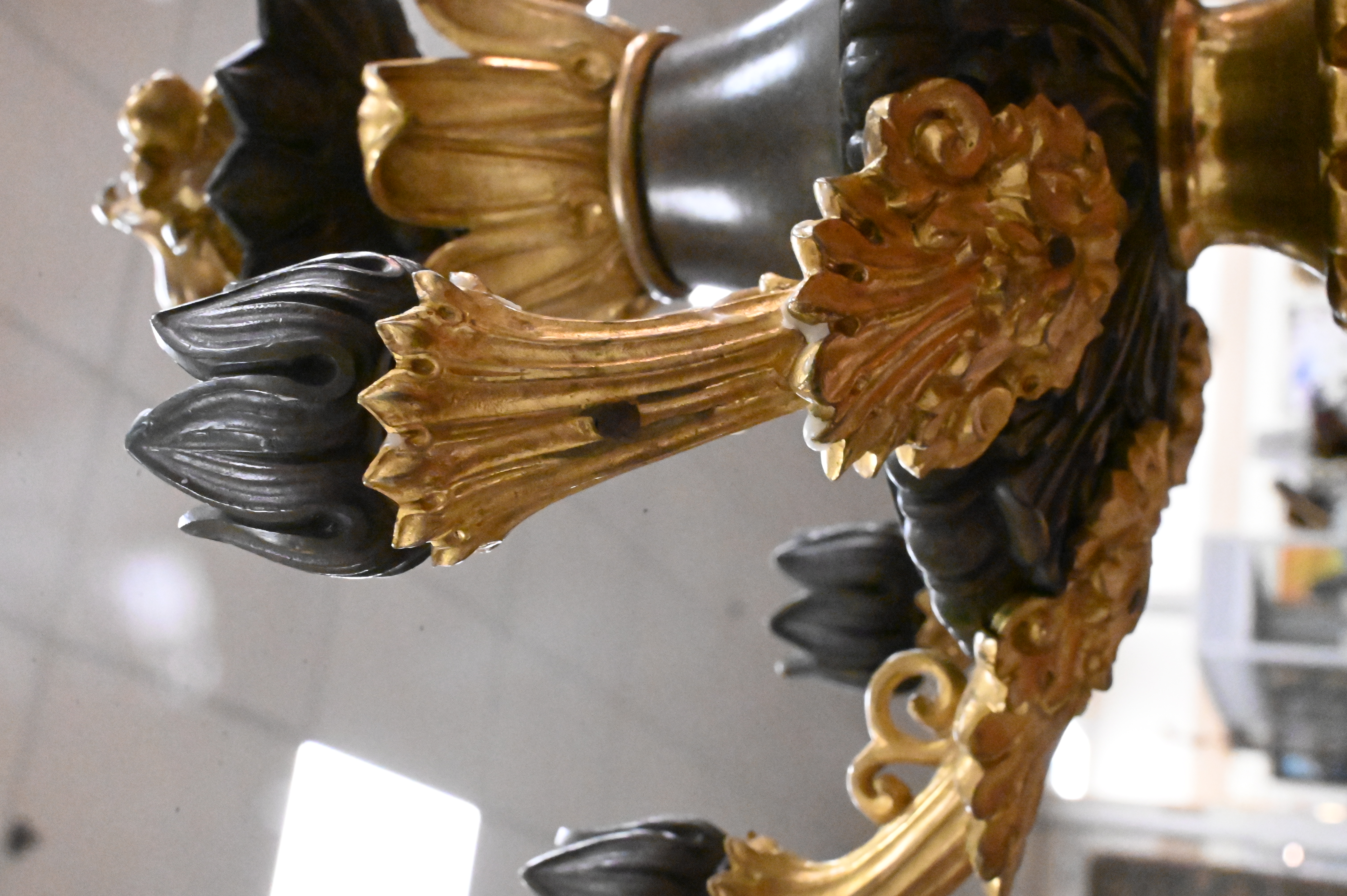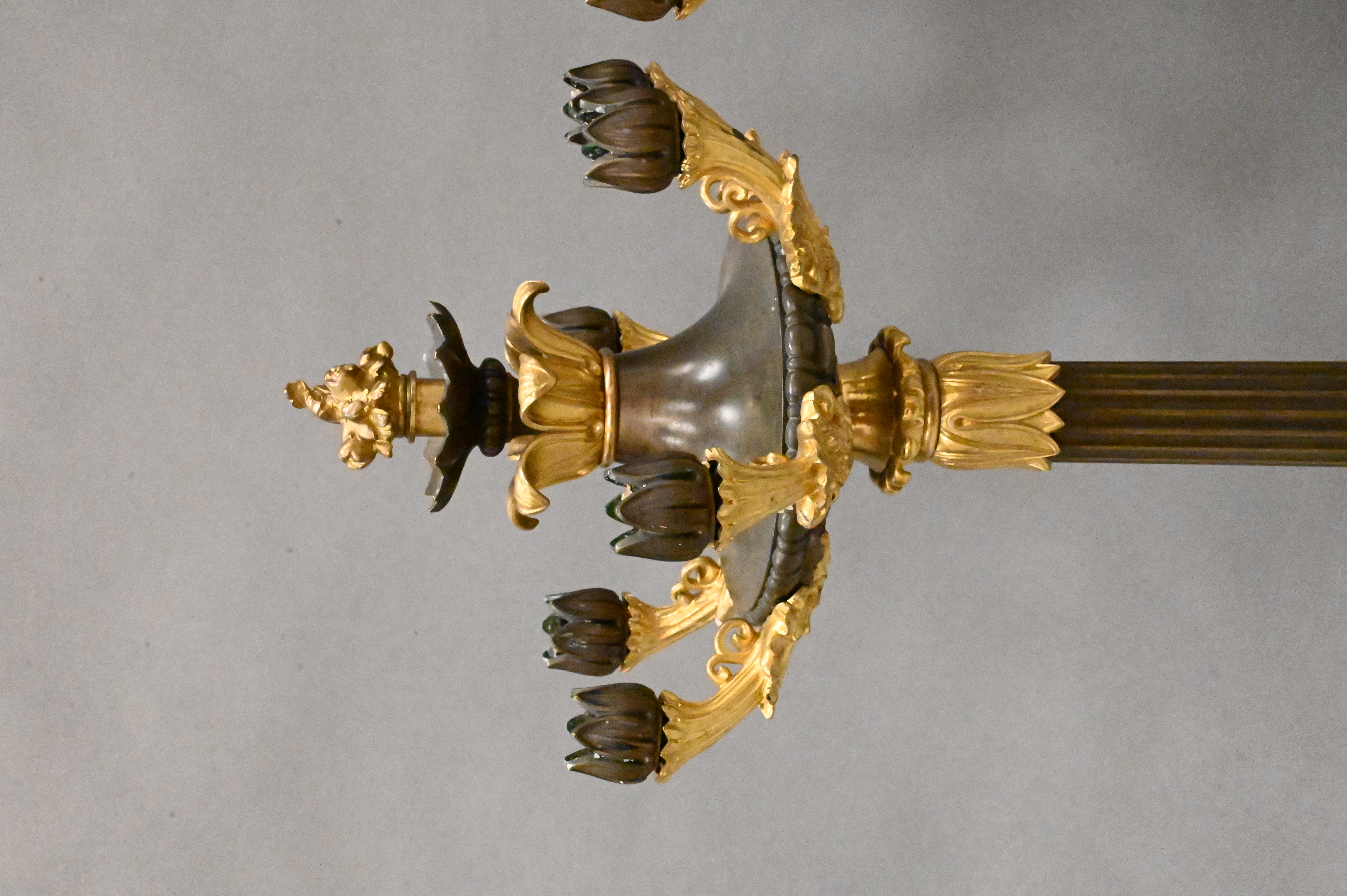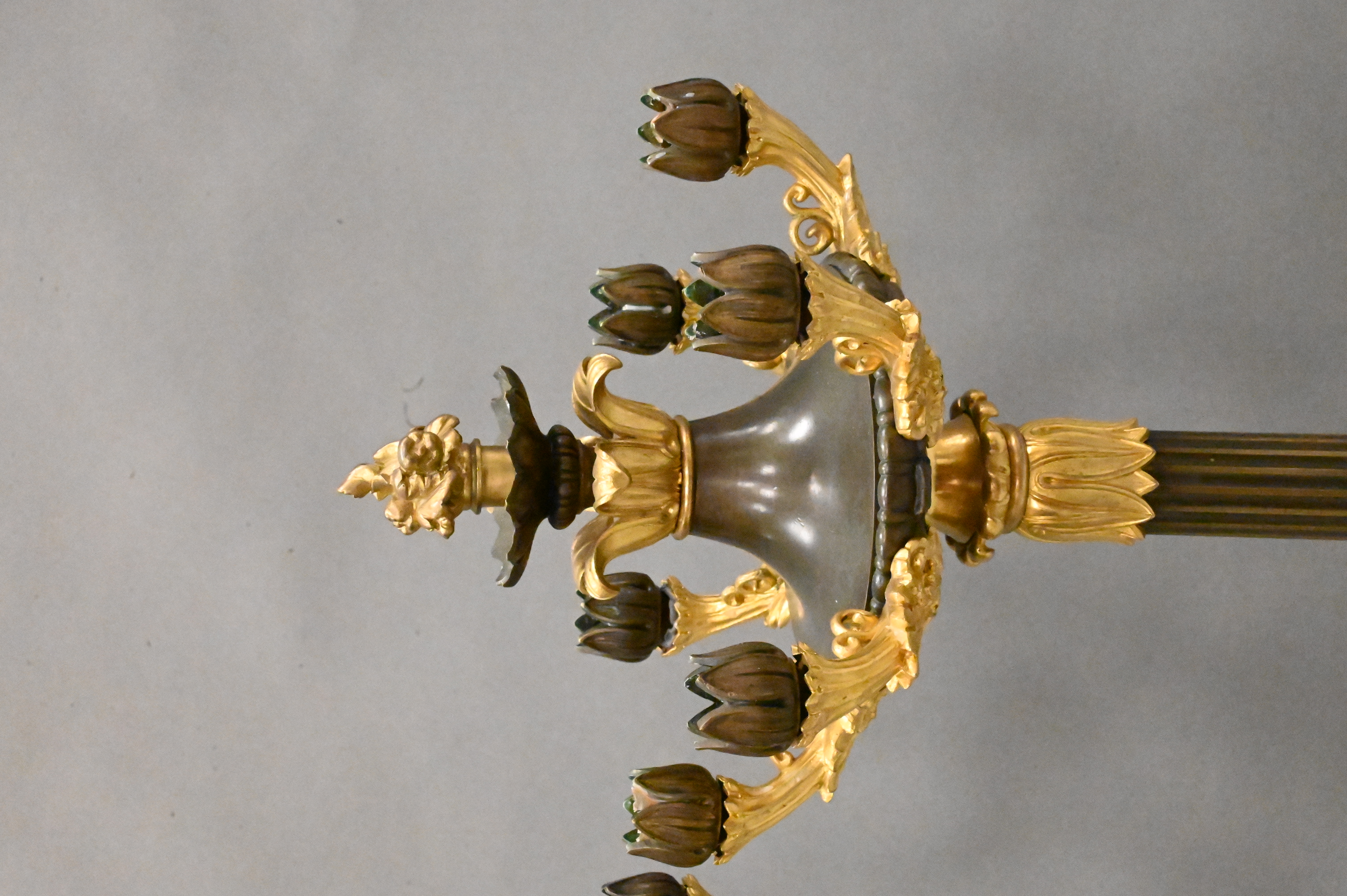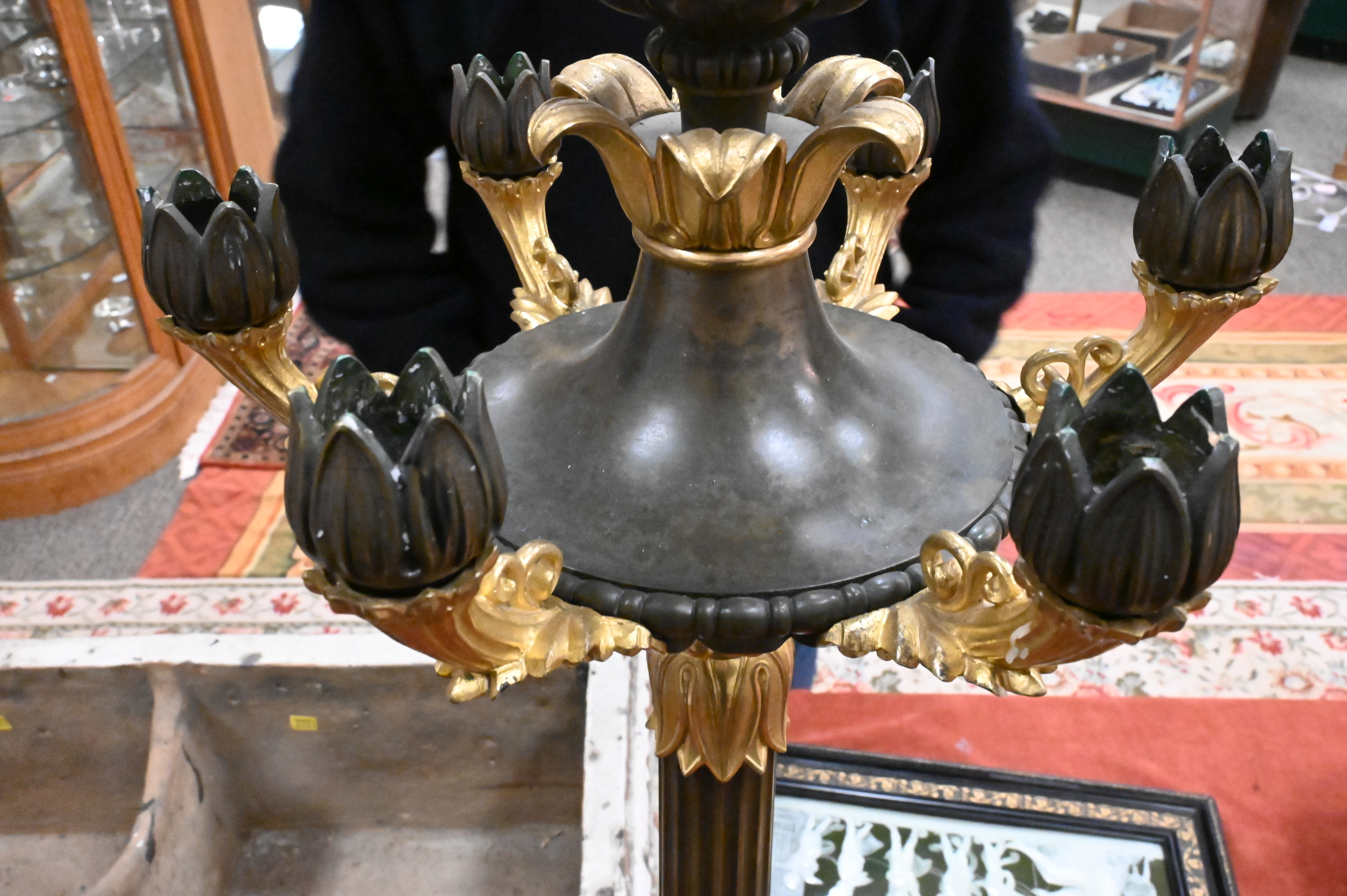 each with flame-form finial above six lotus leaf-molded candle arms, raised on a columnar standard and a tripartite base, 19th century