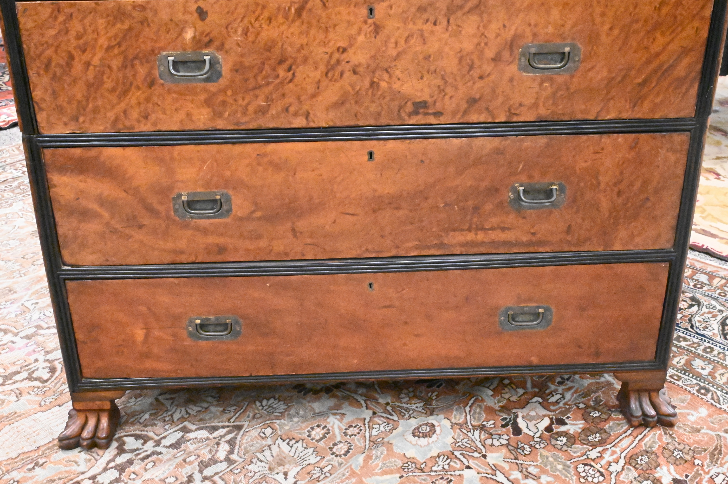 A handsome two-part campaign chest in richly figured burl walnut veneer with ebonized banding, fitted with brass recessed campaign pulls and side carrying handles. The upper section with two short drawers over a bank of four medium drawers, the wide central drawer with a hinged drop-front revealing a fitted writing desk interior. The lower section with two long drawers, the case raised on bold carved paw feet. Classic portable construction and design consistent with 19th-century English campaign furniture.