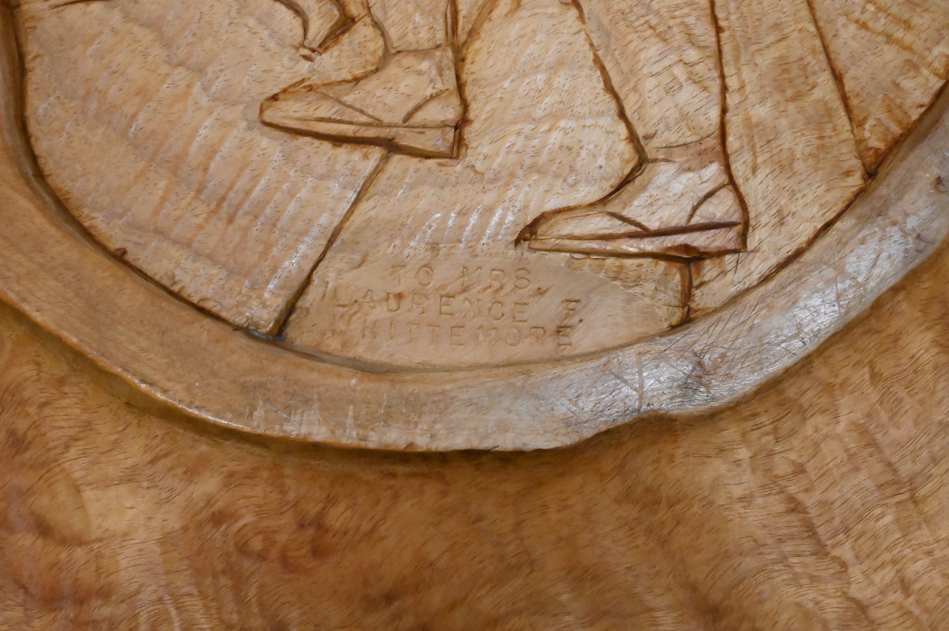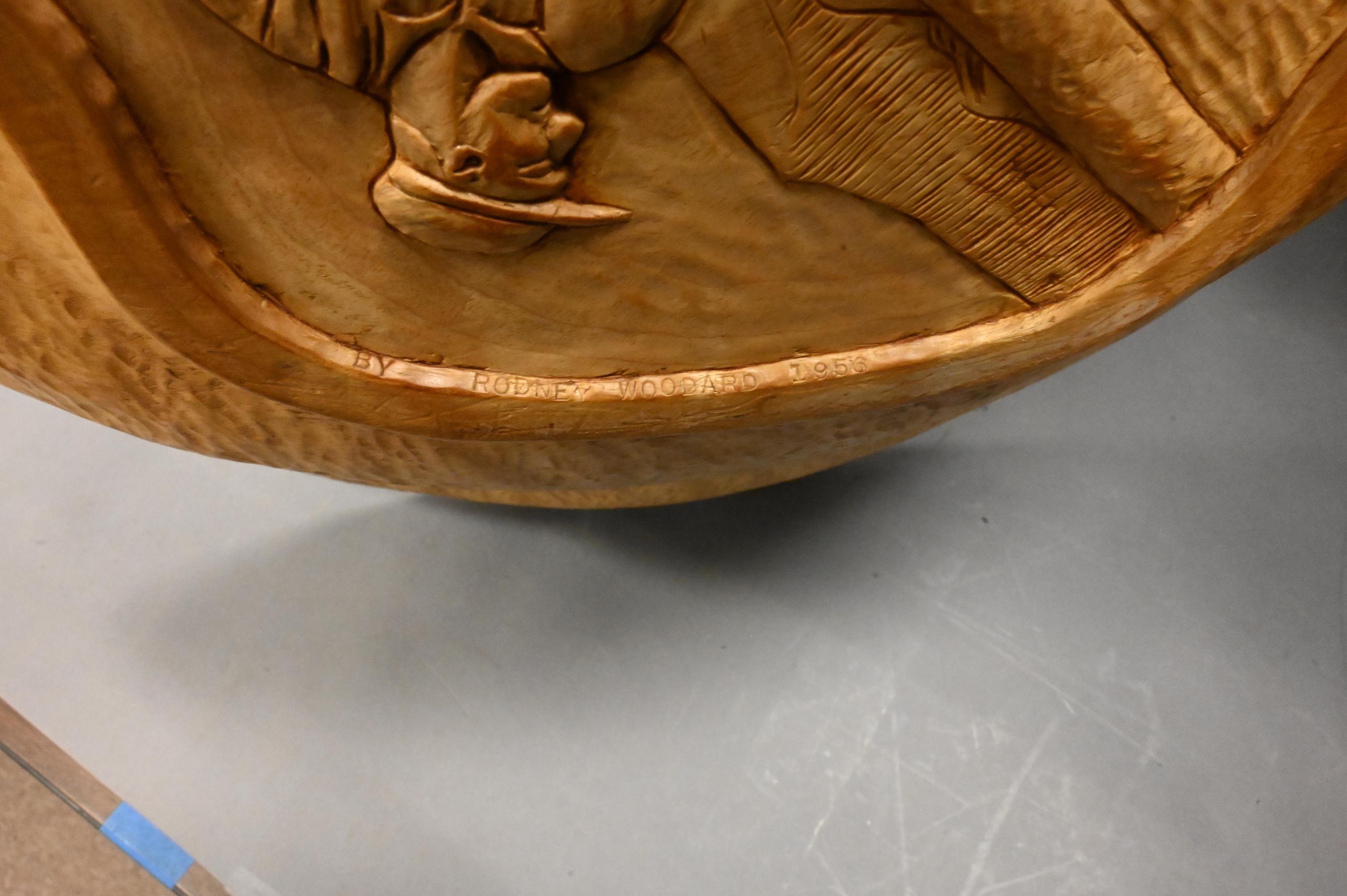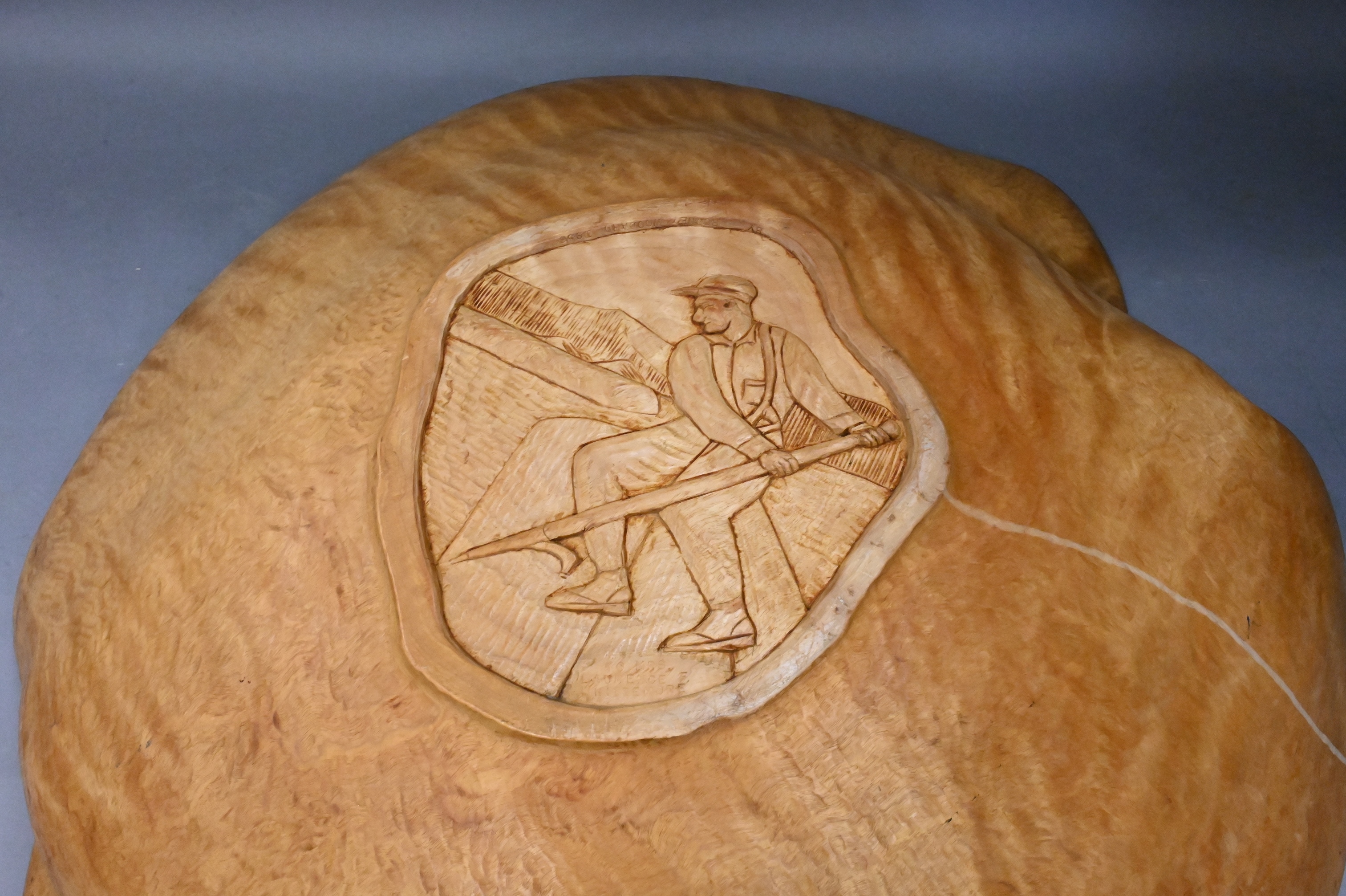 bottom carved with man holding logging pick, signed and dated on base