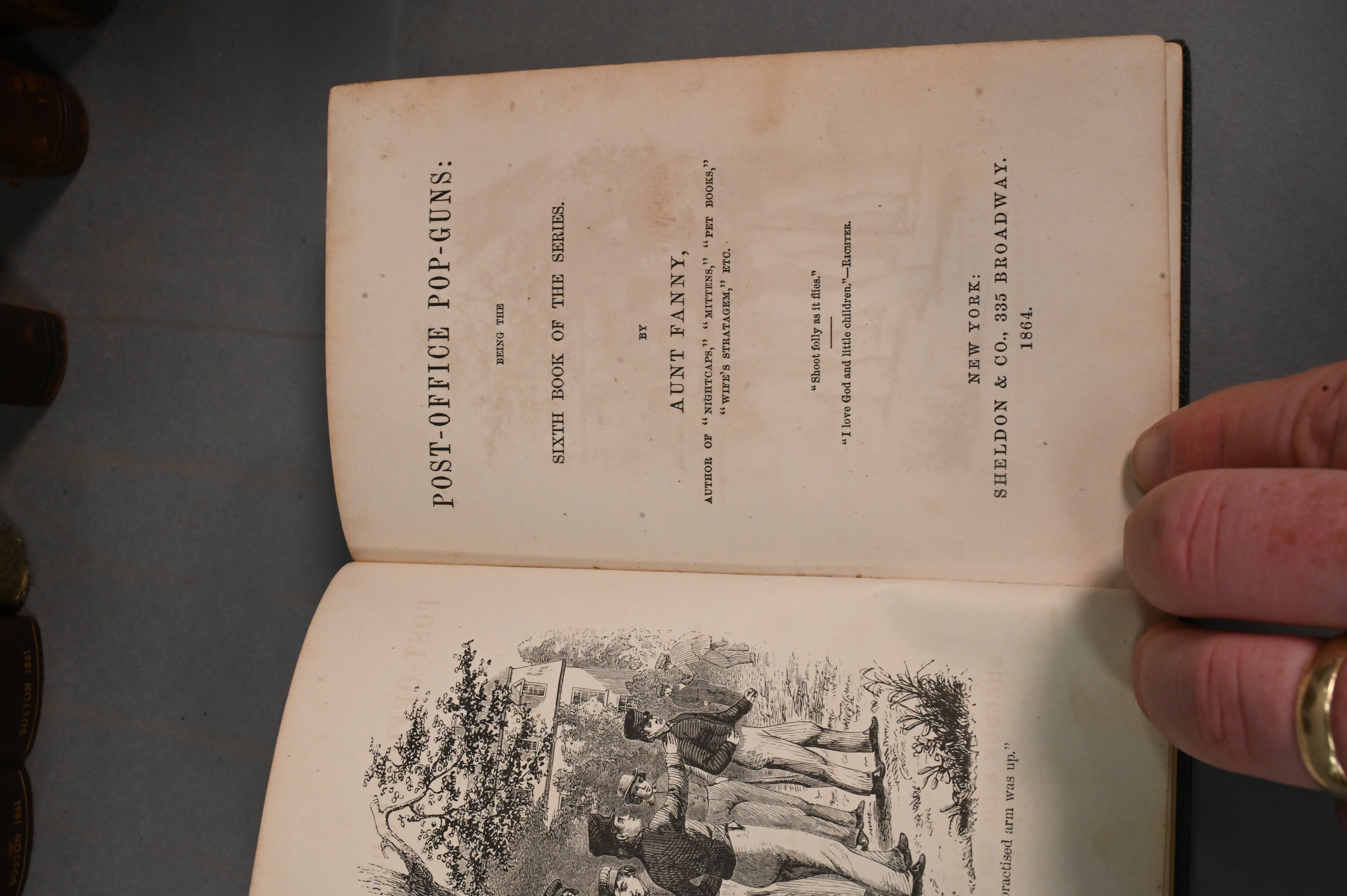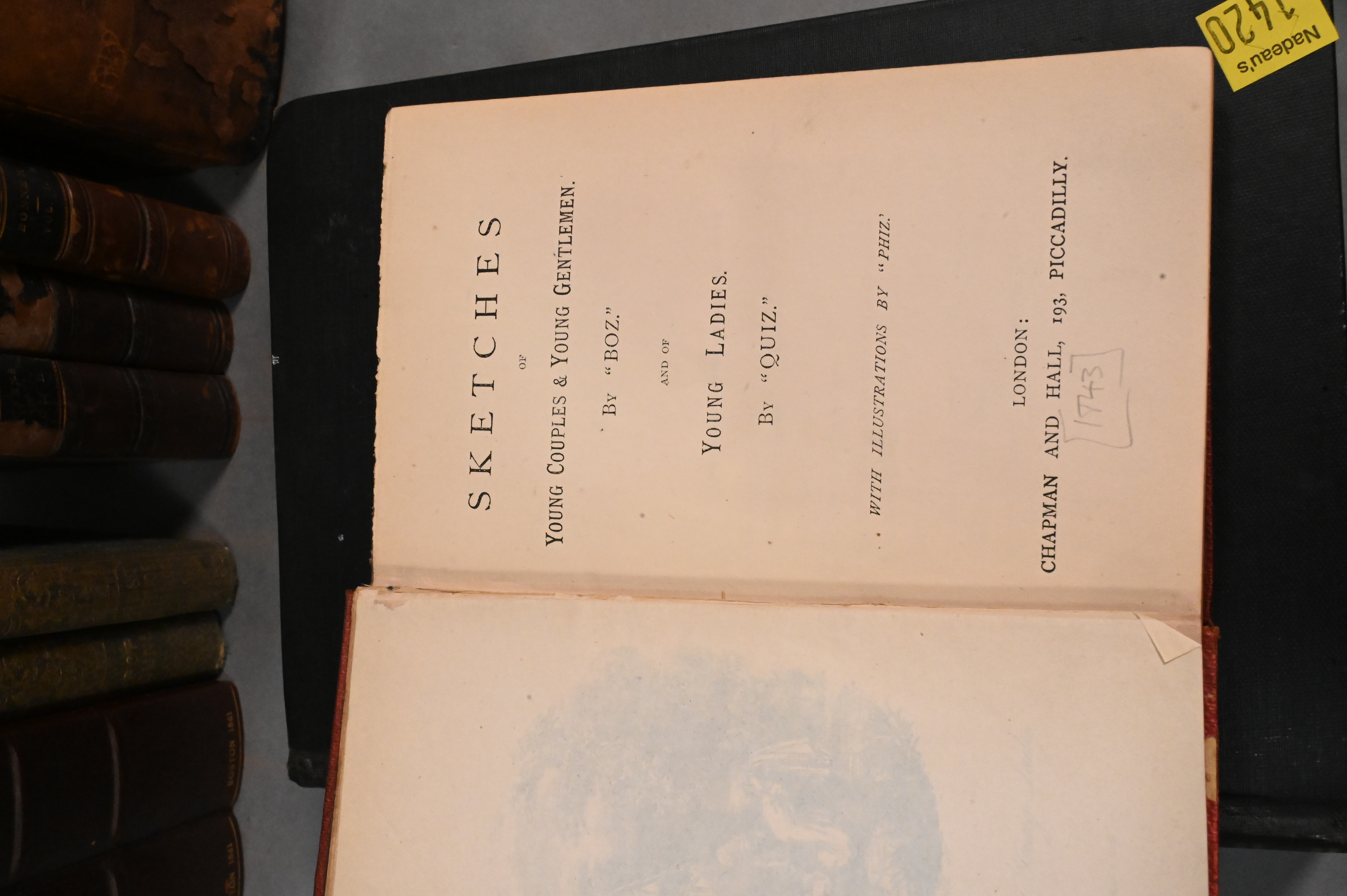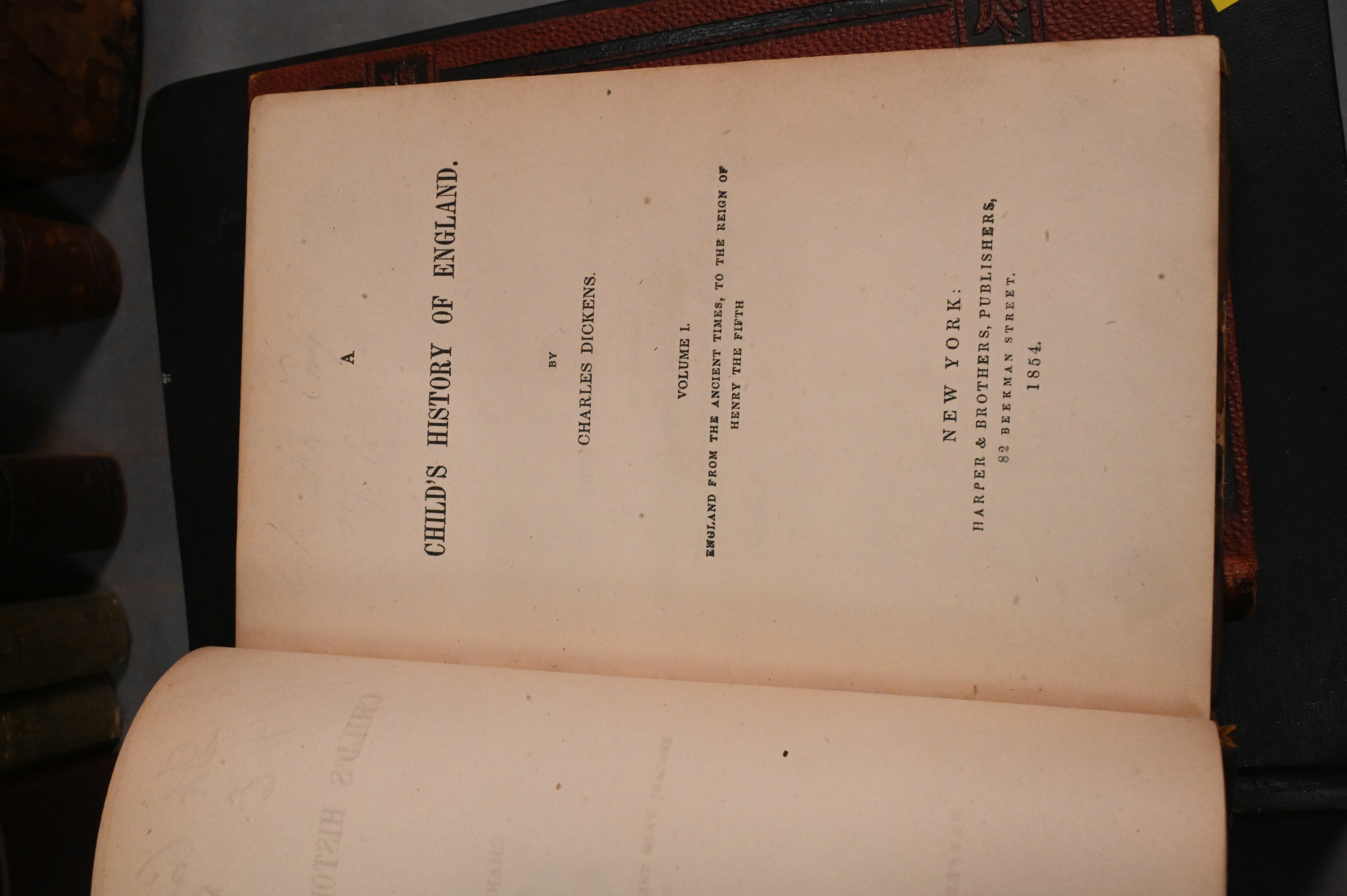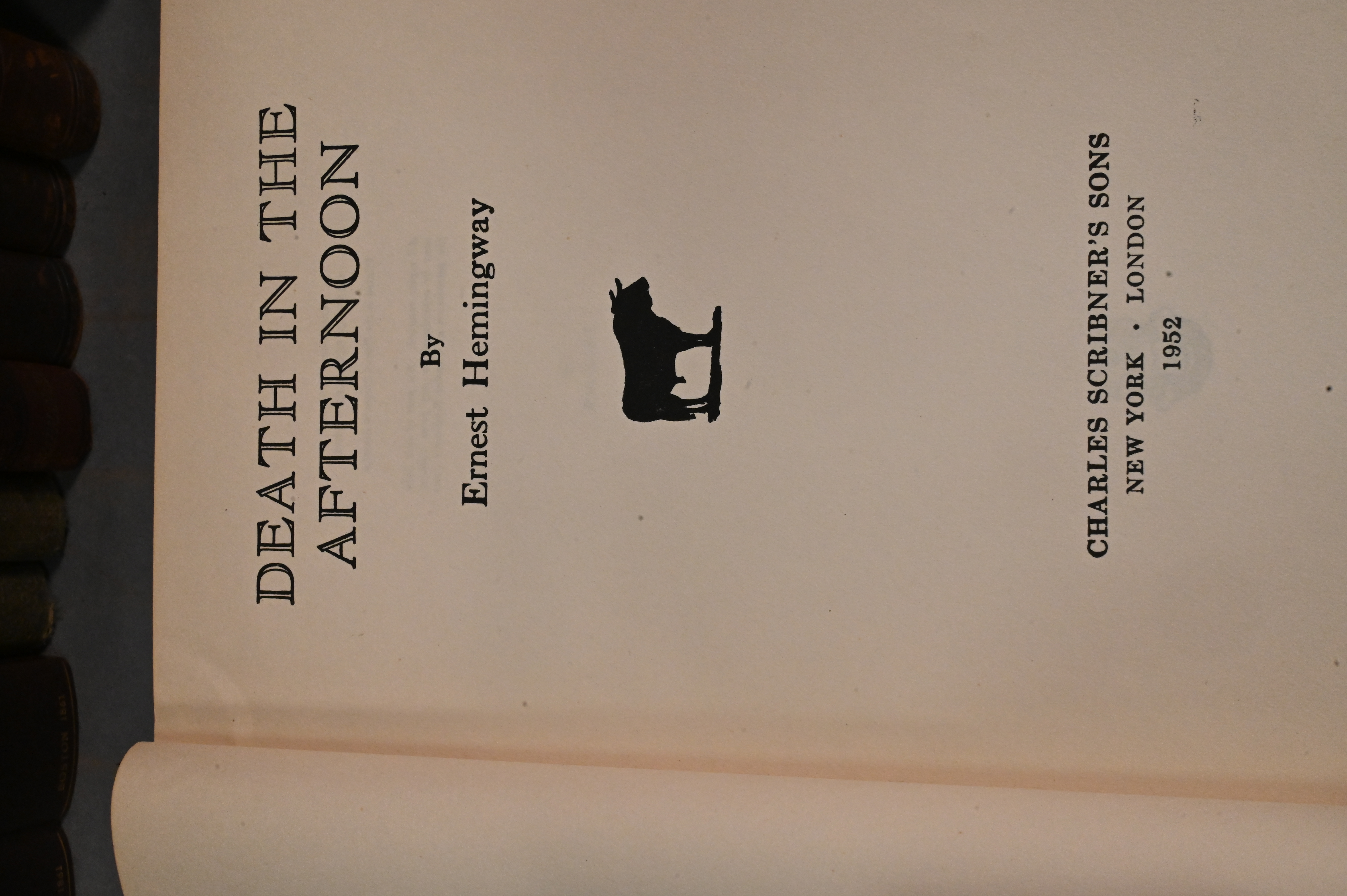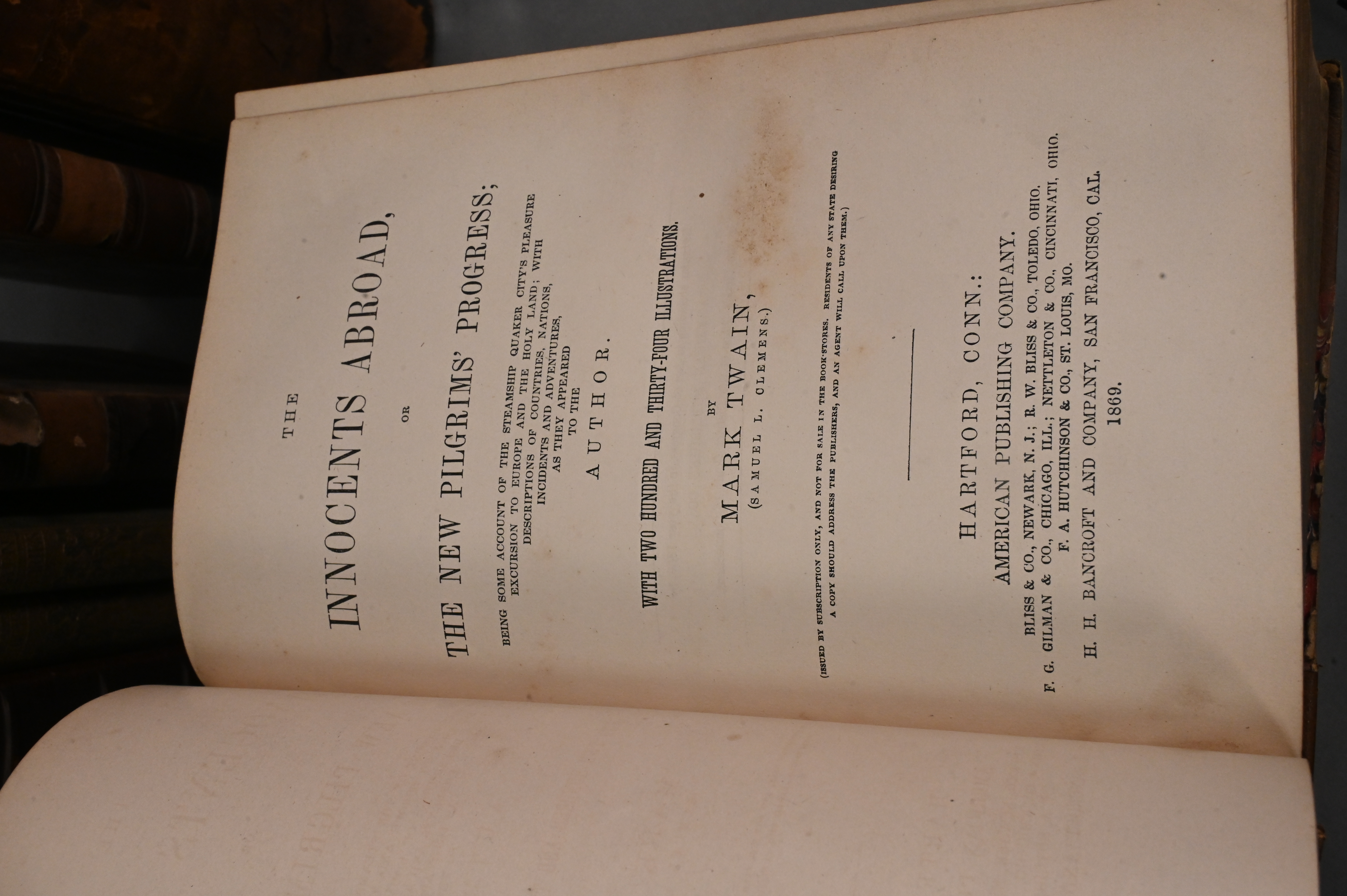Eleven Classic Books, to include Mark Twain’s 1869 “Innocents Abroad”, Dicken’s “Sketches of Young Couples and Young Gentlemen”, two volumes of “Pop Gun Series, by Aunt Fanny, published in 1864, Hemingway’s “Death in the Afternoon” published in 1952, two volumes of Oliver Wendell Holmes “A Romance of Destiny”, along with two volumes of Dicken’s “Childs History of London” and Bonner’s “Childs History of the United States”, Provenance: Estate of Cyril H. Moore Jr, Kent, Connecticut.