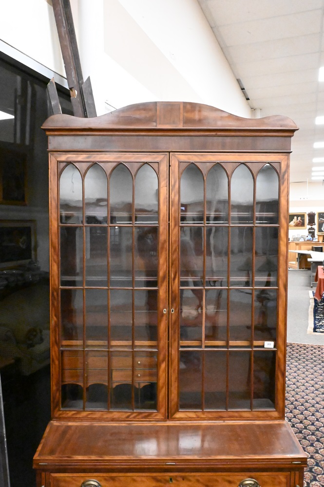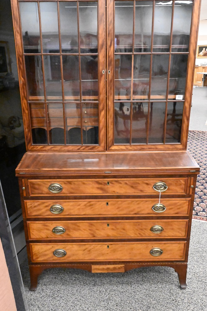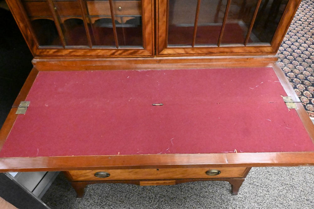 Lot 469: Federal Mahogany Secretary Desk, in two parts, upper section with two glazed doors with birch trim on lower section, having flip writing surface over four drawers with birch fronts, all set on French feet, circa 1800, height 86 1/2 inches, width 39 1/2 inches.