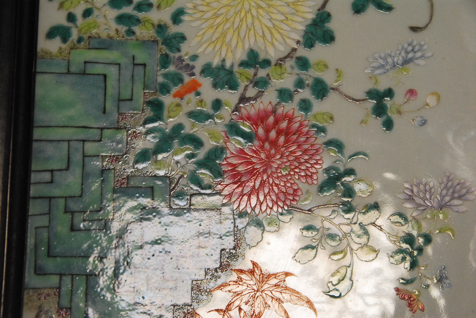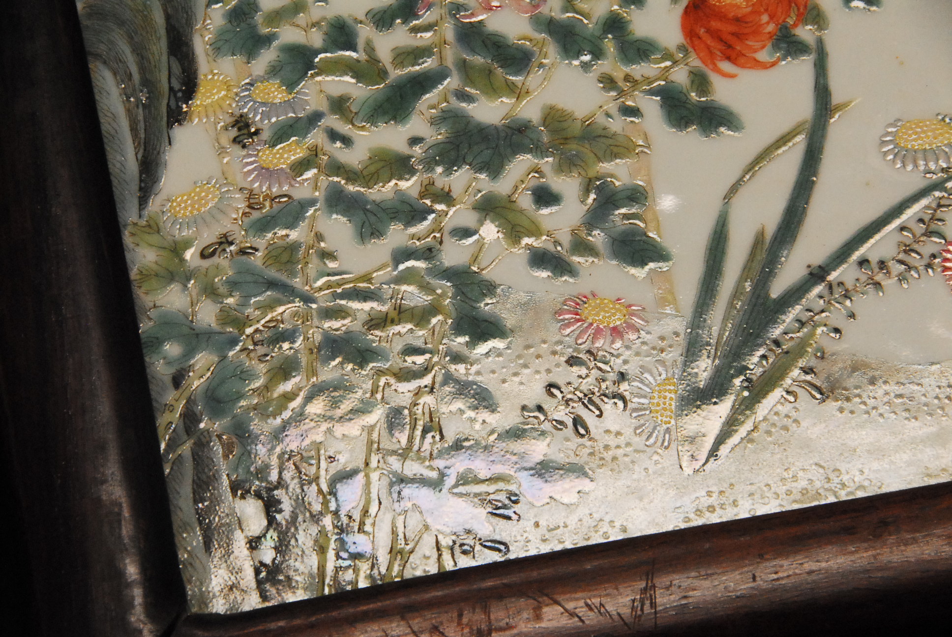 Pair of Famille Rose porcelain plaques, both of wild flowers and birds, 16 x 10.