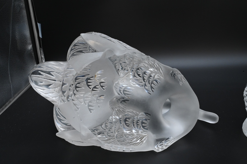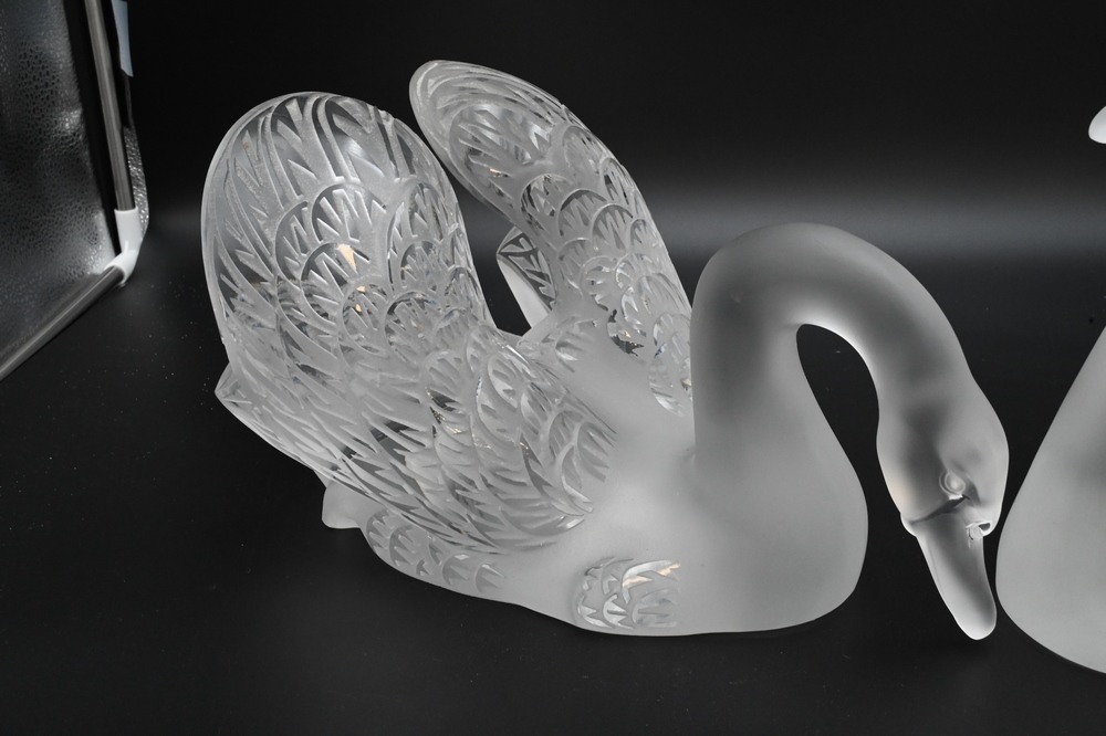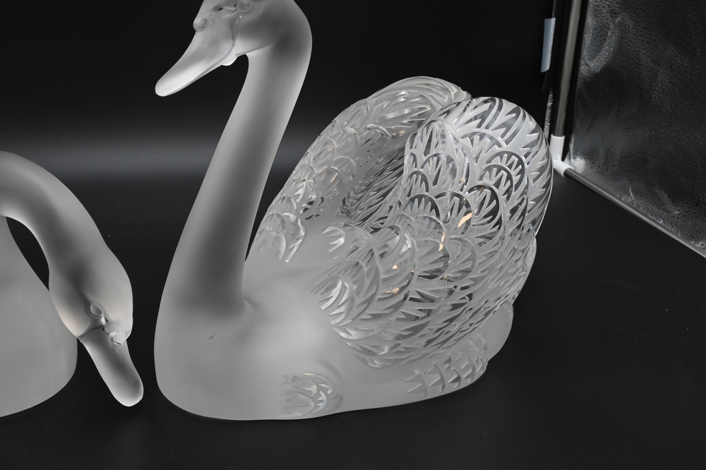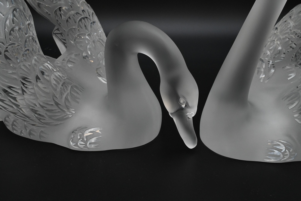 Pair of Lalique Molded and Frosted Swans, one with head down, one with head up, each signed in script Lalique France, lengths 15 and 13 inches.