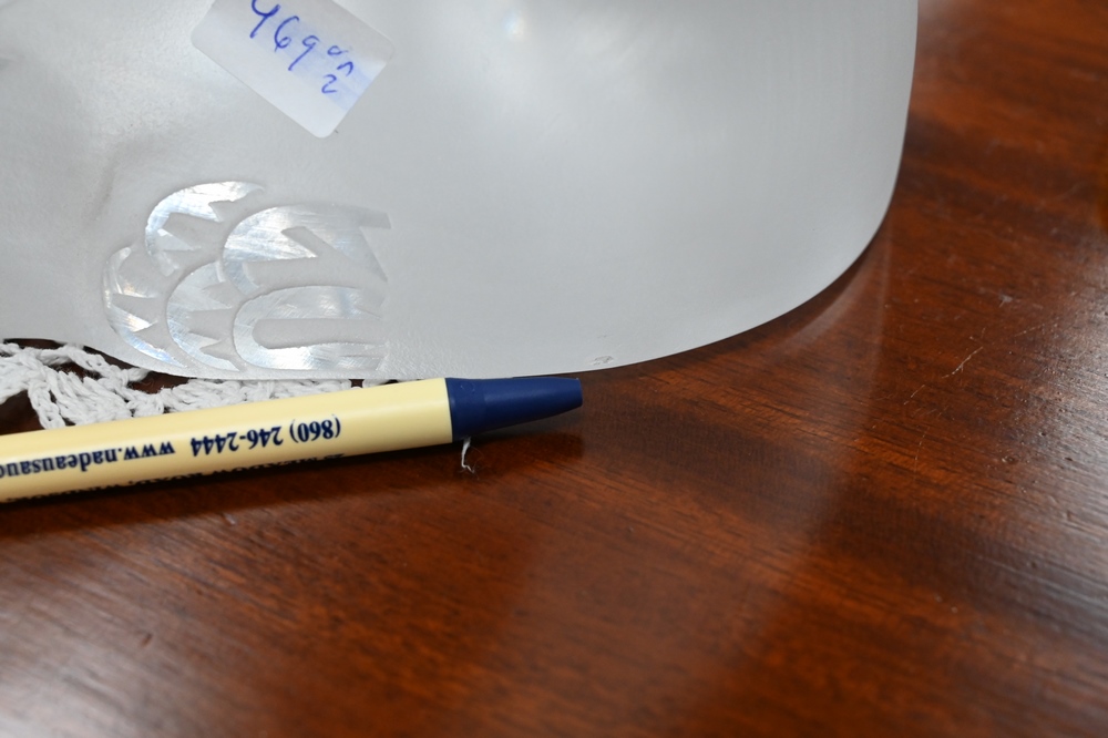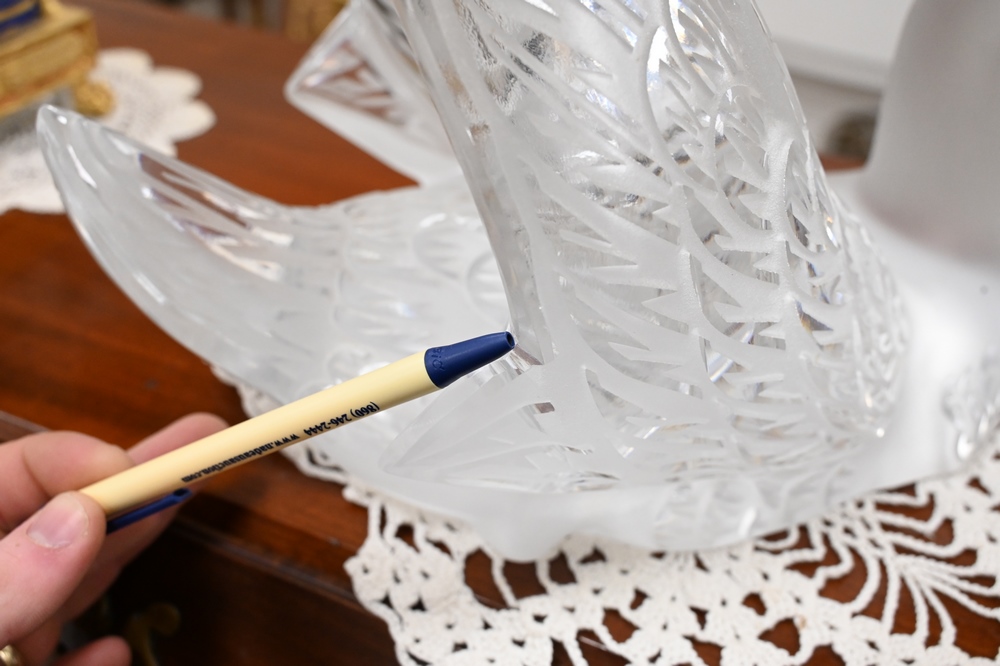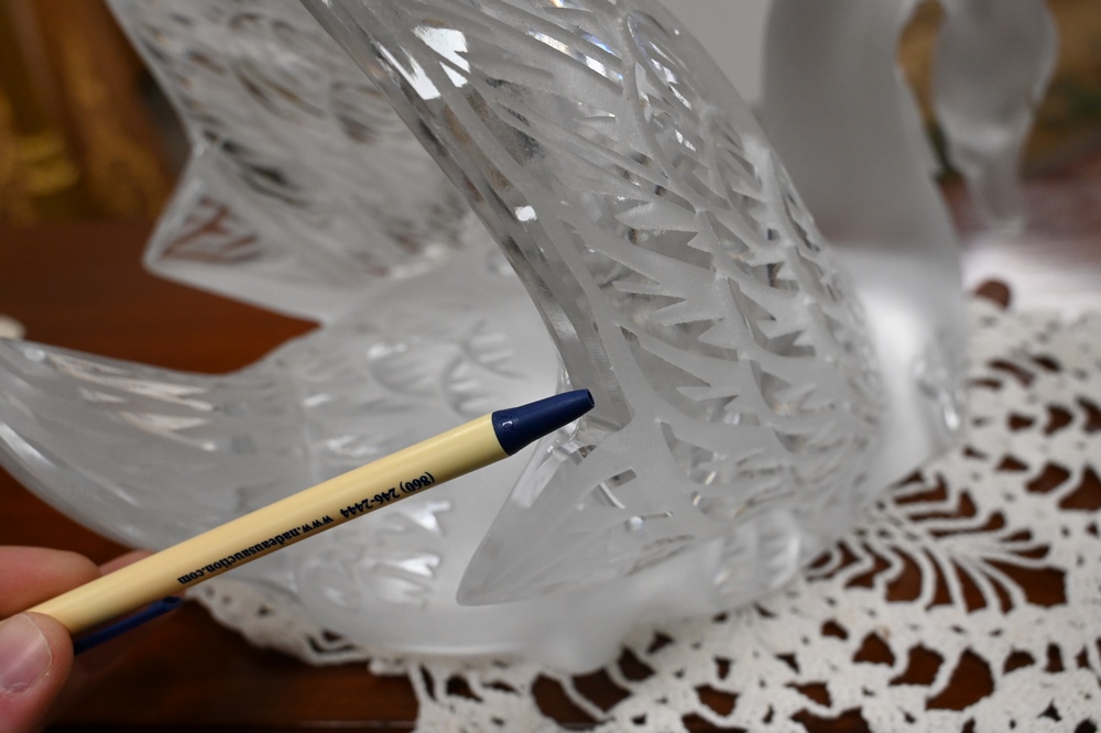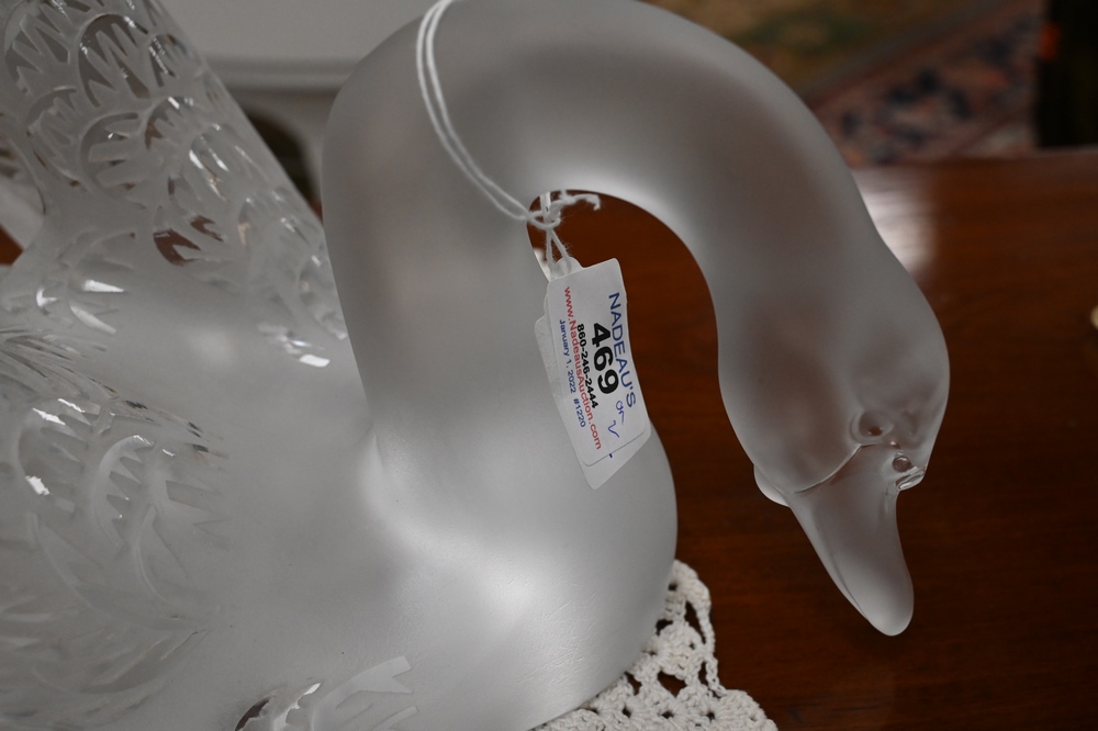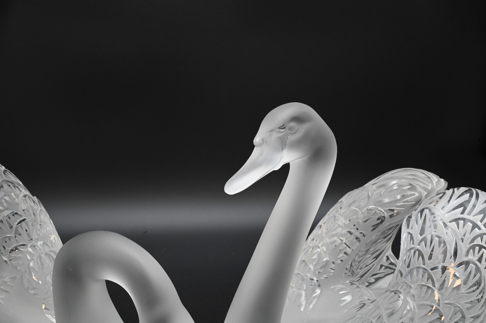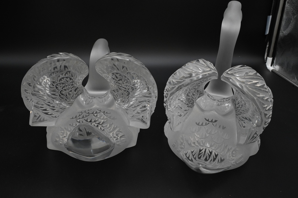 Lot 469: Pair of Lalique Molded and Frosted Swans, one with head down, one with head up, each signed in script Lalique France, lengths 15 and…