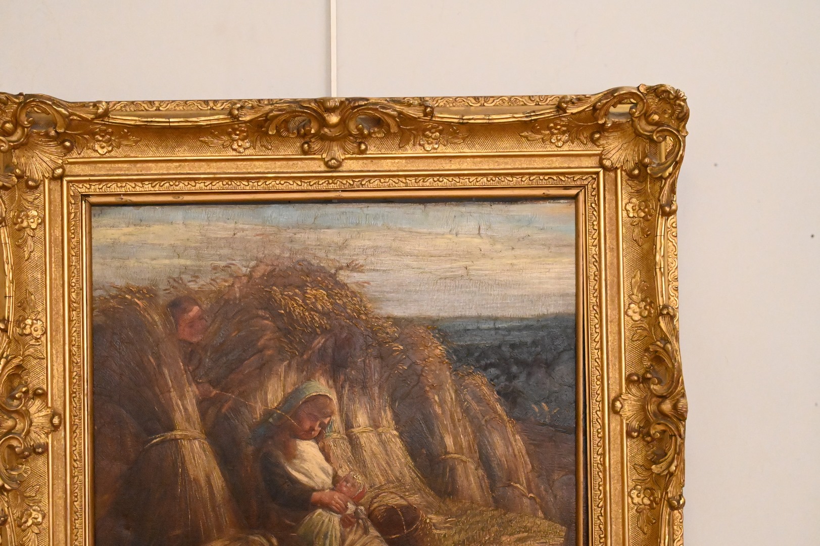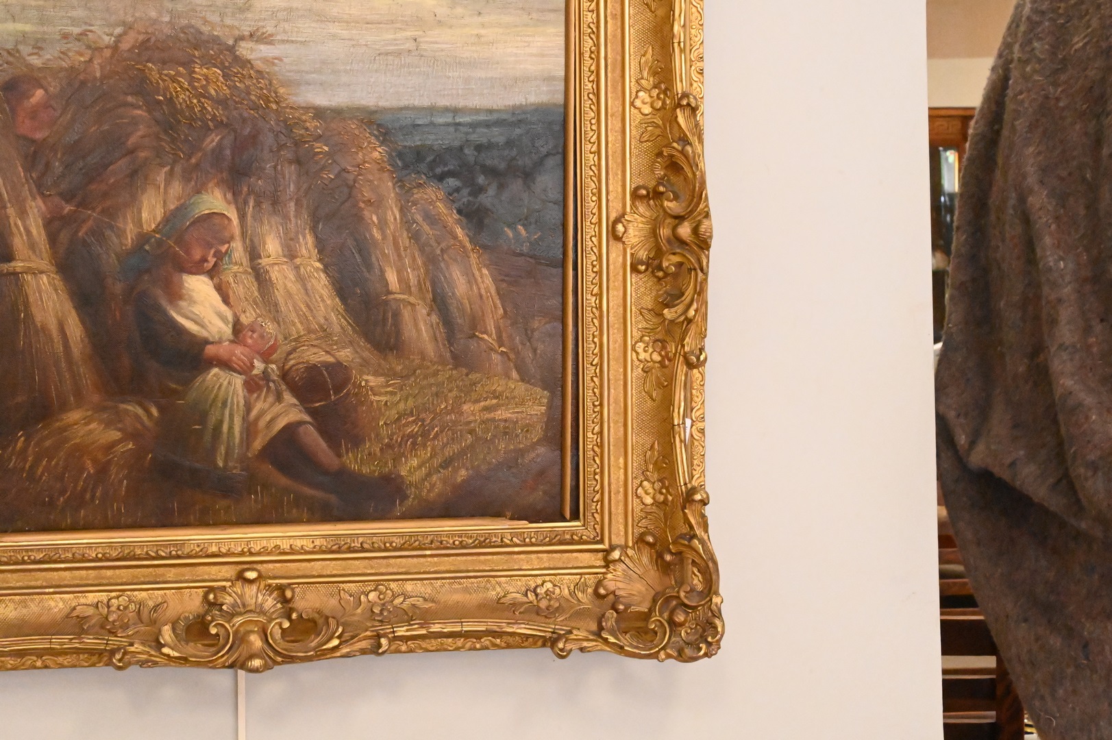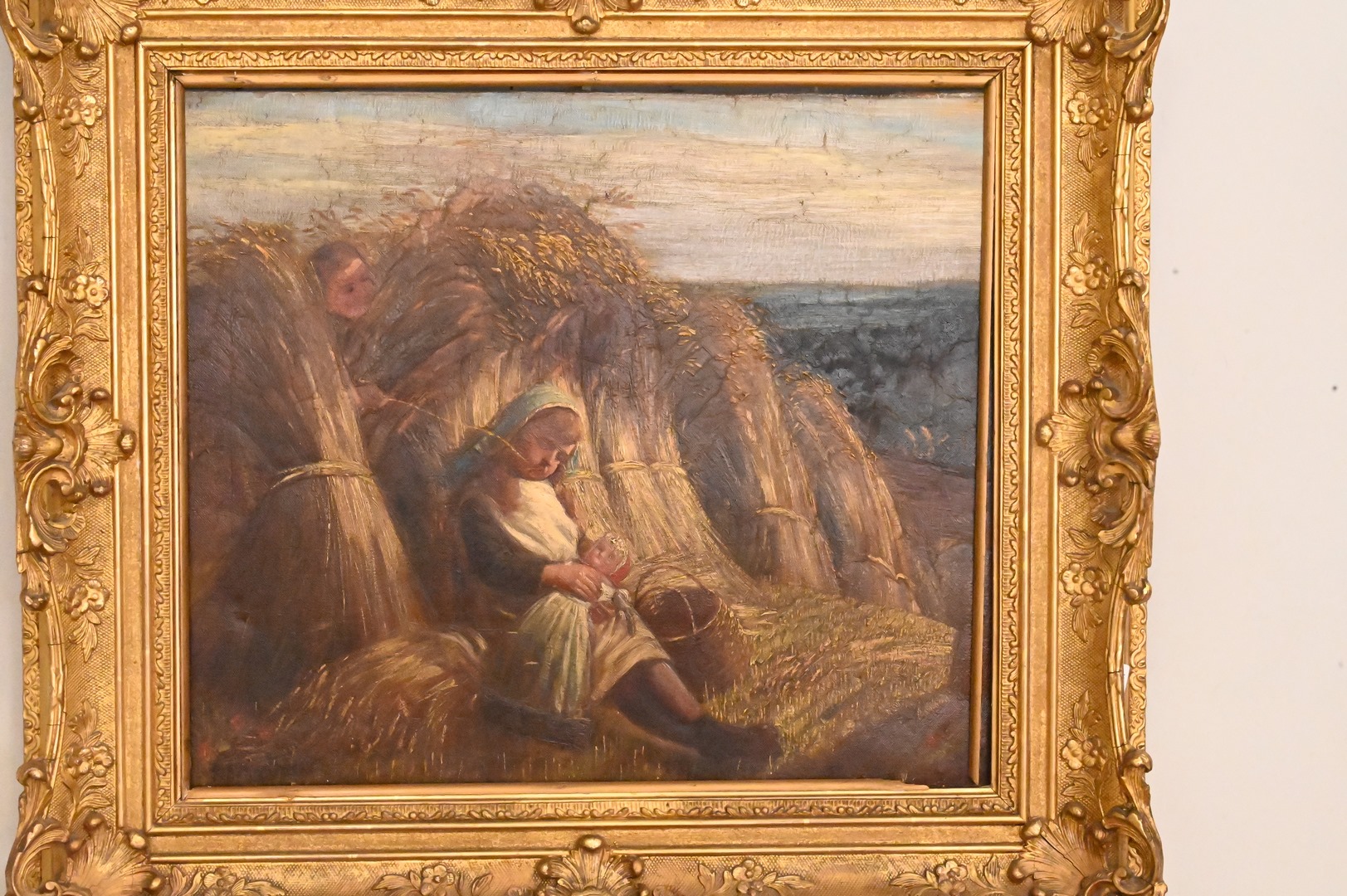 Robert Braithwaite Martineau (United Kingdom, 1826 – 1869), oil on canvas, “In the Haystacks”, 20″ x 24 1/8″.